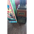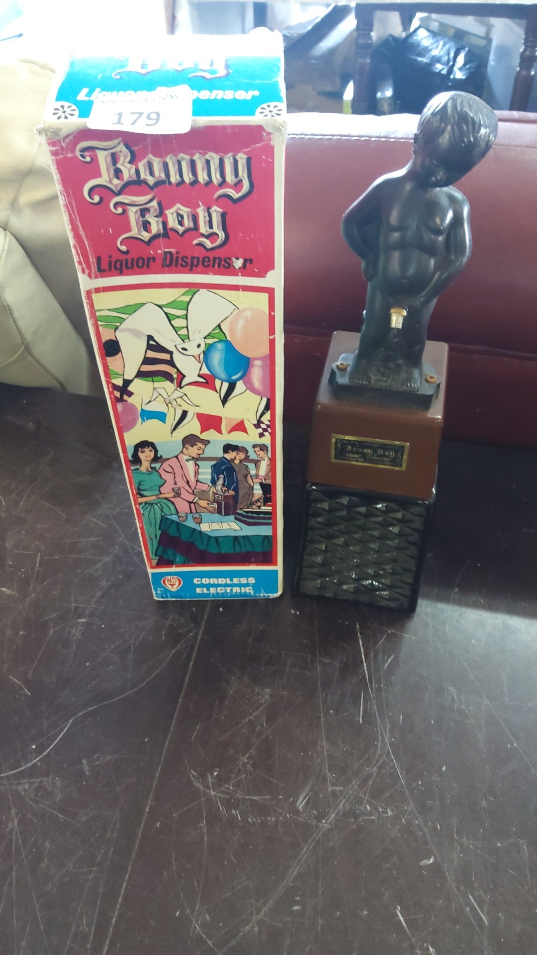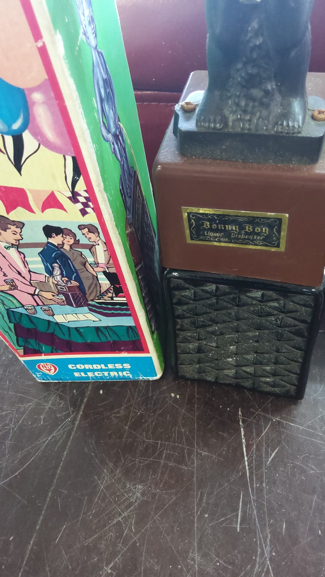 Bonny Boy liquor dispenser, moulded figural spout in black plastic above a brown rectangular reservoir with printed label and geometric-textured base; together with the original illustrated carton.