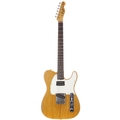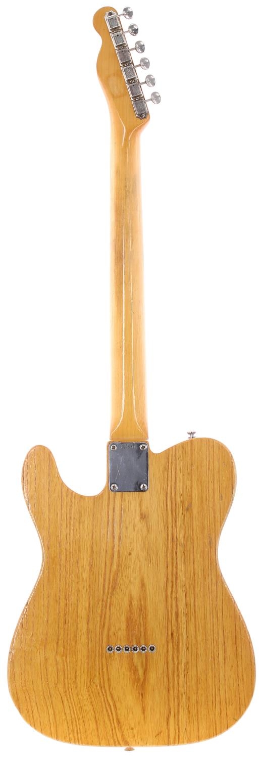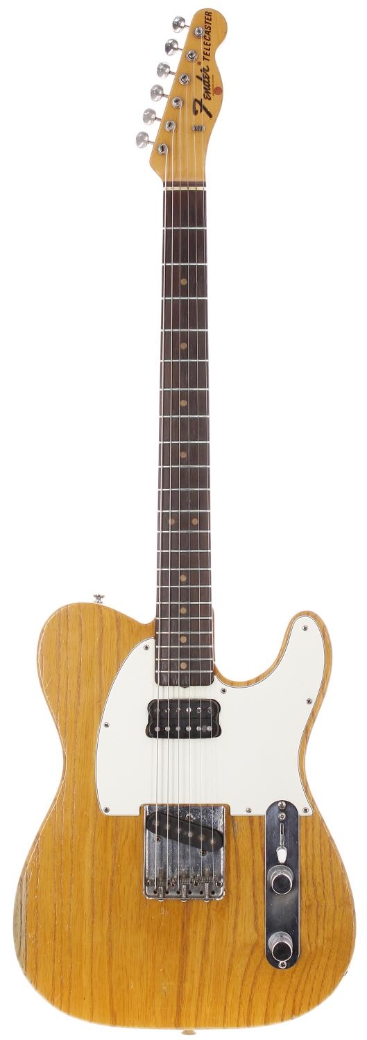 1964 Fender Telecaster electric guitar, made in USA; Body: natural refinish, arm wear to bass side top edge, various scratches and dings throughout, neck cavity enlarged to house humbucker pickup; Neck: refinished with original wear visible beneath new lacquer, replacement decal with large F slightly mispositioned; Fretboard: rosewood, groove wear to first position, wear continuing further up; Frets: worn; Electrics: working, replacement Gibson T top humbucker pickup to neck position, replacement potentiometers, bridge pickup appears original; Hardware: upper E and D tuners replaced, others appear original, tuner screws replaced, replacement strap buttons, replacement control plate screws, pickguard appears to be a replacement and cut to house humbucker pickup; Case: generic oblong case; Weight: 3.23kg; Overall condition: fair