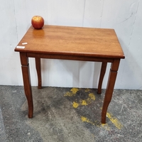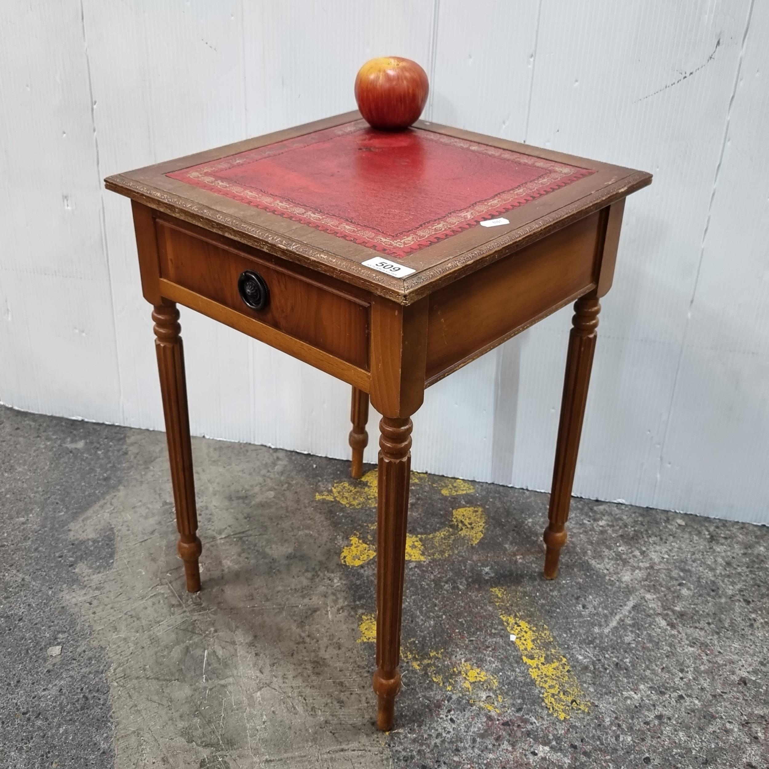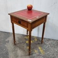 A Neatly proportioned occasional table with intricately designed red and gold skiver, reeded legs and a single ring-pull drawer.