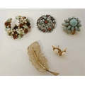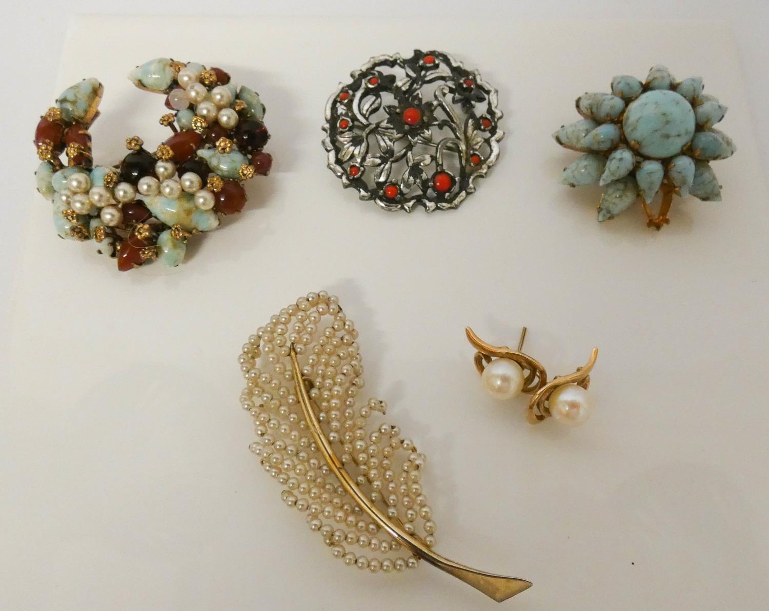 Seed pearl feather spray brooch on yellow metal, costume jewellery brooches and a pair of cultured pearl earrings mounted in 9ct gold