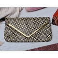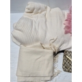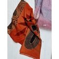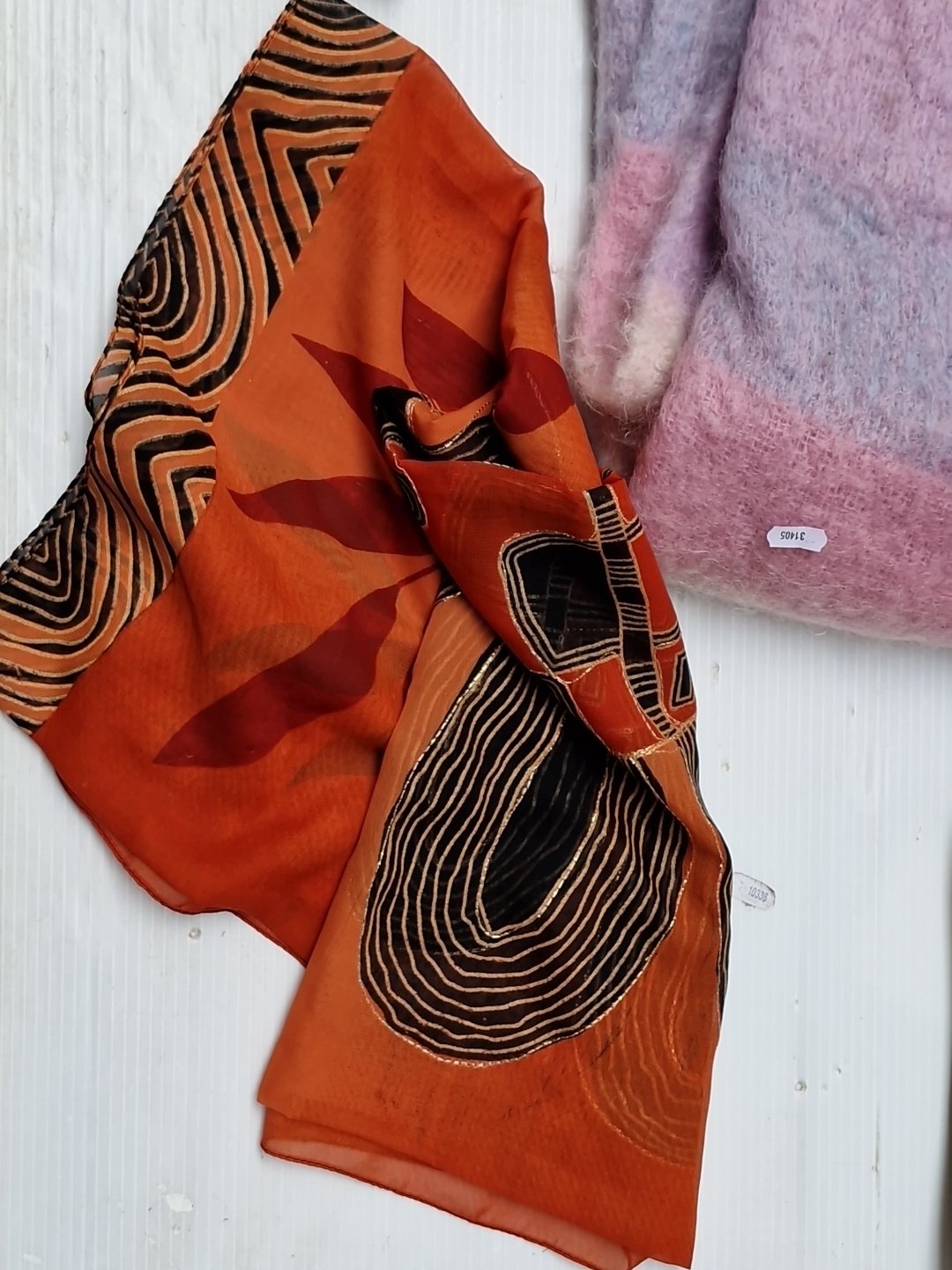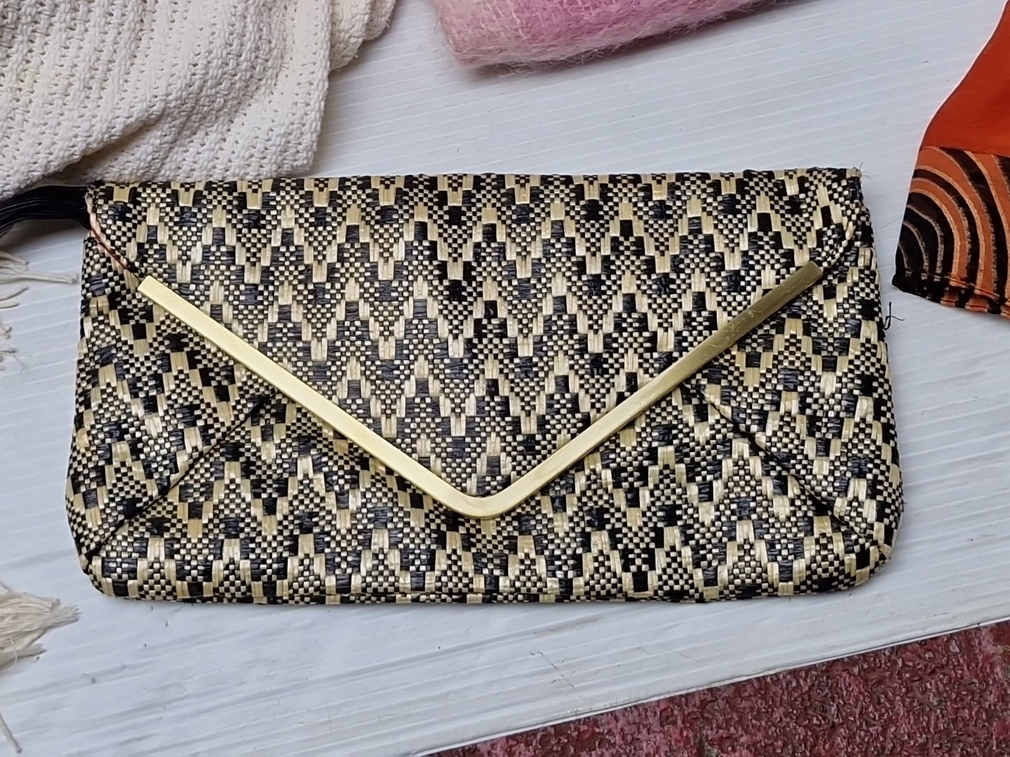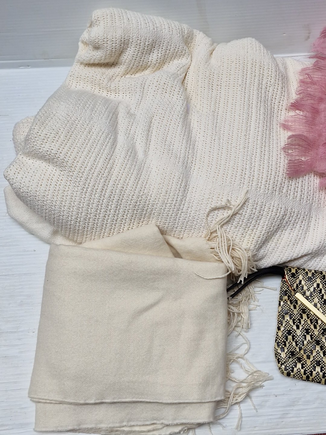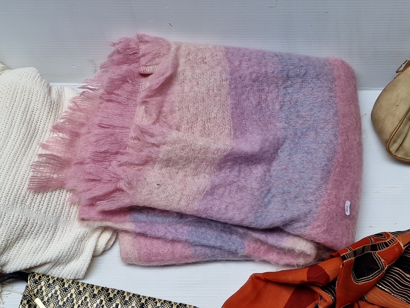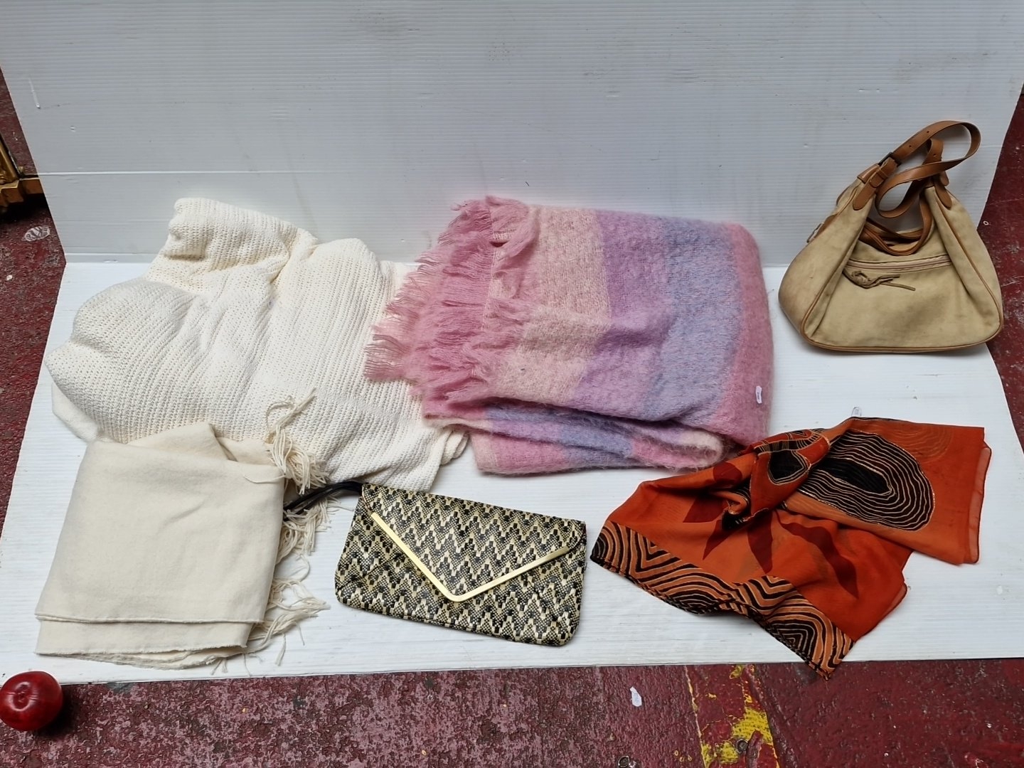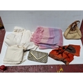 A group of assorted fashion accessories, including woven clutch bag with gilt-tone trim, beige shoulder handbag, orange patterned scarf, and two woven throws in cream and pink-lilac tones.