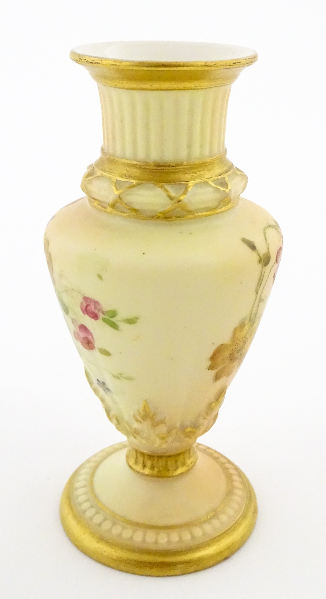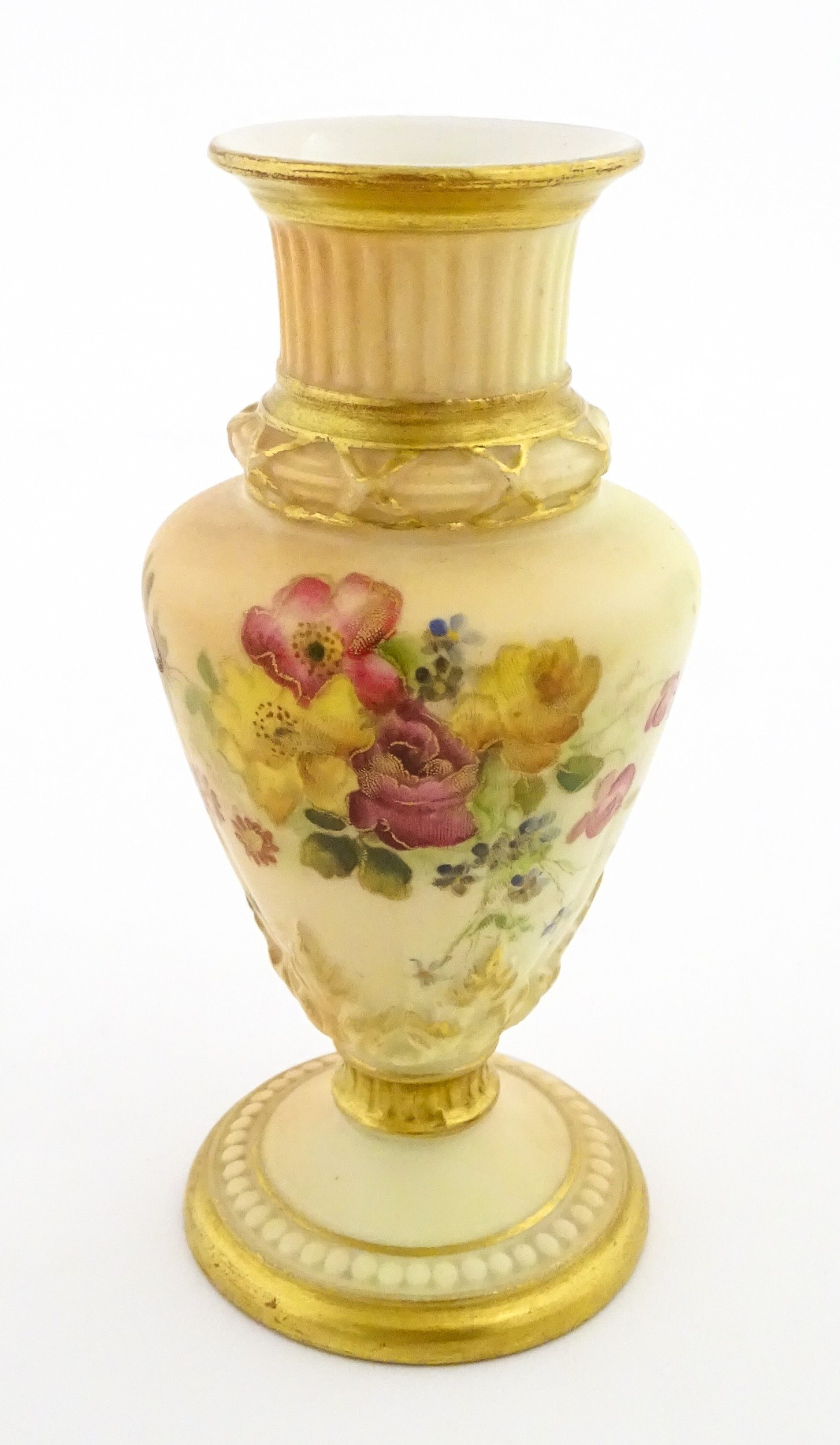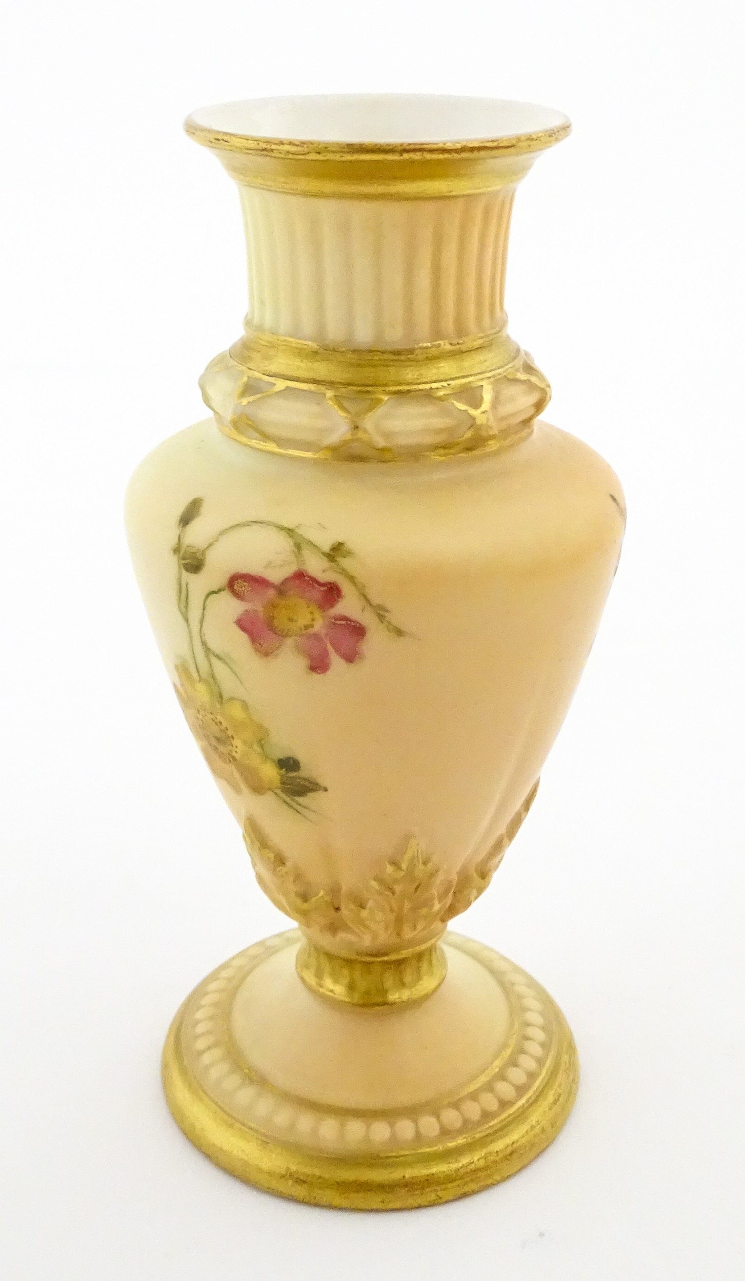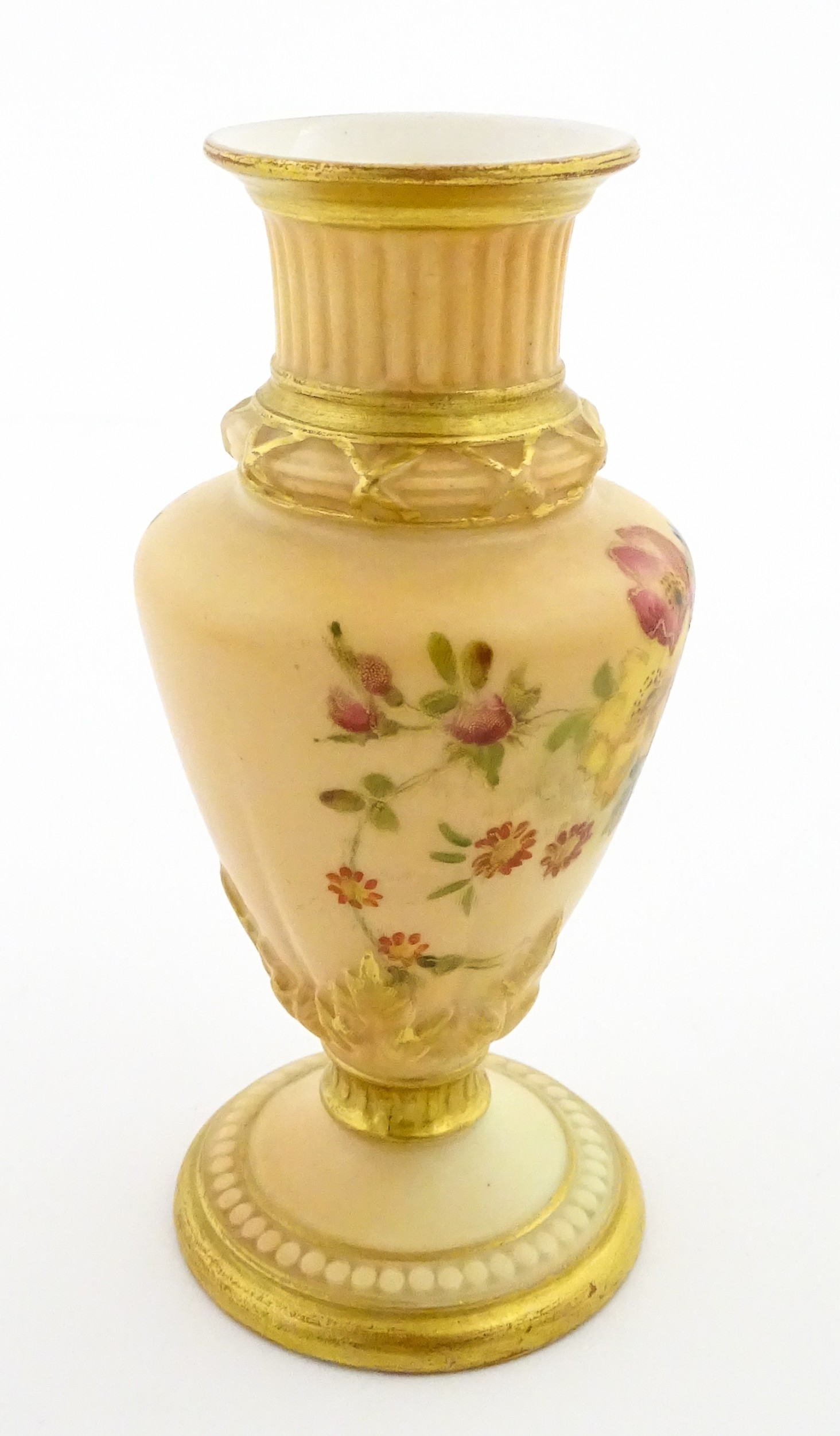 A Royal Worcester blush ivory pedestal vase decorated with flowers and foliage. Marked under 1730 with registered design no. 230700. Approx. 4 3/4" high