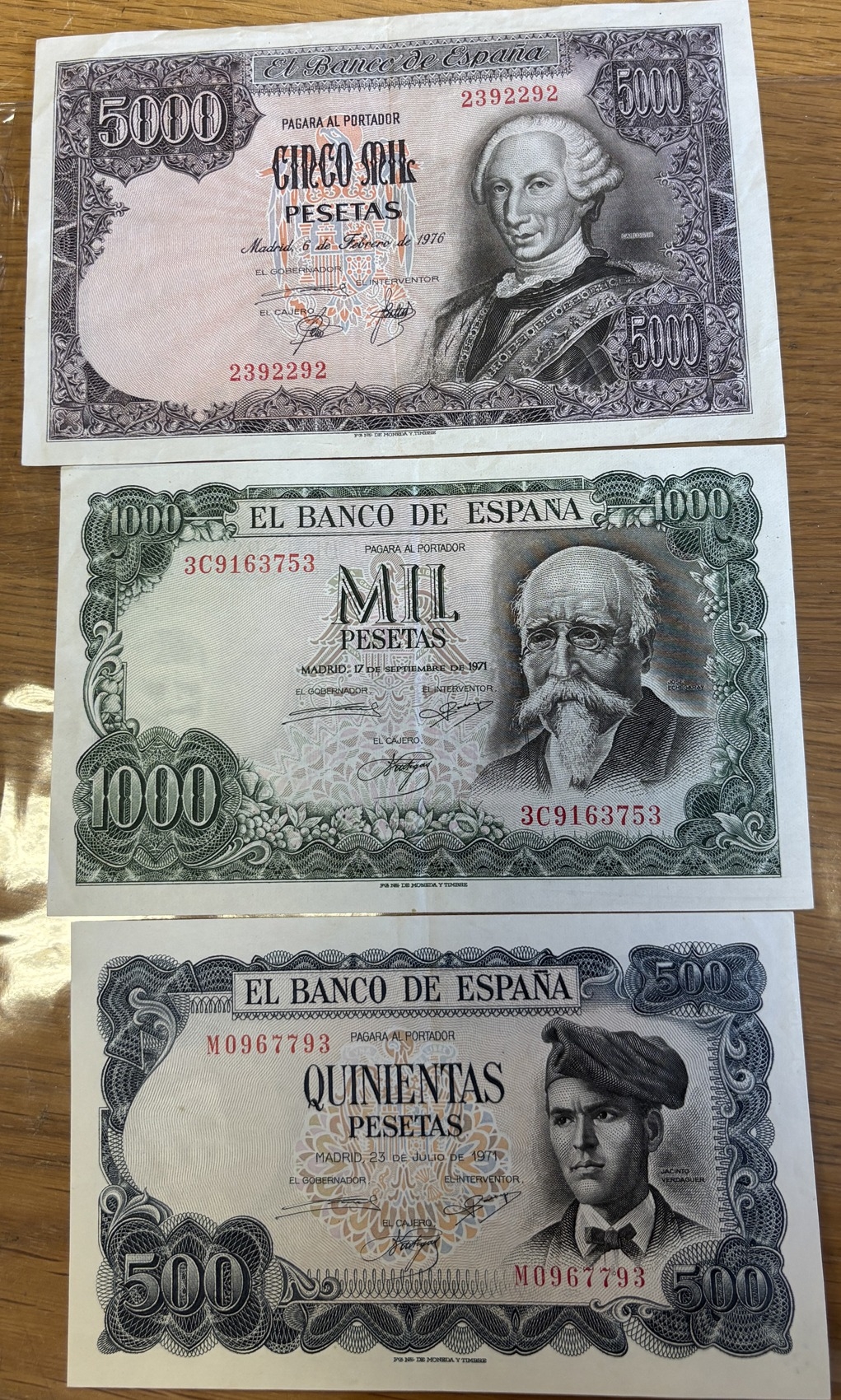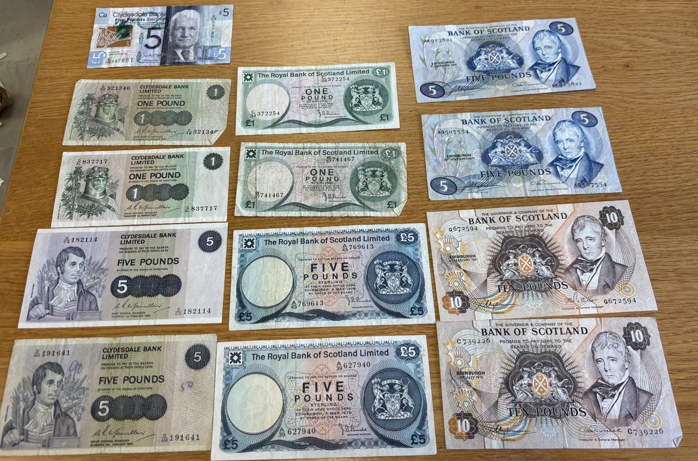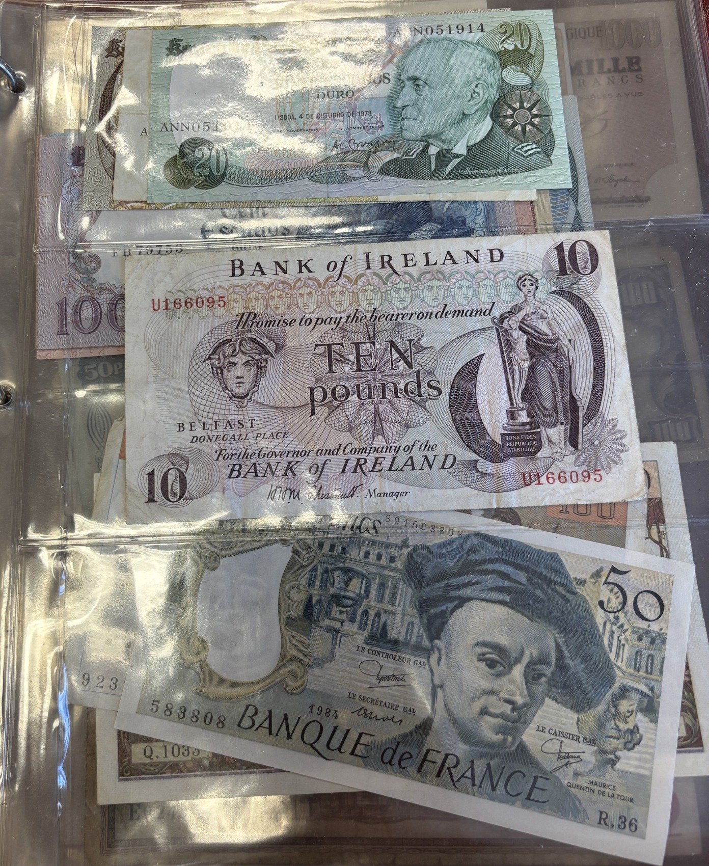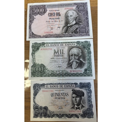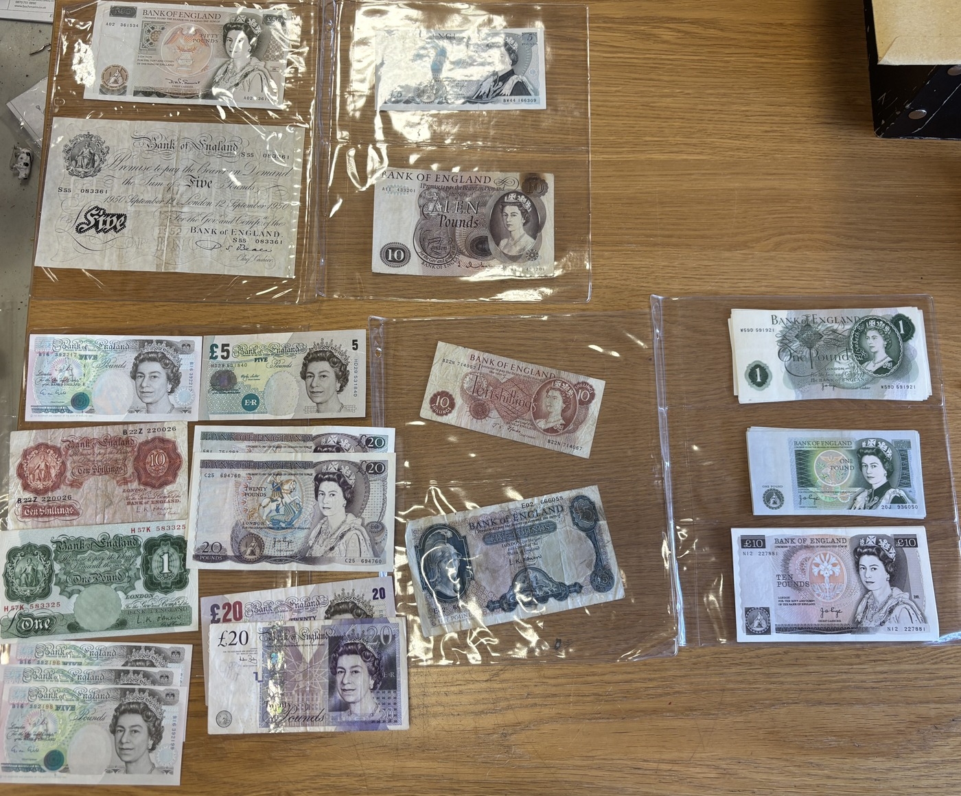 Collection of notes in plastic wallets, generally very fine to extremely fine, including Beale white £5 S55, O'Brien £5 E02, Hollom £10 A11, Page £20 C25, £10 N12, £5 BW44, Somerset £50 A02, £20 58A, Gill £5 B16 (4), Lowther £5 HD29, Bailey £20 EB68 and CC15. Plus further ranges of £1, 10/- notes and Spanish 5000 pesetas 1976 (6 Feb) 2392292, 1000 pesetas 1971 (17 Sep) 3C9163753 and 500 pesetas 1971 (23 Jul) M0967793. Qty 30. (R)
