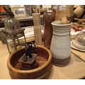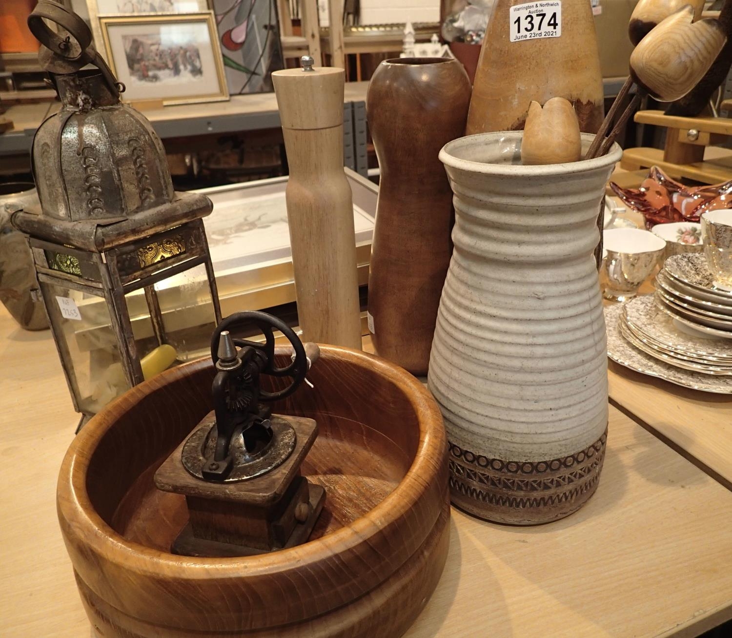 A selection of wooden vases, wooden bowl, pepper bill and metal lantern. Not available for in-house P&P, contact Paul O'Hea at Mailboxes on 01925 659133