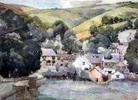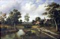 19th century oilpainting on canvas, rural scene with cottages, shepherd, sheep and dog in foreground, unsigned (sf), 19.5 x 29.5in.