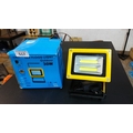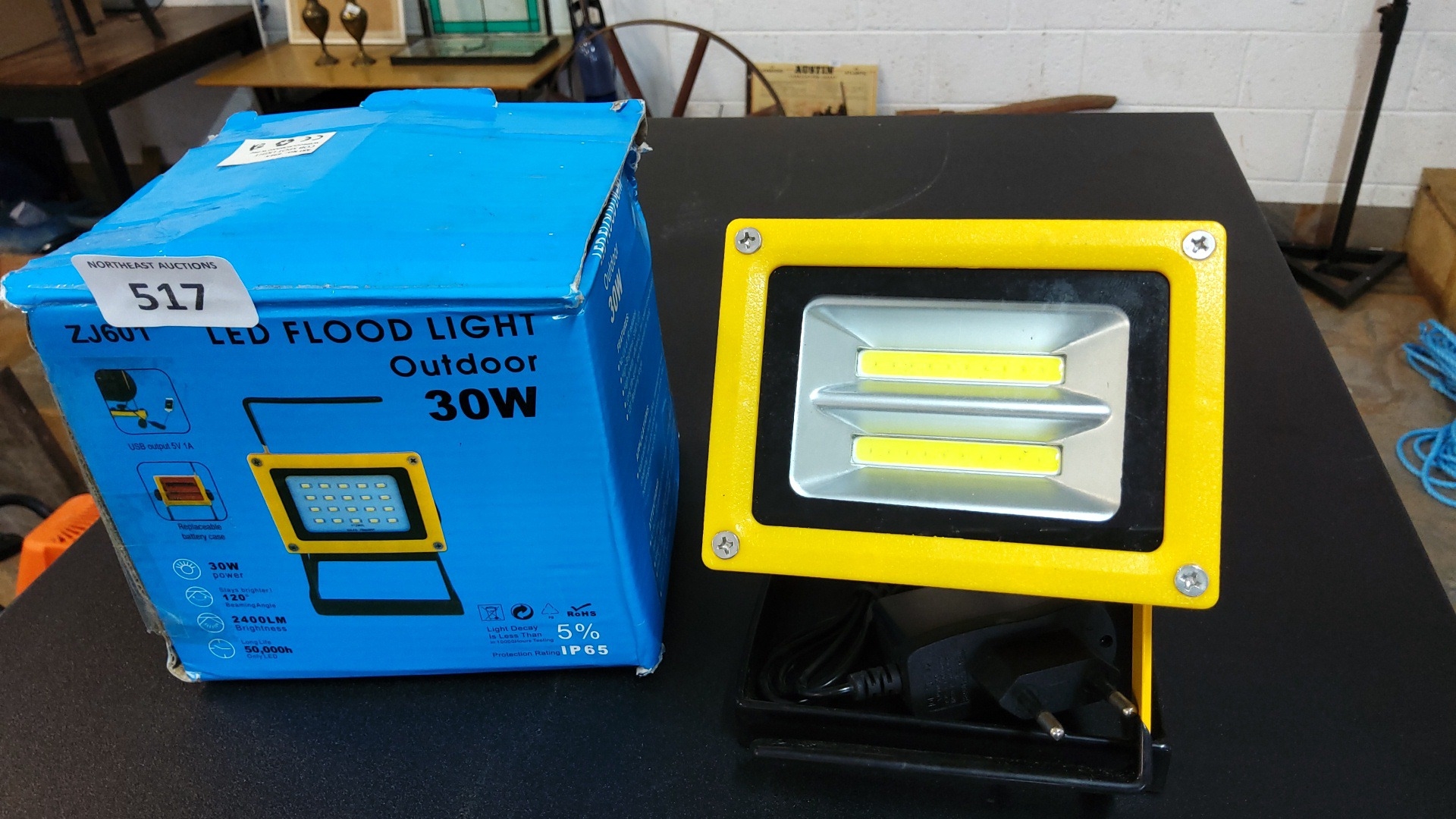 Portable outdoor LED flood light, model ZJ601, 30W—yellow metal housing with twin COB strips behind glass, on an adjustable stand with mains lead; boxed with printed specifications.