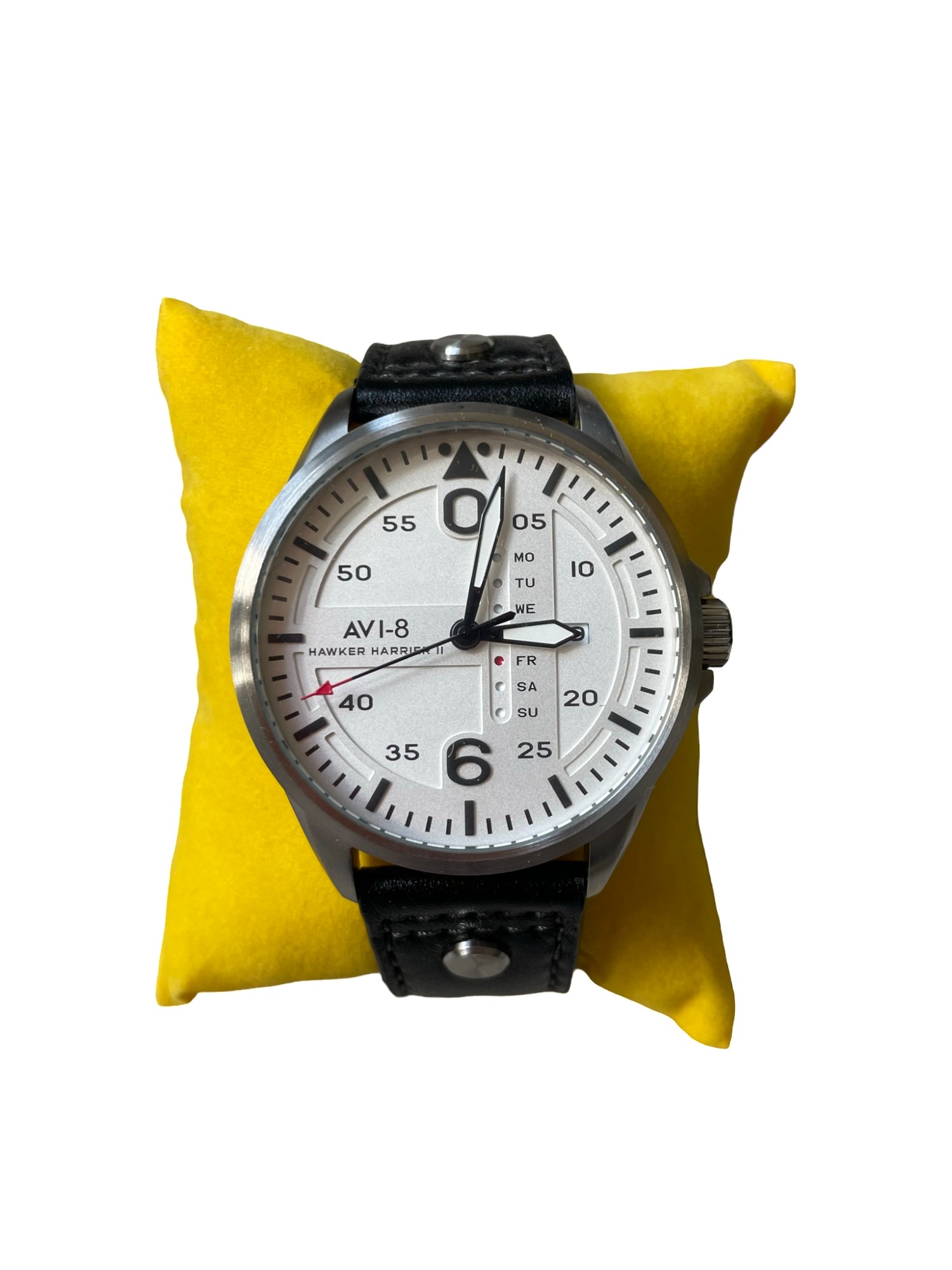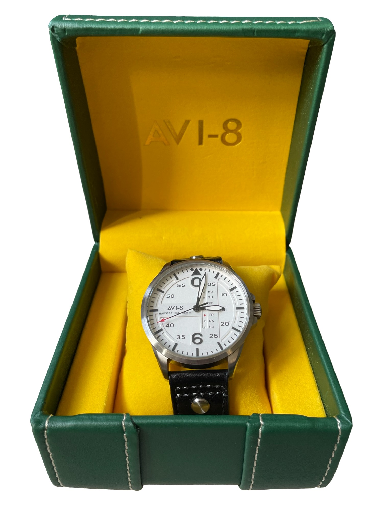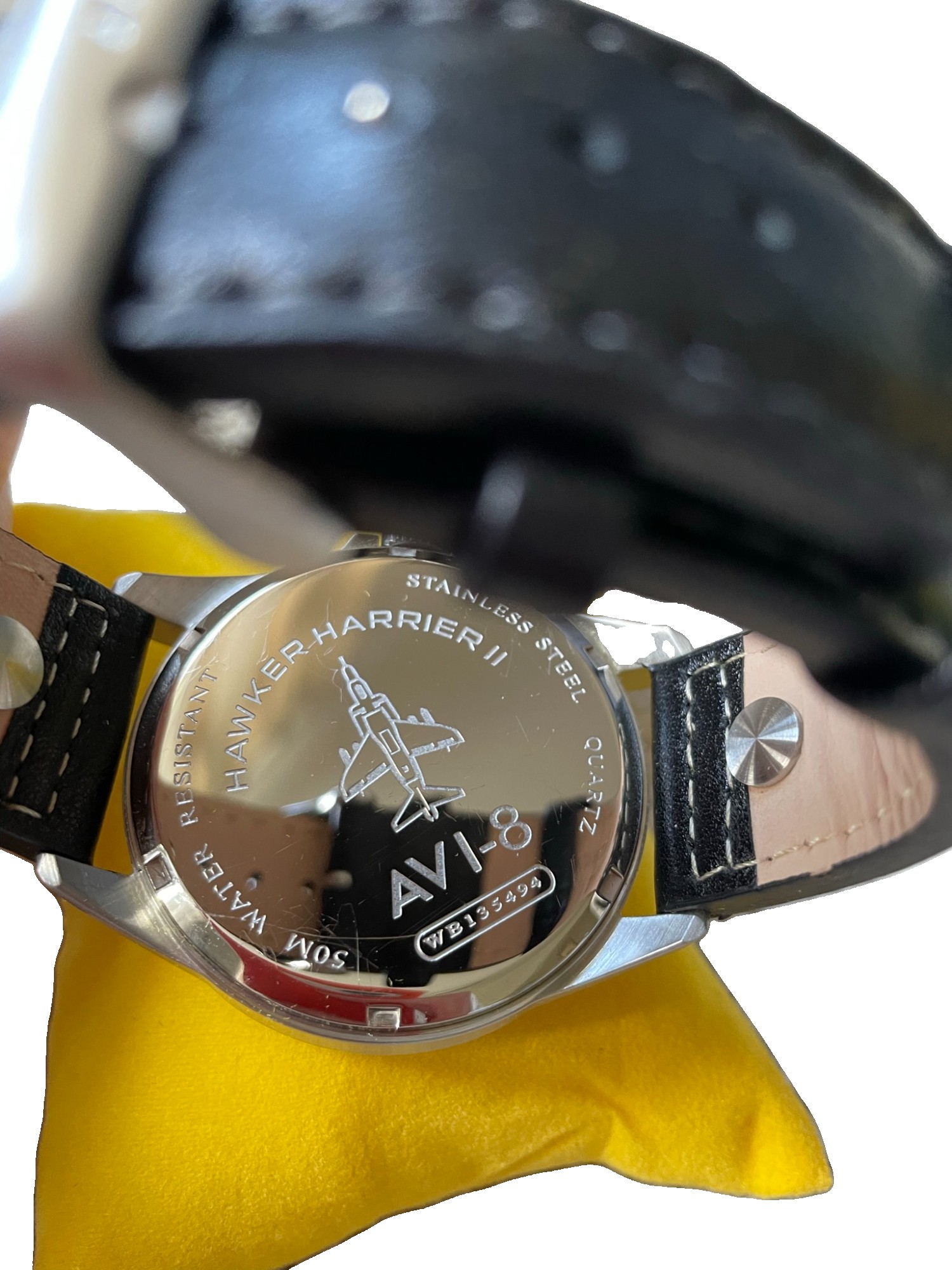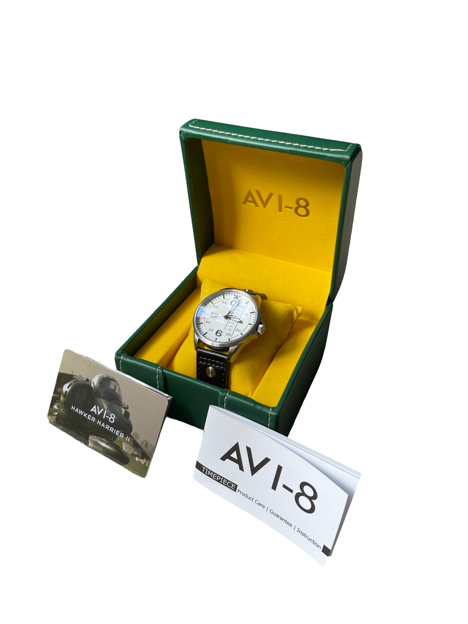 An AVI-8 "Hawker Harrier II" gents wristwatch on a black leather Strap. With original box and papers. Appears unworn.