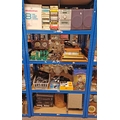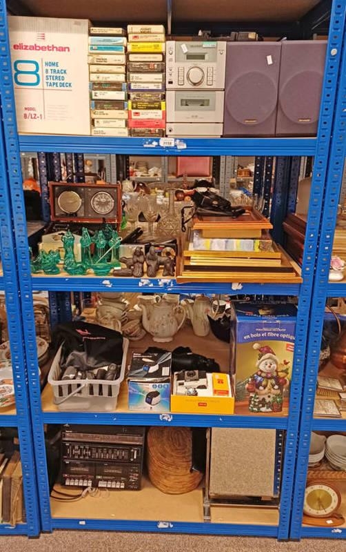 SELECTION OF VARIOUS ITEMS INCLUDING 8 TRACK PLAYER TOGETHER WITH VARIOUS TAPES, FRAMED PICTURES, BINOCULARS AND OTHERS OVER FOUR SHELVES
