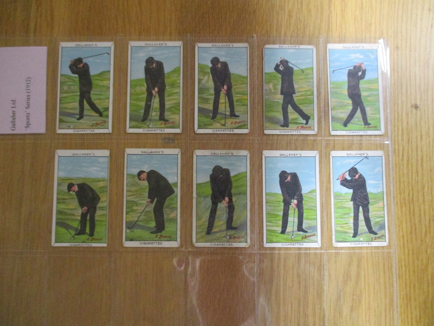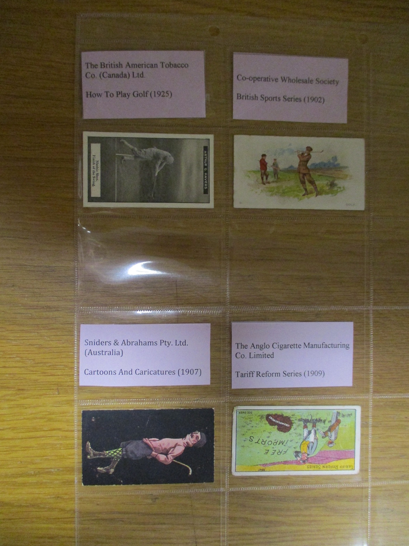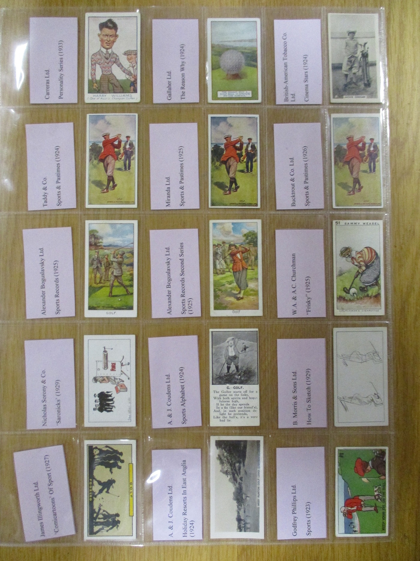 Collection of Golf-themed useful odds in plastic sleeves, including Anglo Cigarette Manufacturing Tariff Reform Series, A. & J. Coudens Sports Alphabet, BAT Cinema Stars, Bucktrout Sports & Pastimes, C.W.S British Sports Series, Gallaher 'Sports' Series (10), Illingworth 'Comicartoons' of Sport, Miranda Sports & Pastimes, Sniders & Abrahams Cartoons & Caricatures, Taddy Sports & Pastimes (Golf No 6), etc, varying condition. Qty 45 (R)