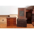 fitted four drawers with rebated sides to accommodate glass panels and with turned knobs, on plinth support, 30cm high x 33cm wide x 20cm; together with an early 20th century 'Leader' cloth covered four other drawer chest; and a pine box enclosed by gauze inset door (3)