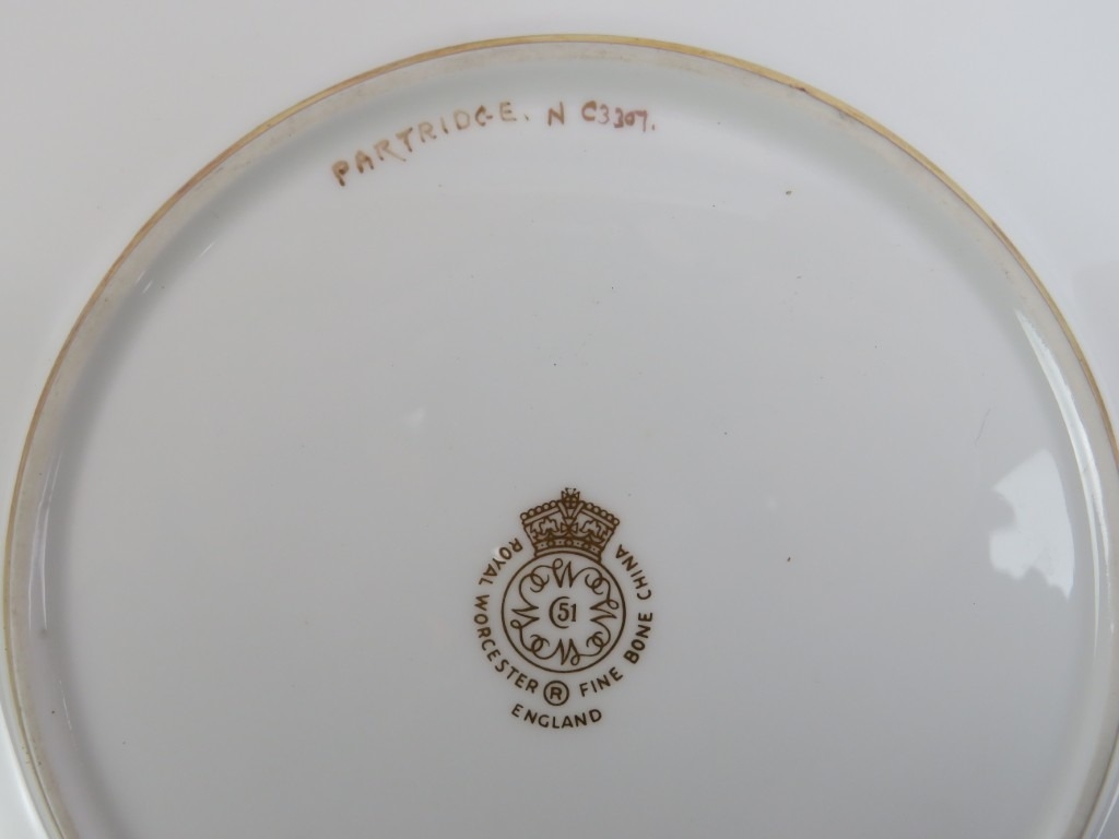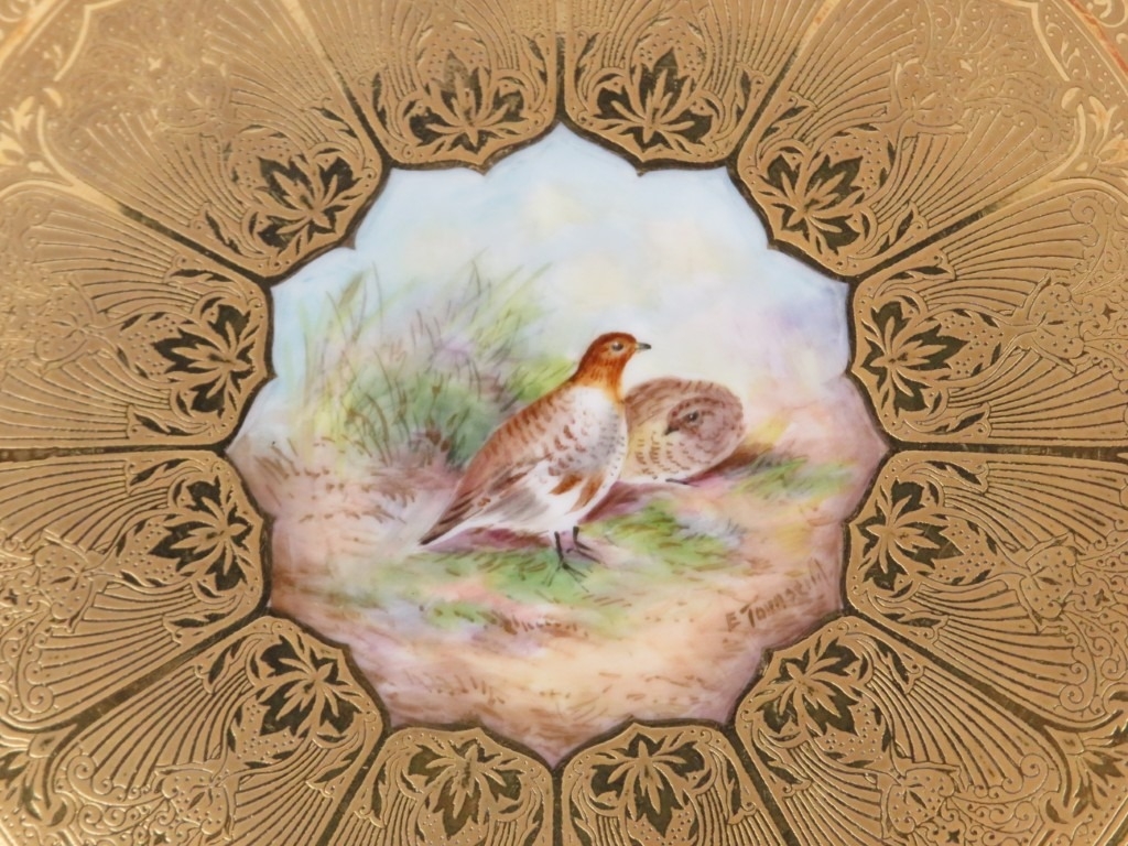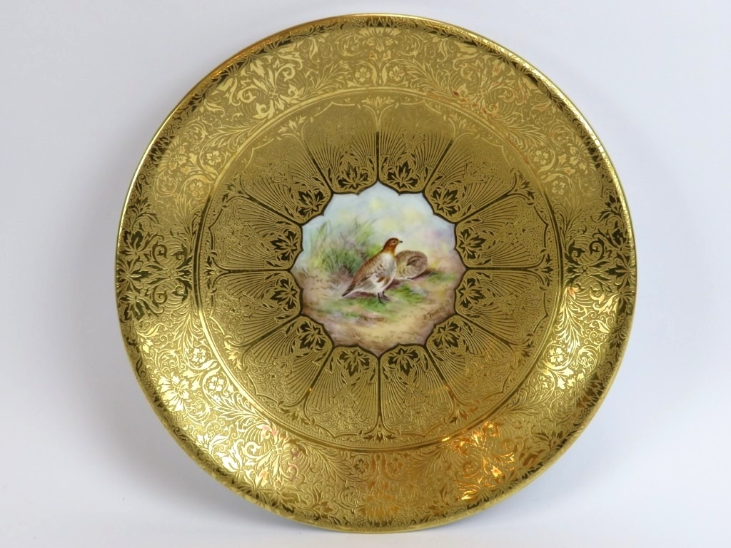 A Royal Worcester cabinet plate profusely gilt decorated and hand painted depicting a brace of partridges by Edward Townsend, mid 20th century. Signed with factory marks to the reverse. 23.7 cm diameter.