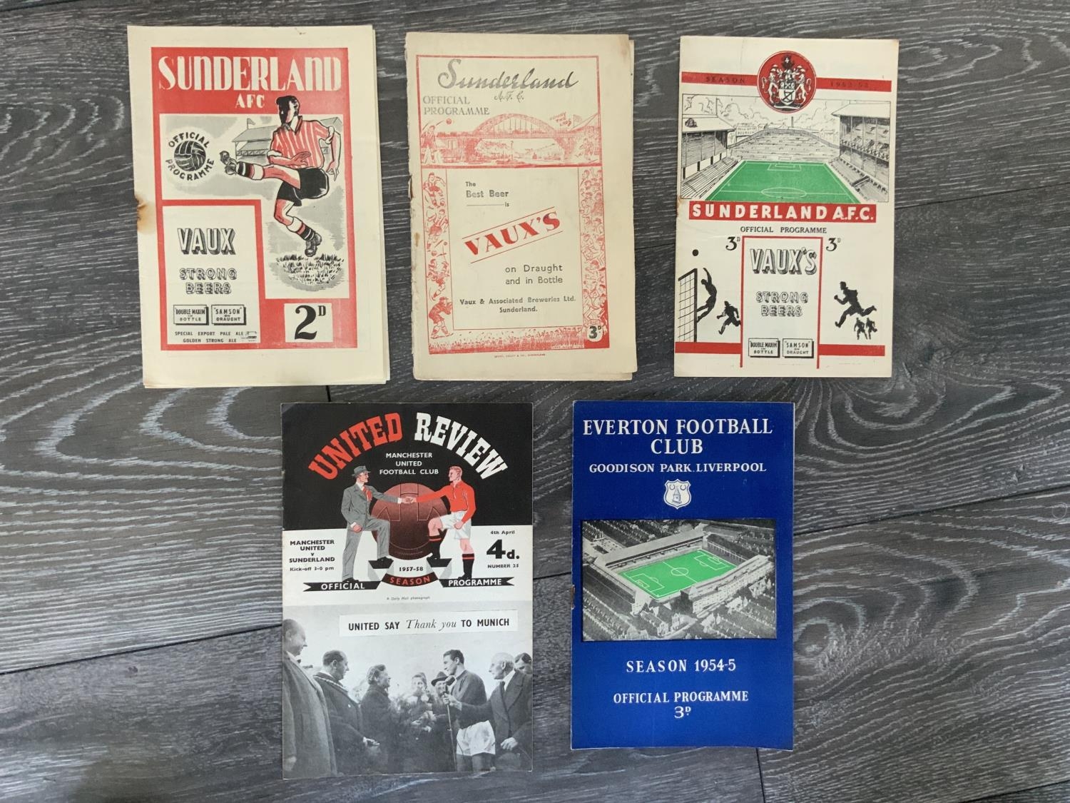 1950s Sunderland Football Programmes: Homes 54/55 Reserves v South Shields with staple rotted away leaving hole, 52/53 Derby rusty staple, 48/49 Man City spine completely split. C/W 2 1950s aways in good condition. (5)