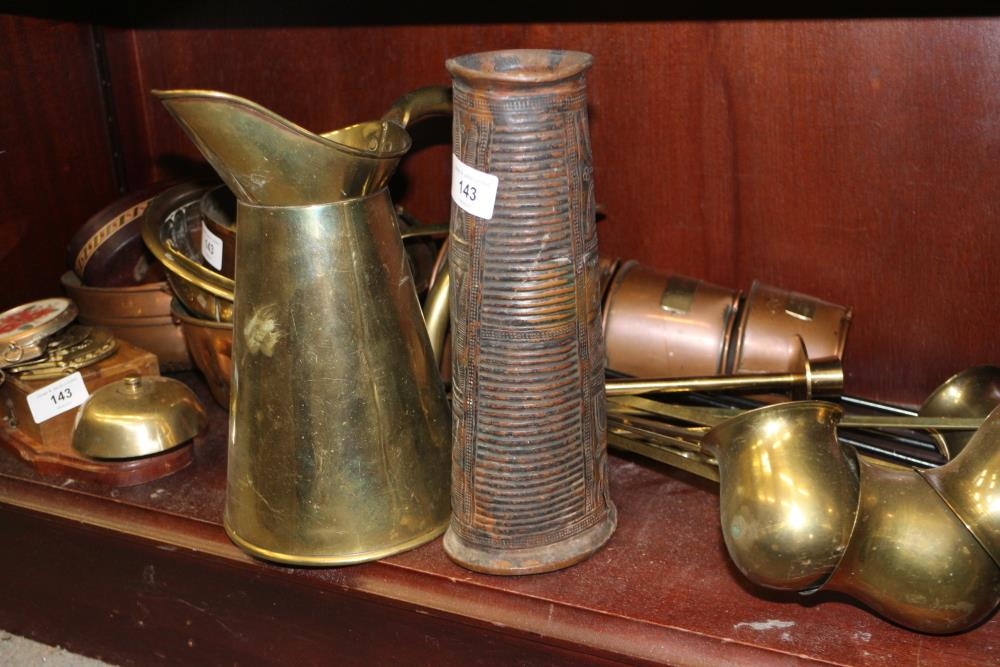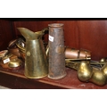 A quantity of metalware, including three copper graduated cider measures, three similar brass whisky measures and other metalware