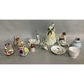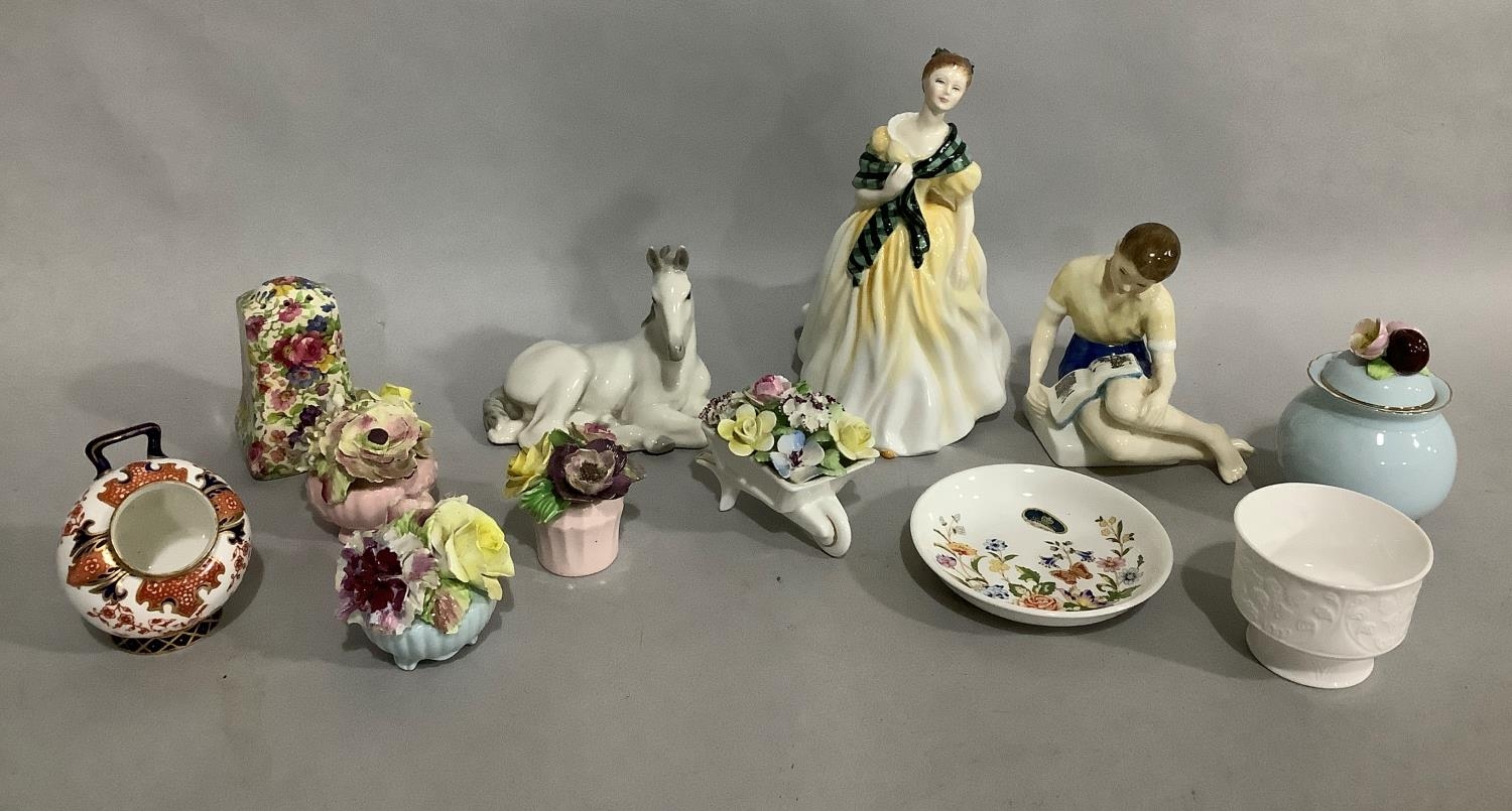 Royal Doulton figure Treasure Island and Joan, Russian china horse, flower clusters, Royal Crown Derby sugar scuttle, Royal Winton Chinz pepper pot etc.
