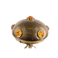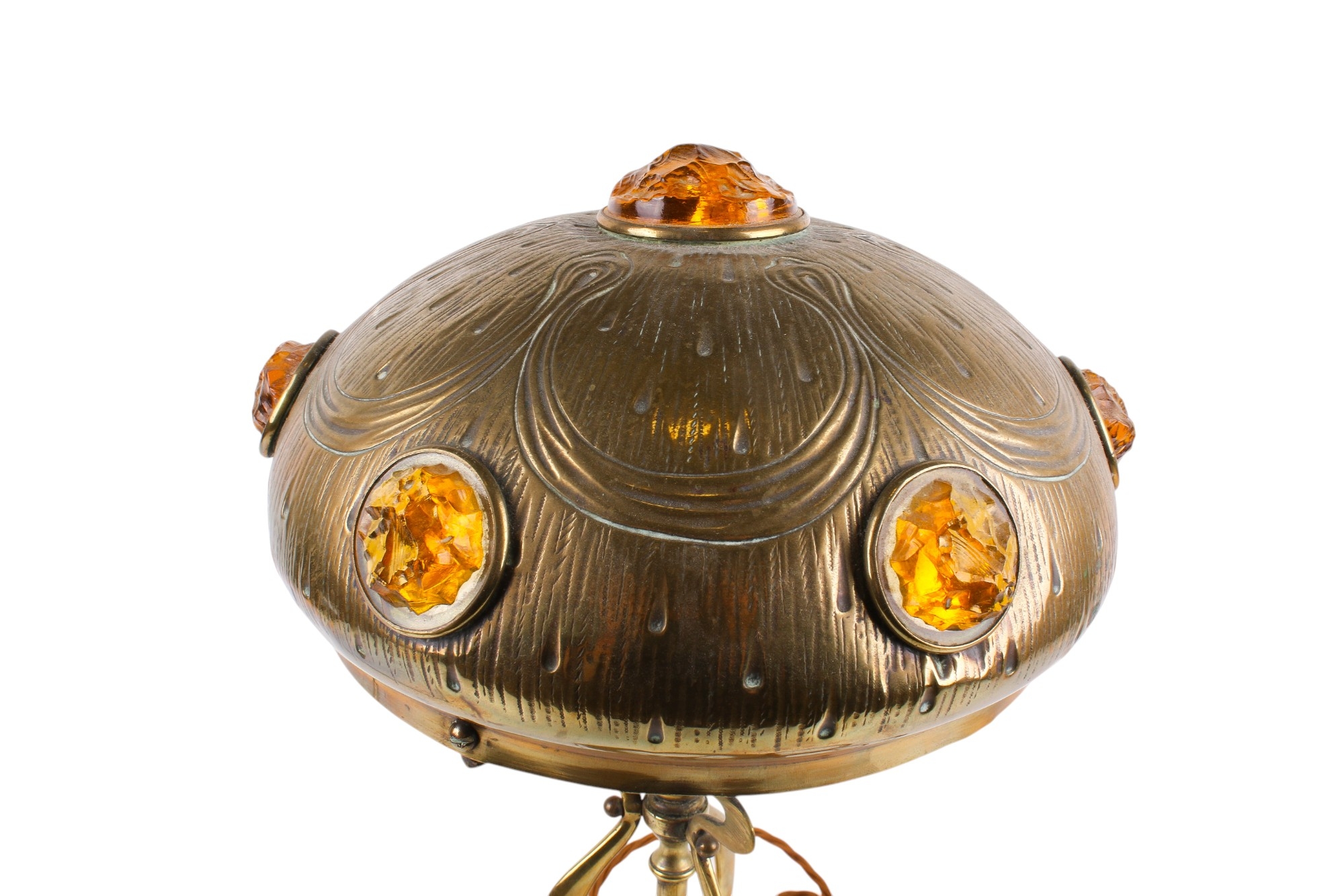 An Art Nouveau brass table lamp. The domed shade with engraved decoration and inset with amber coloured roundels, mounted on a scrolling stand, the three bands united by a circular ringed base, H50cm