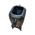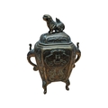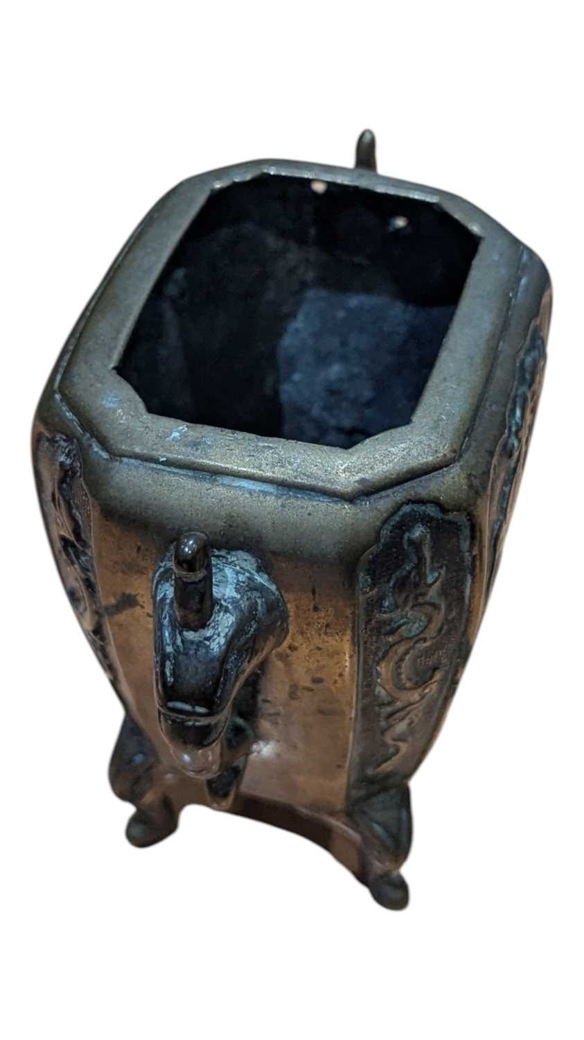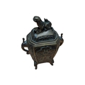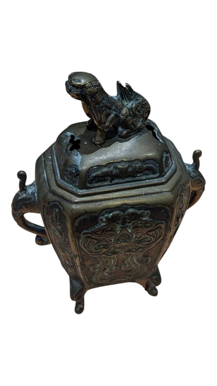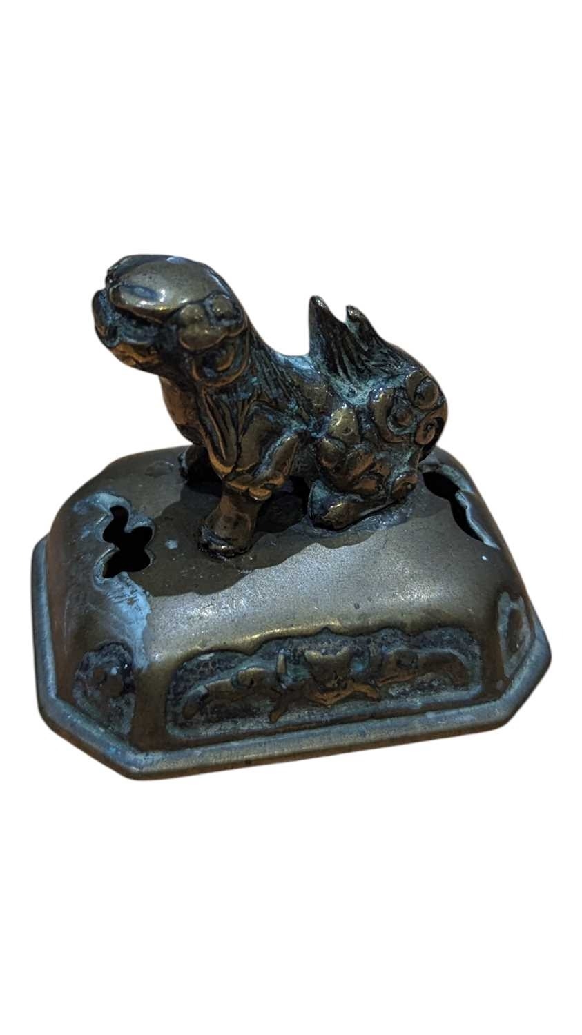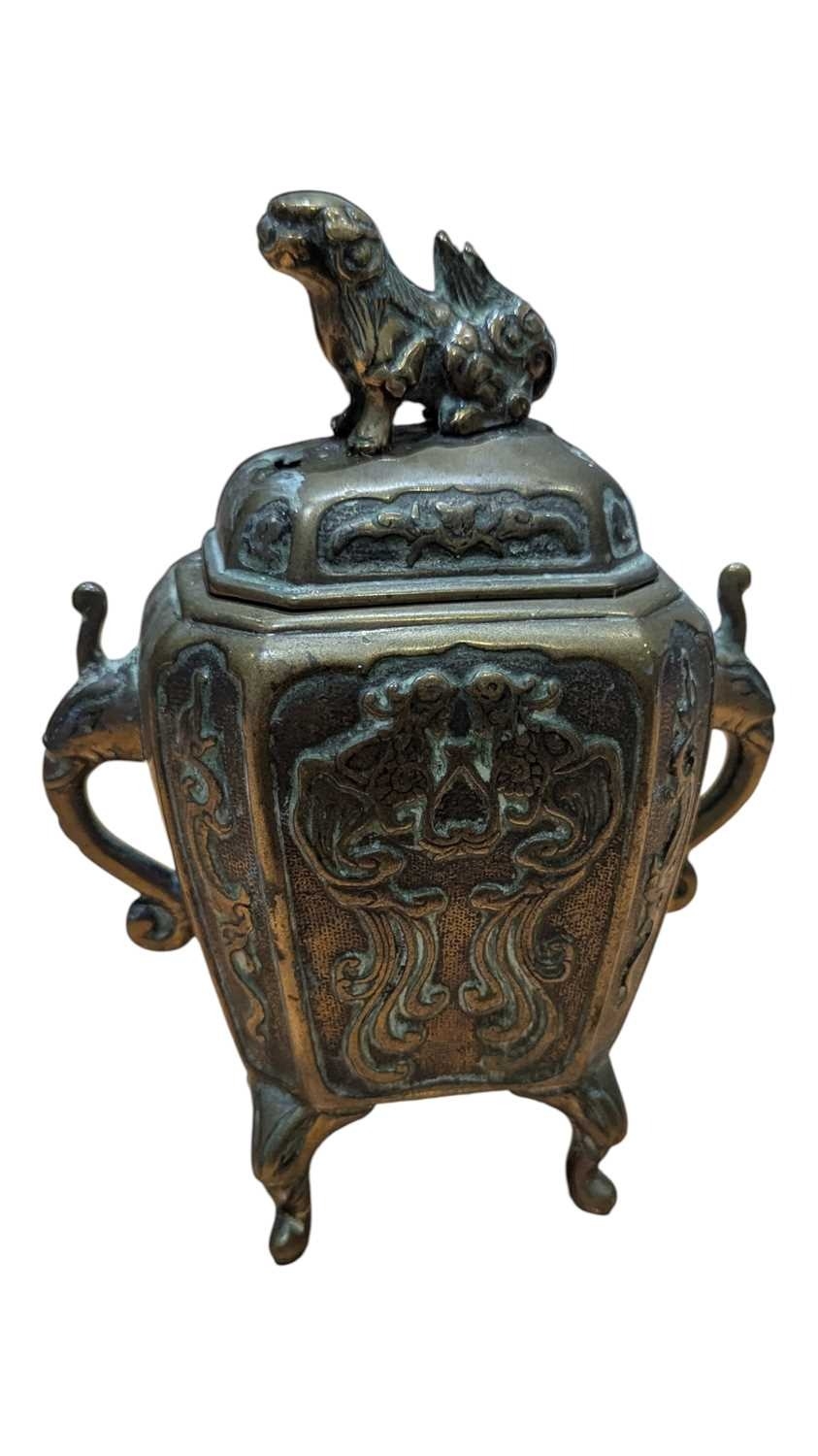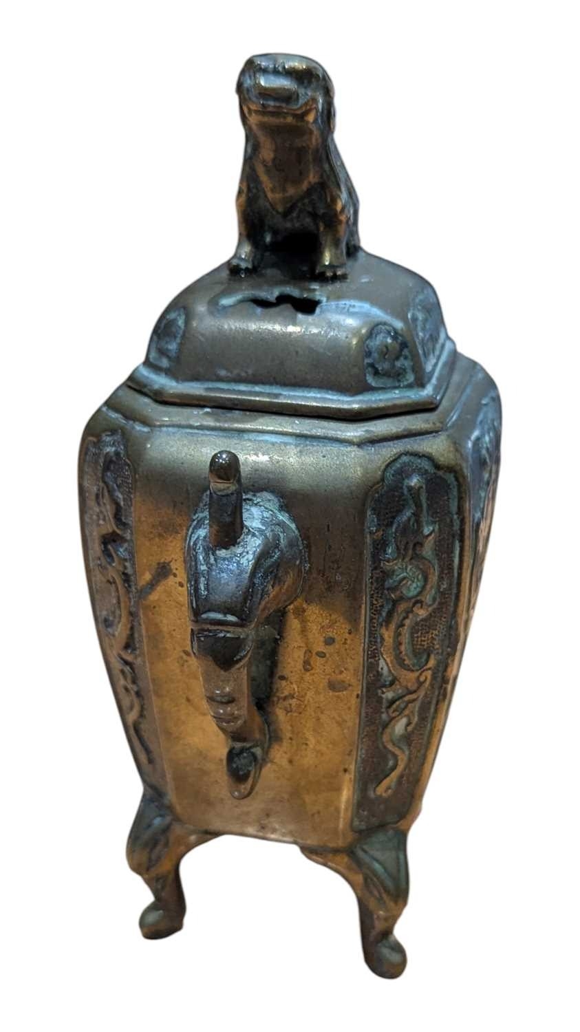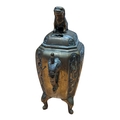 A 19th century Chinese brass censor. Raised on short supports, with repousse decoration to sides. Twin handled, with Foo Dog knop to lid.