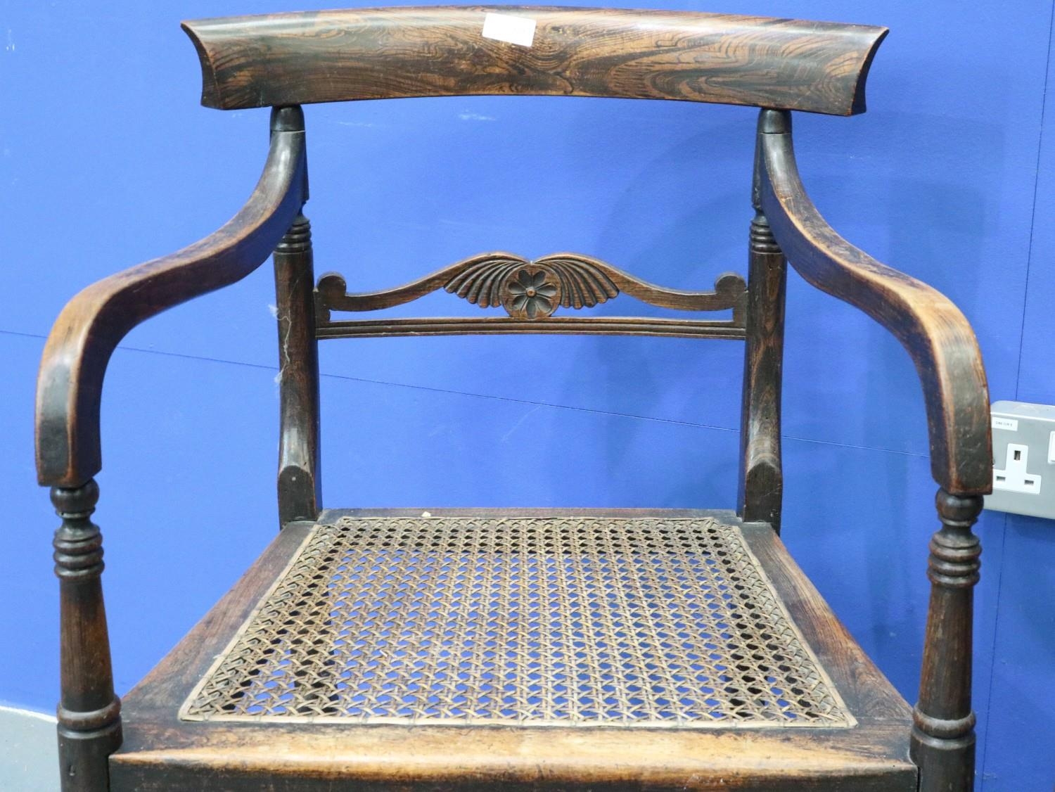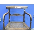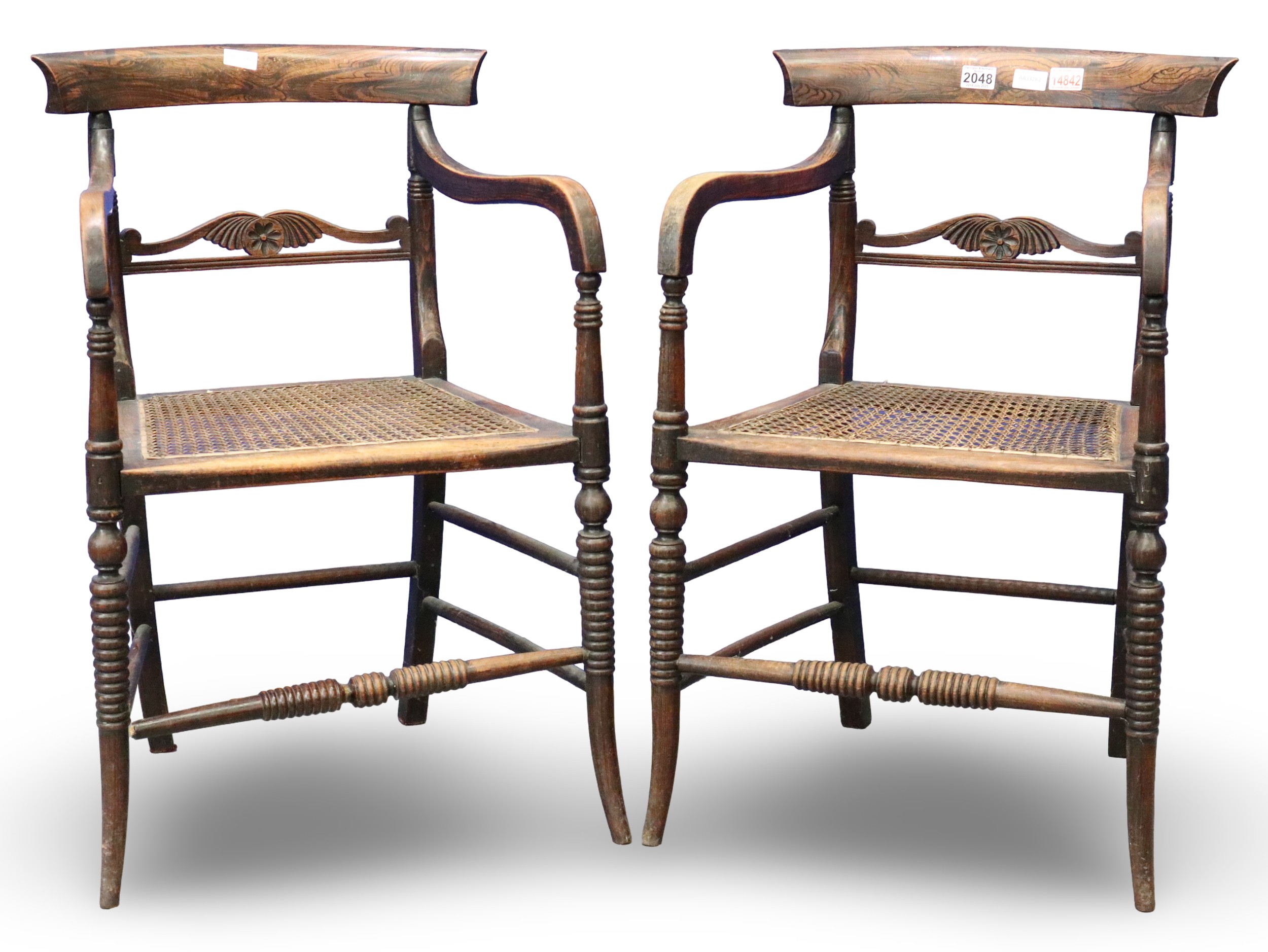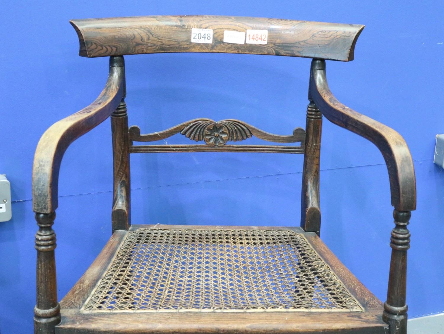 A pair of Regency period rosewood elbow chairs, each having bergère seats, with turned supports and stretchers, both for restoration. Not available for in-house P&P