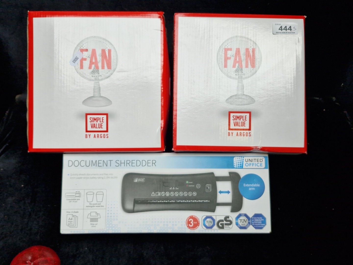 A group of boxed office appliances, comprising Argos “Simple Value” table fans and a United Office document shredder, strip-cut 6mm with extendable arm for use over waste bins.