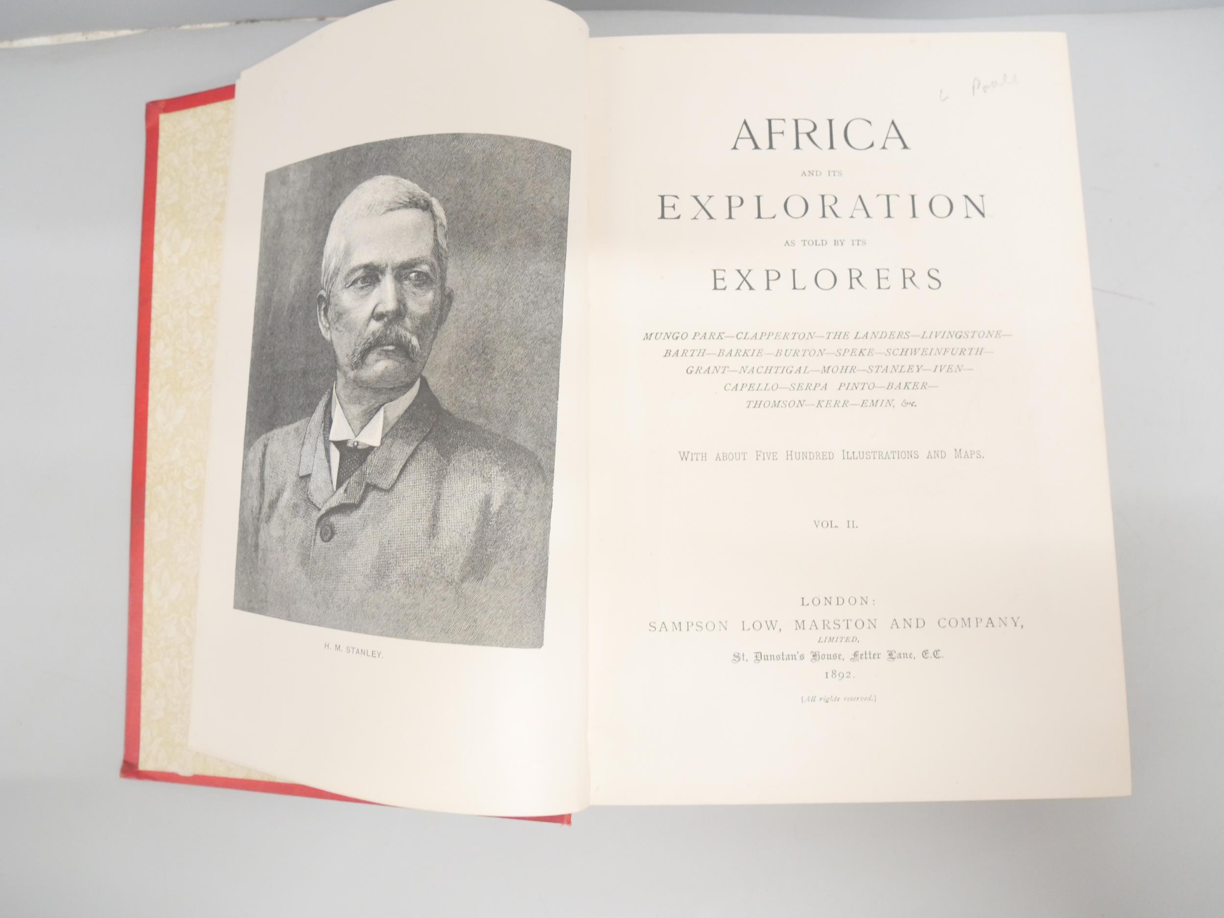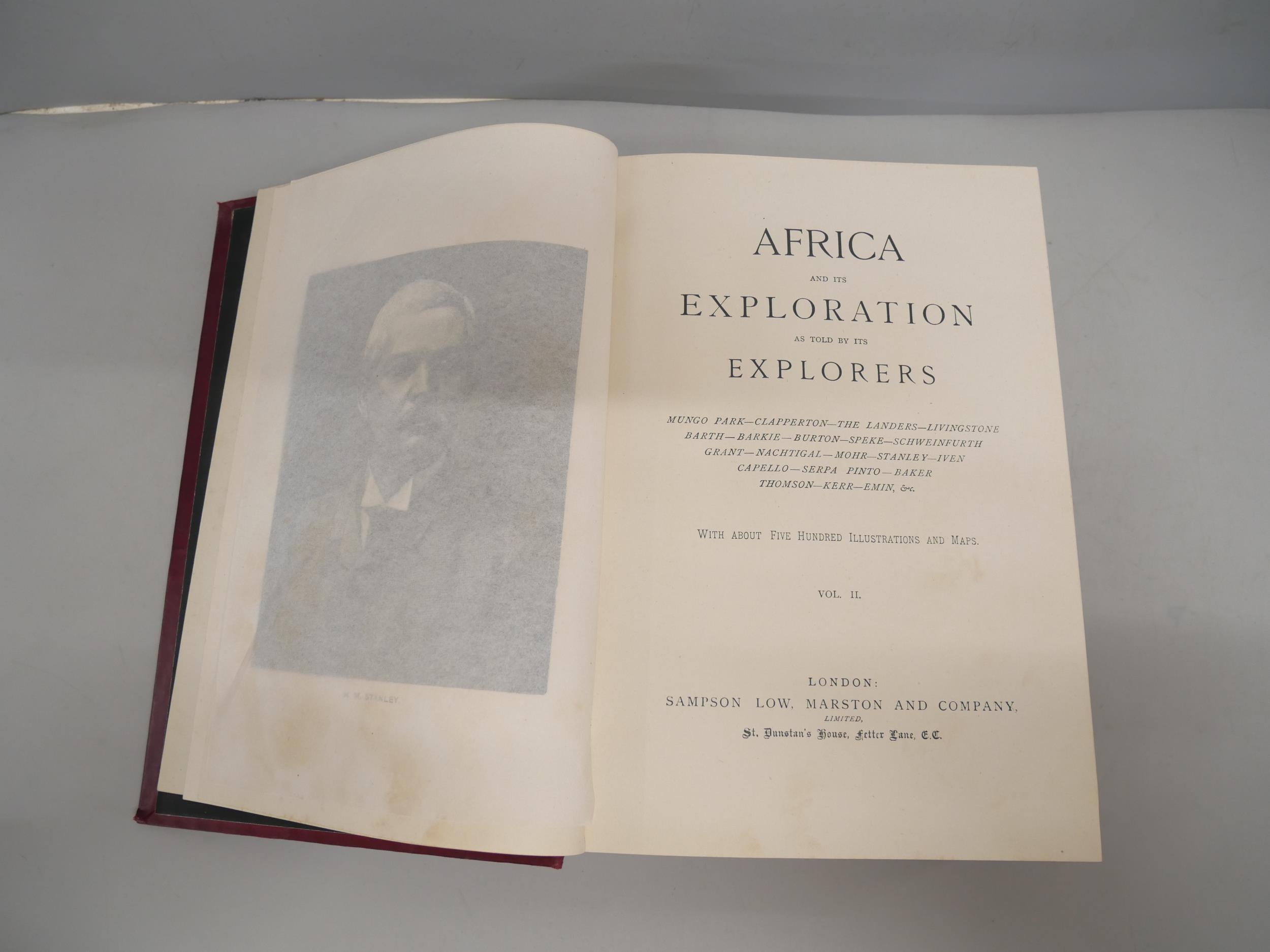 A collection of four books on African exploration including Africa by Cameron 1885, leather bound, Great Travellers and Explorers in Africa volumes I and II, 1890s plus an additional volume II with different binding