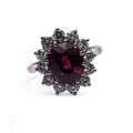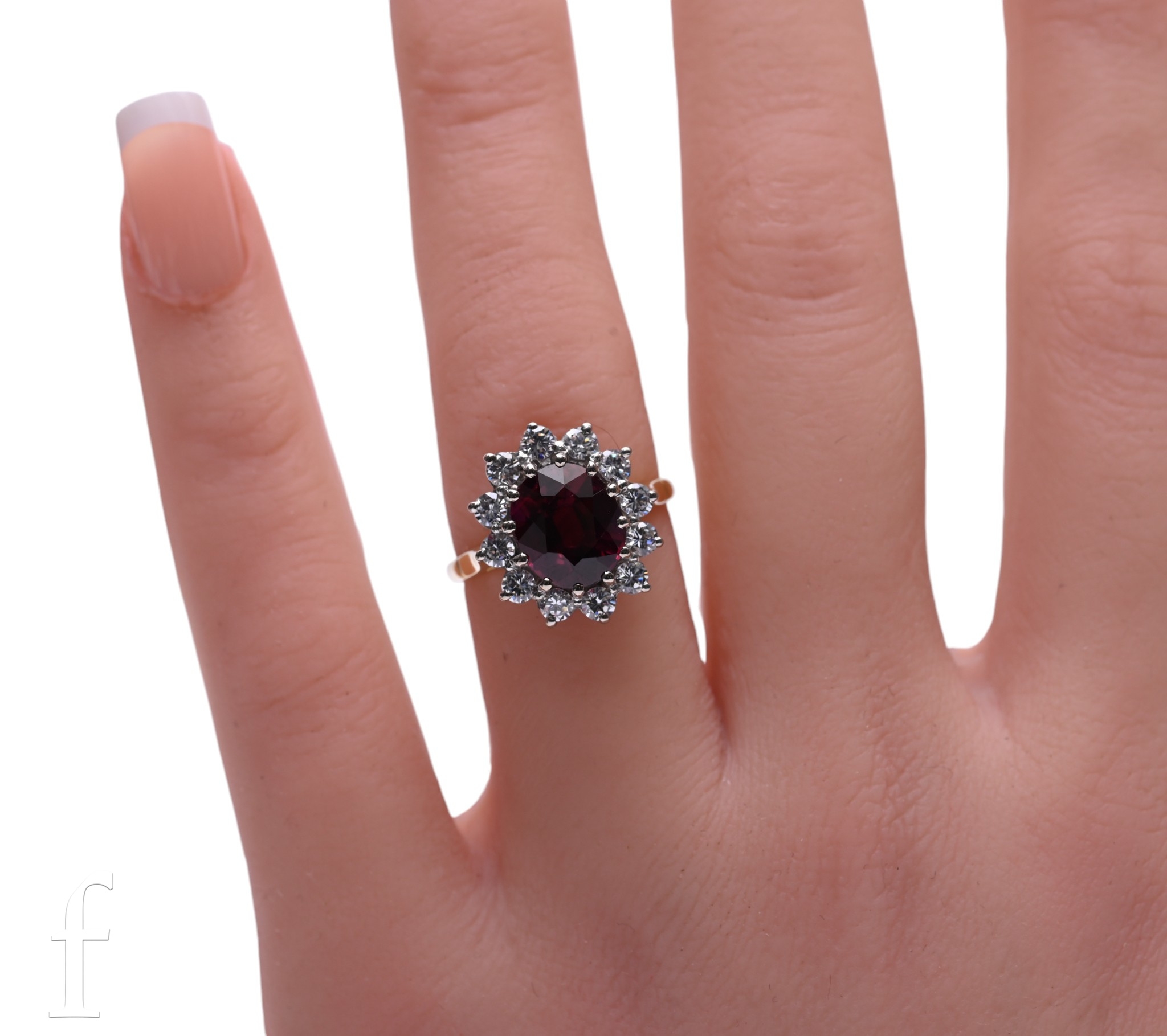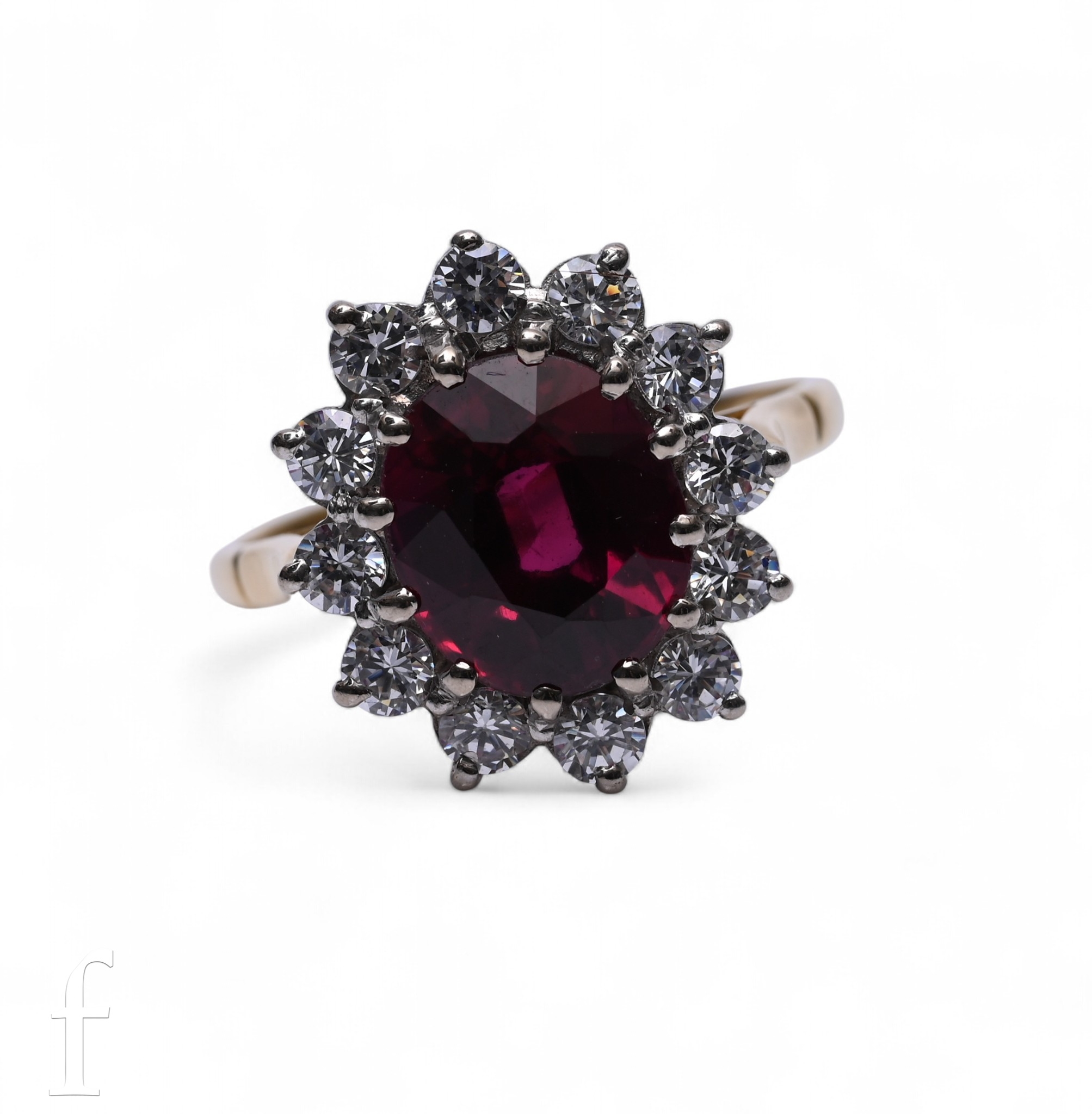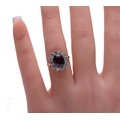A ruby and diamond cluster ring, the oval mixed-cut ruby twelve claw set within a bezel of brilliant-cut diamonds, between pierced shoulders, hallmarked for 18 carat, total weight 4.2g, ring size L.