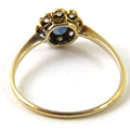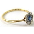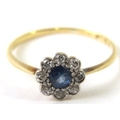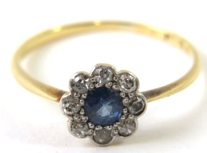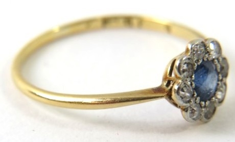A pretty antique sapphire and diamond cluster ring. The mid-blue sapphire 4mm diameter set in a halo of single cut diamonds, yellow shank stamped ‘18CT’ 1.7g approx.