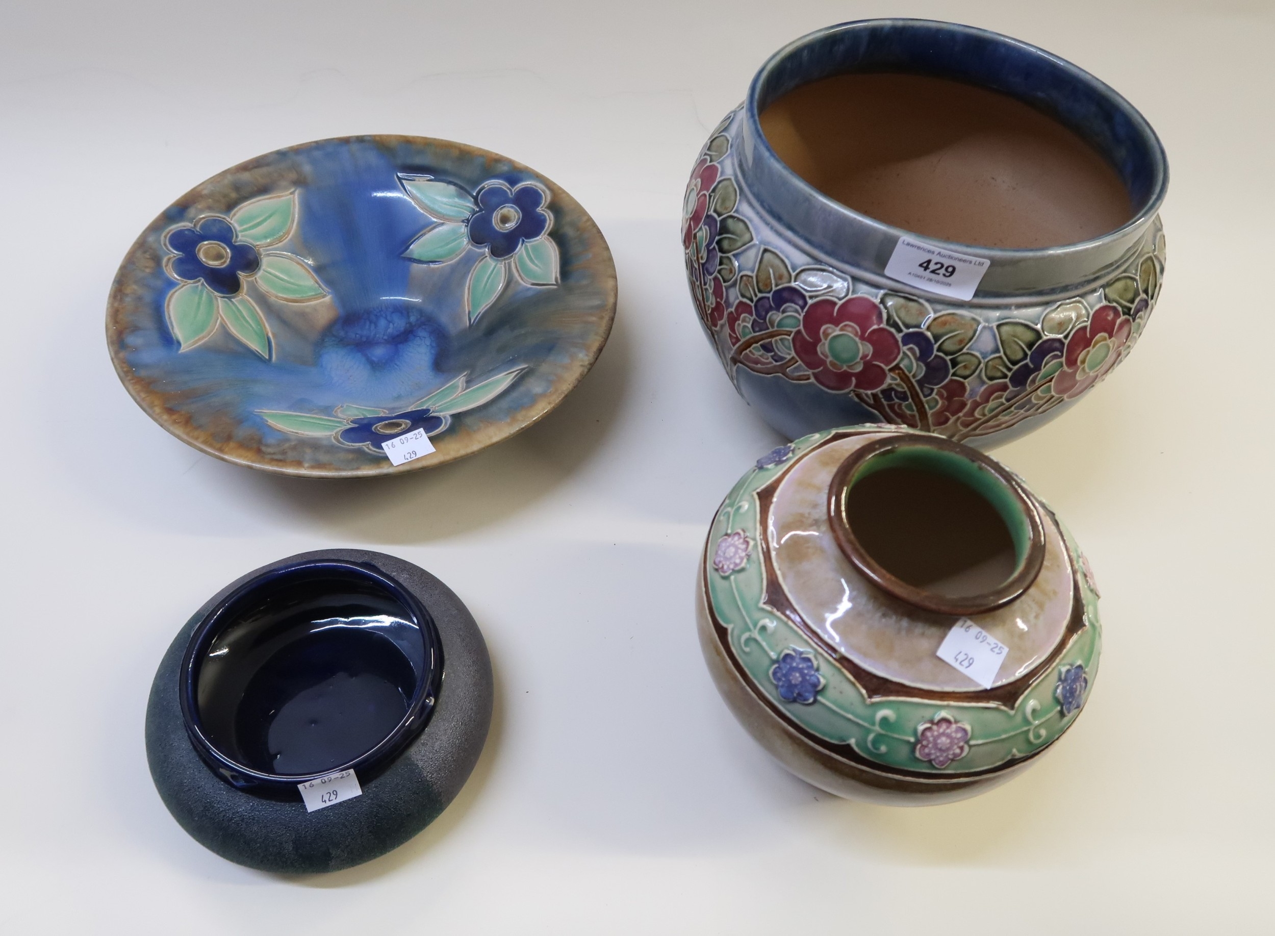 Royal Doulton floral decorated jardinere, another similar vase, bowl and a squat dish