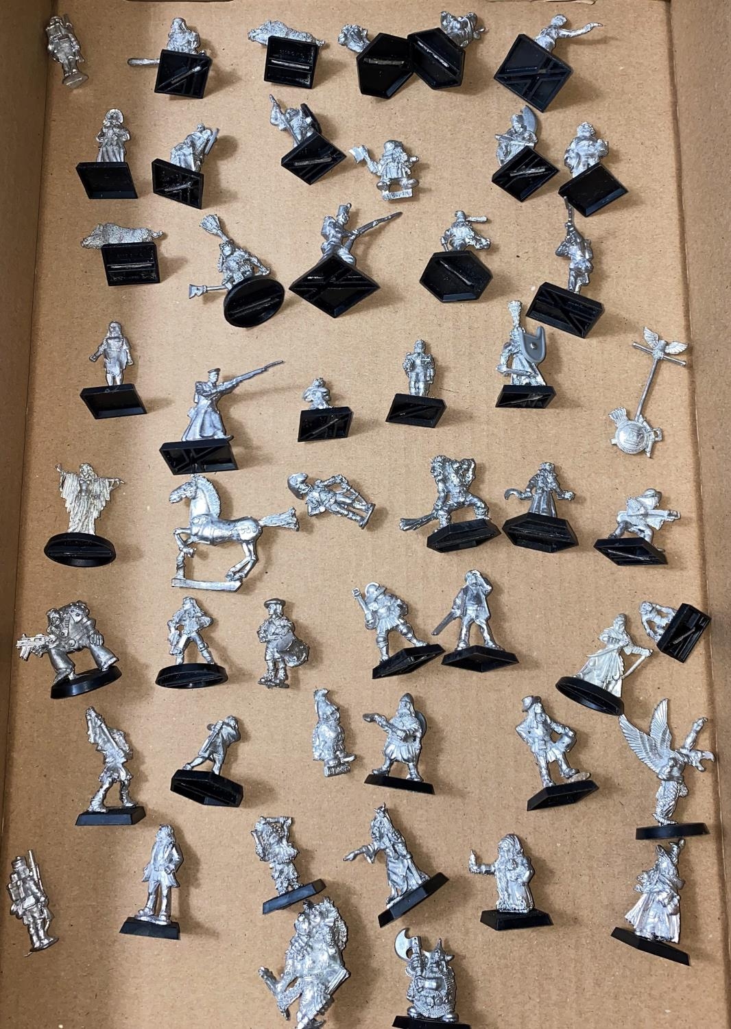 A selection of unpainted vintage Games Workshop Citadel Games, and some others, mainly Warhammer Fantasy, some 40K, mainly metal, some plastic, table top miniatures