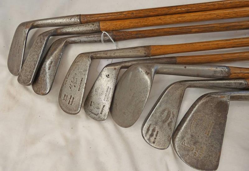 8 HICKORY SHAFTED GOLF CLUBS TO INCLUDE MID IRON BY D ADAMS, GLASGOW, MID IRON BY A MONTROSE MAKER, MASHIE BY TOM MORRIS, ST ANDREWS, DEEP FACED MASHIE BY A G SPALDING & BROS, SPADE MASHIE BY FORGAN & SON, ST ANDREWS, MASHIE BY BRAND CARNOUSTIE AND TWO OTHERS -8-
