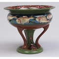 A Wileman & Co Foley "Intarsio" comport, designed by Frederick Rhead, c1895-1900, printed and painted with a band of fish, 18cm h, printed mark, "Intarsio", Rd No 330286 and 3388