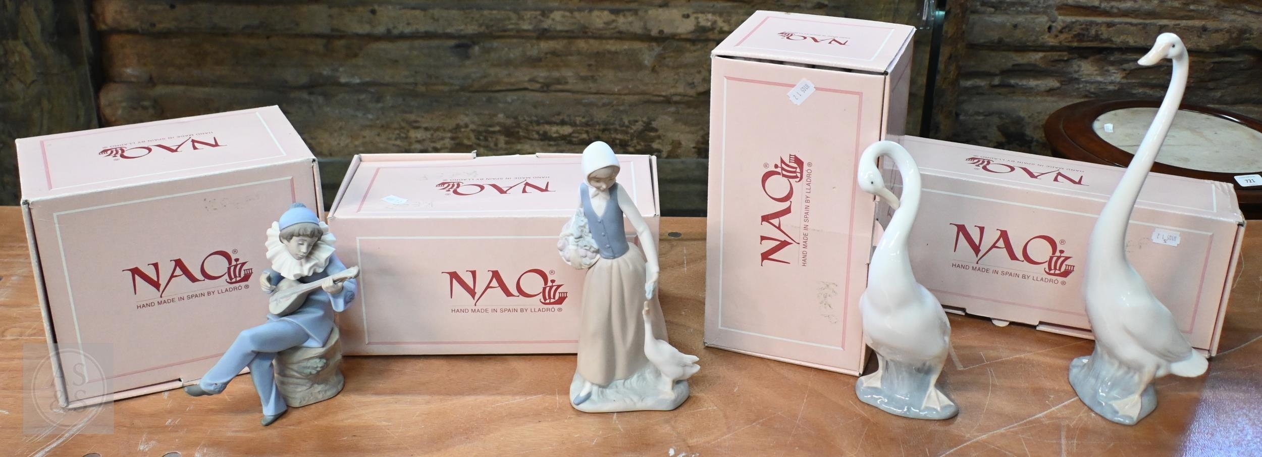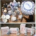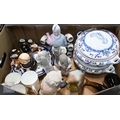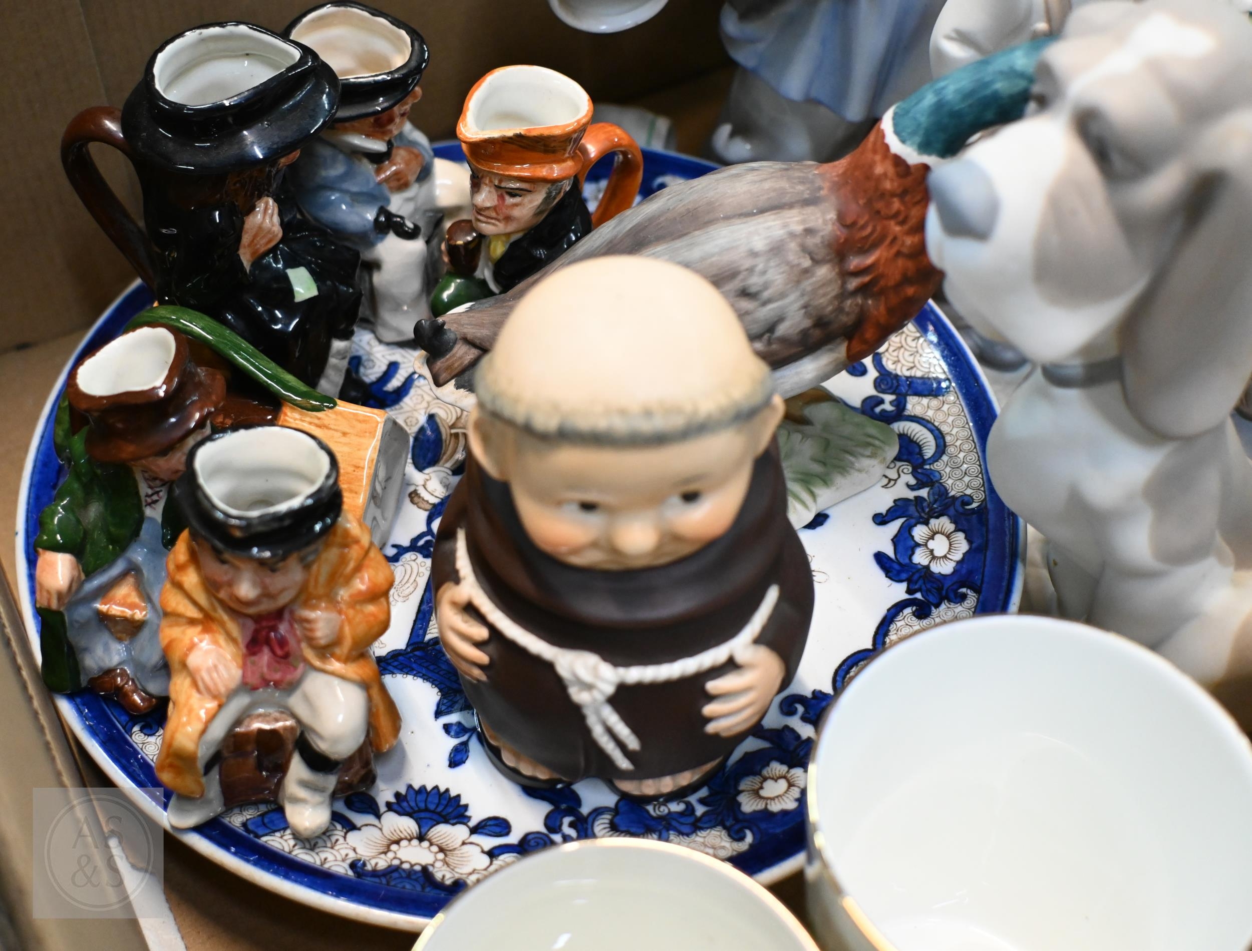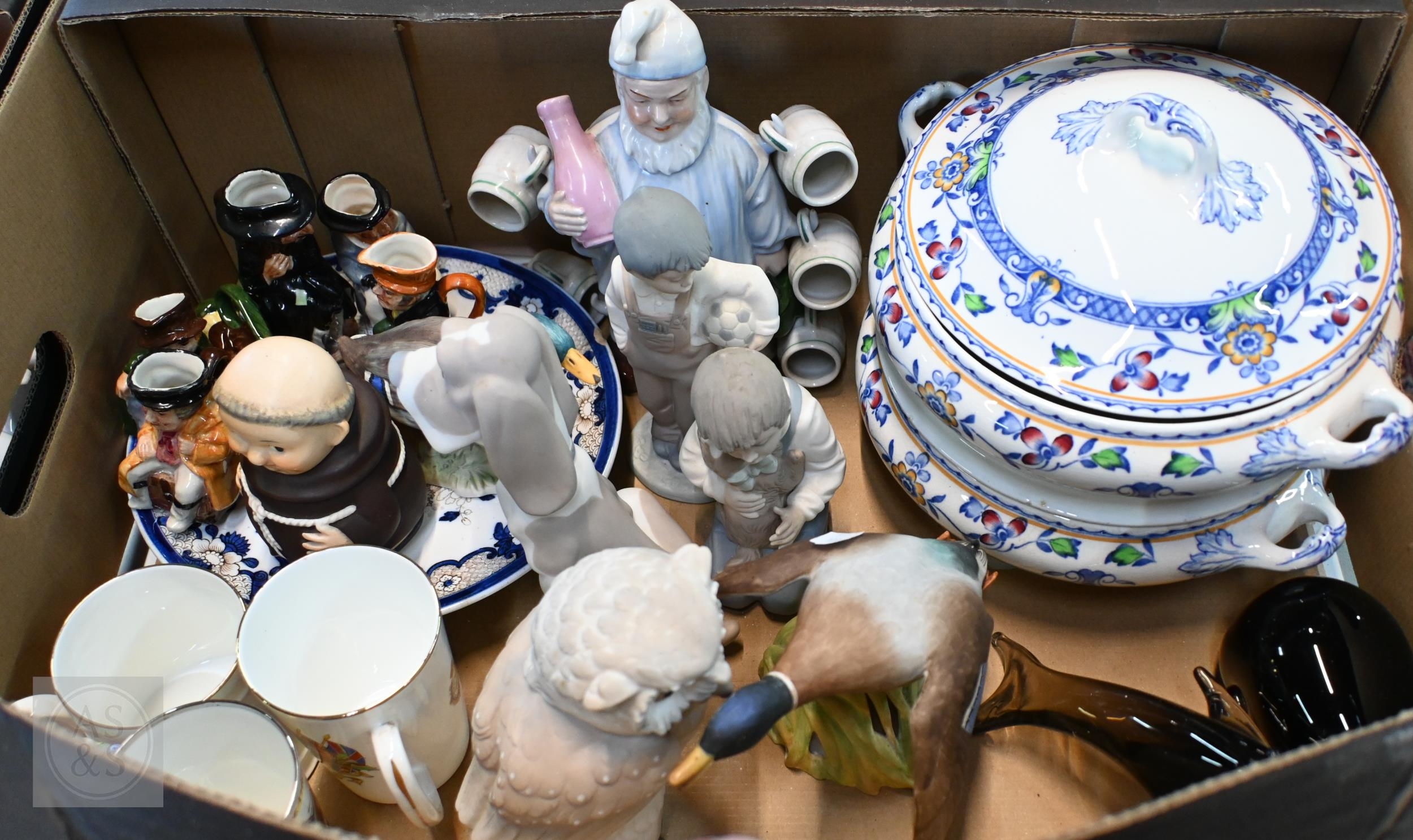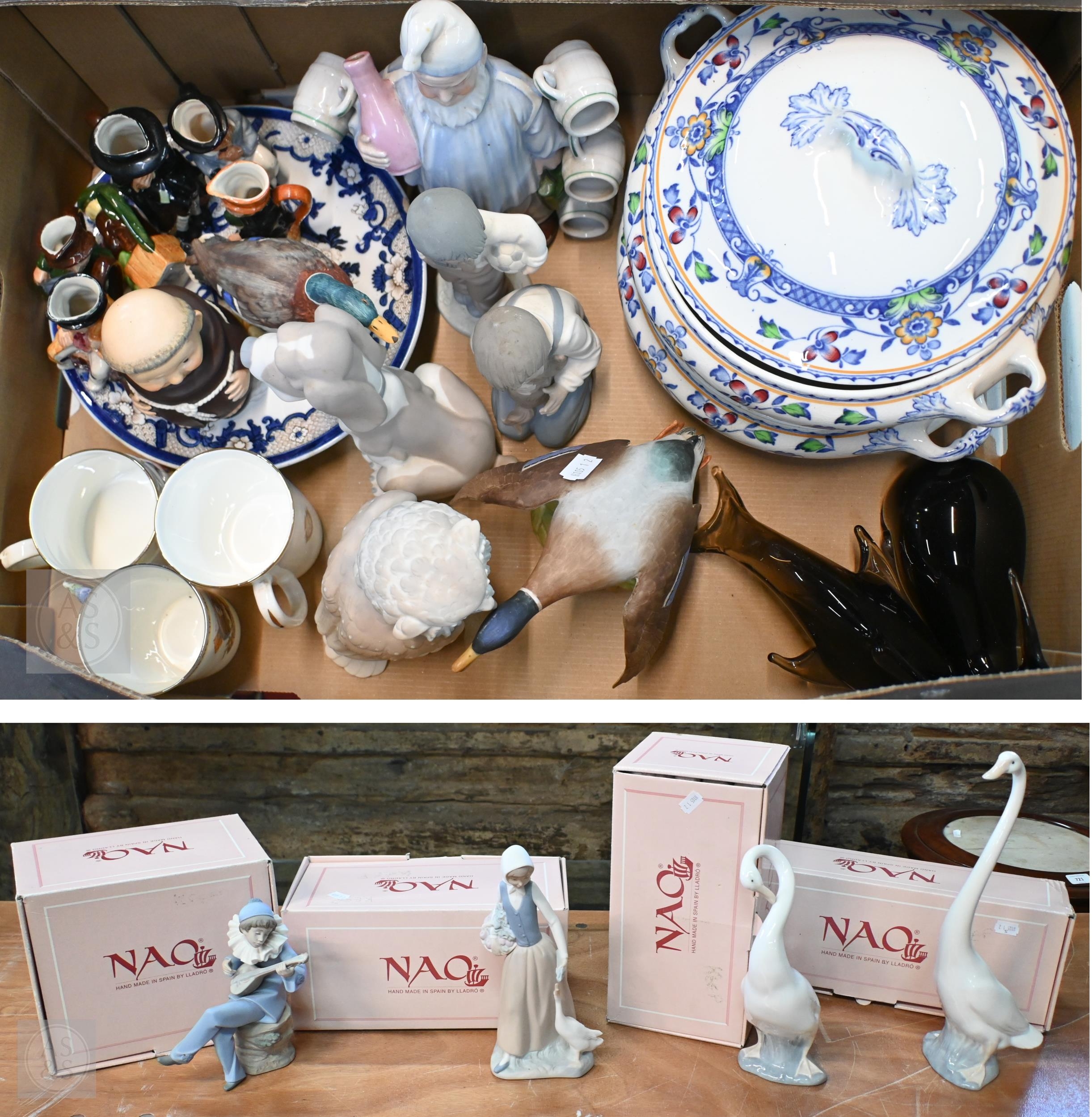 A Spode figure 'Mallard Settling' to/w eight Nao figures (four boxed), a Continental 'Night cap' figural flask with cups, various small character jugs etc (box)