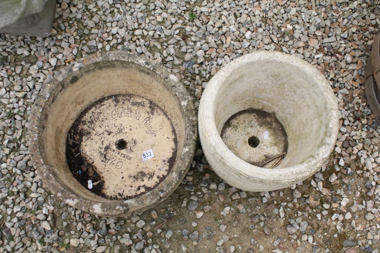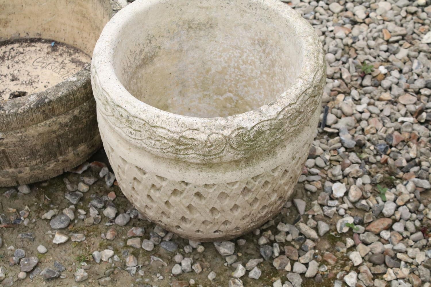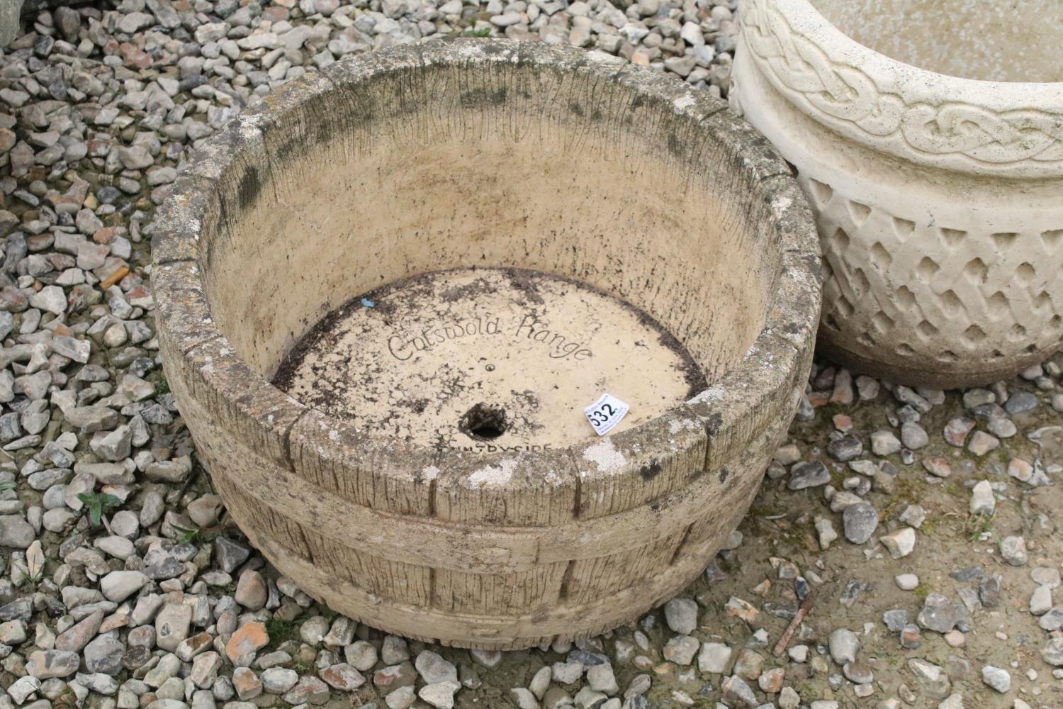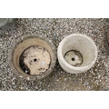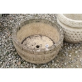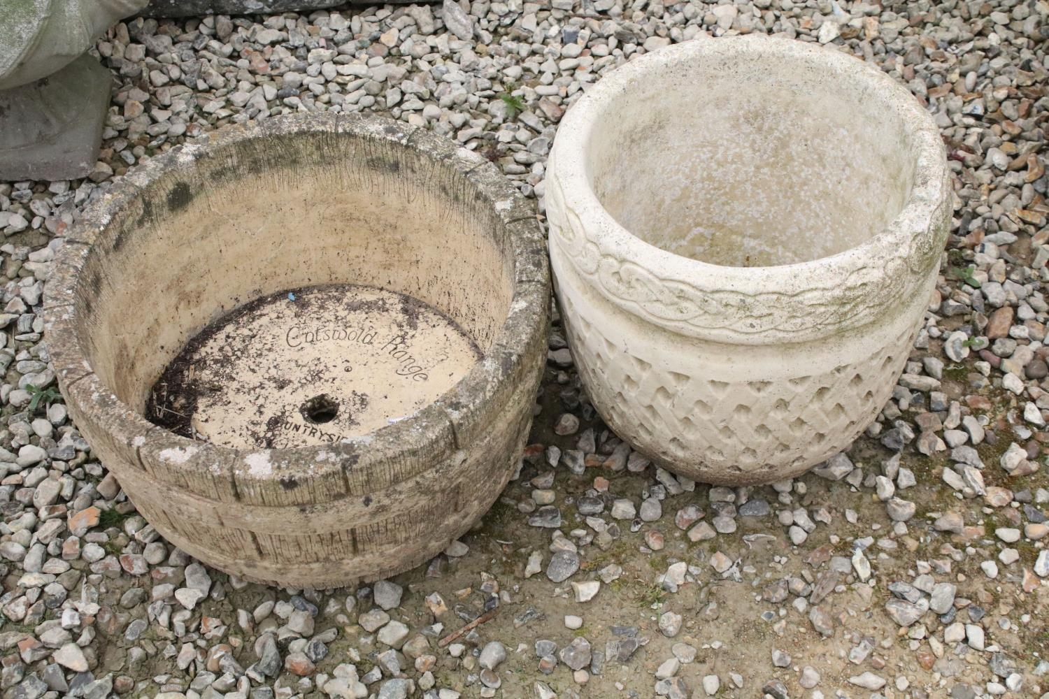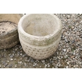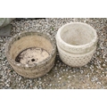 Cotswold Range circular stone garden planter, together with a Cotswold Studios Ltd example. Tallest approx 31cm