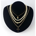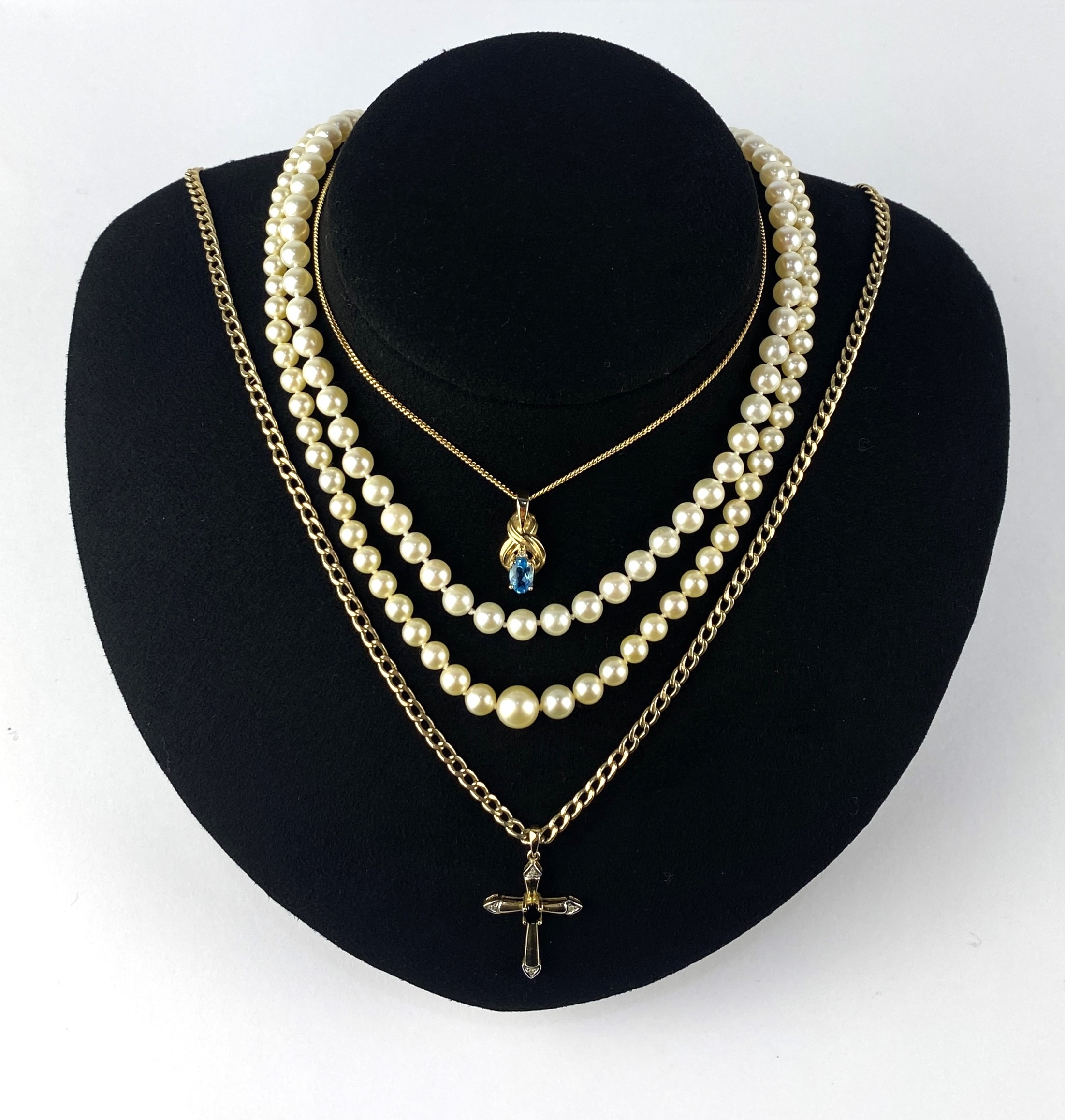 A group of jewellery comprising a 9ct gold sapphire and diamond pendant cross with a 9ct gold neckchain, a gold, blue topaz and diamond pendant detailed '14k' with a 9ct gold neckchain, combined gross weight 7.8g and two single row necklaces of graduated cultured pearls