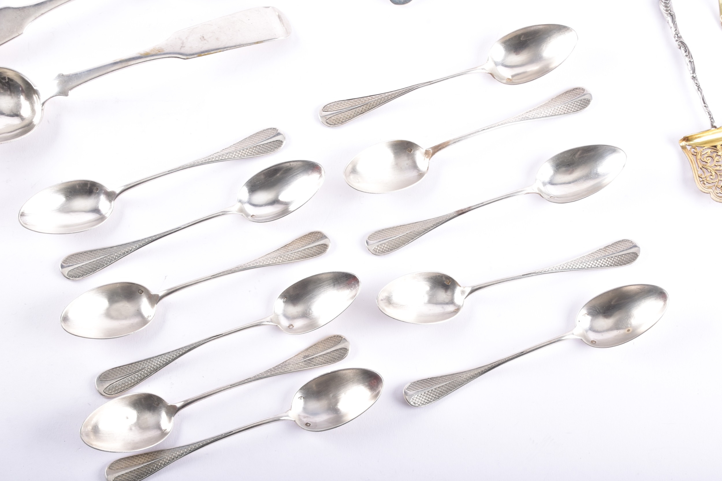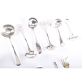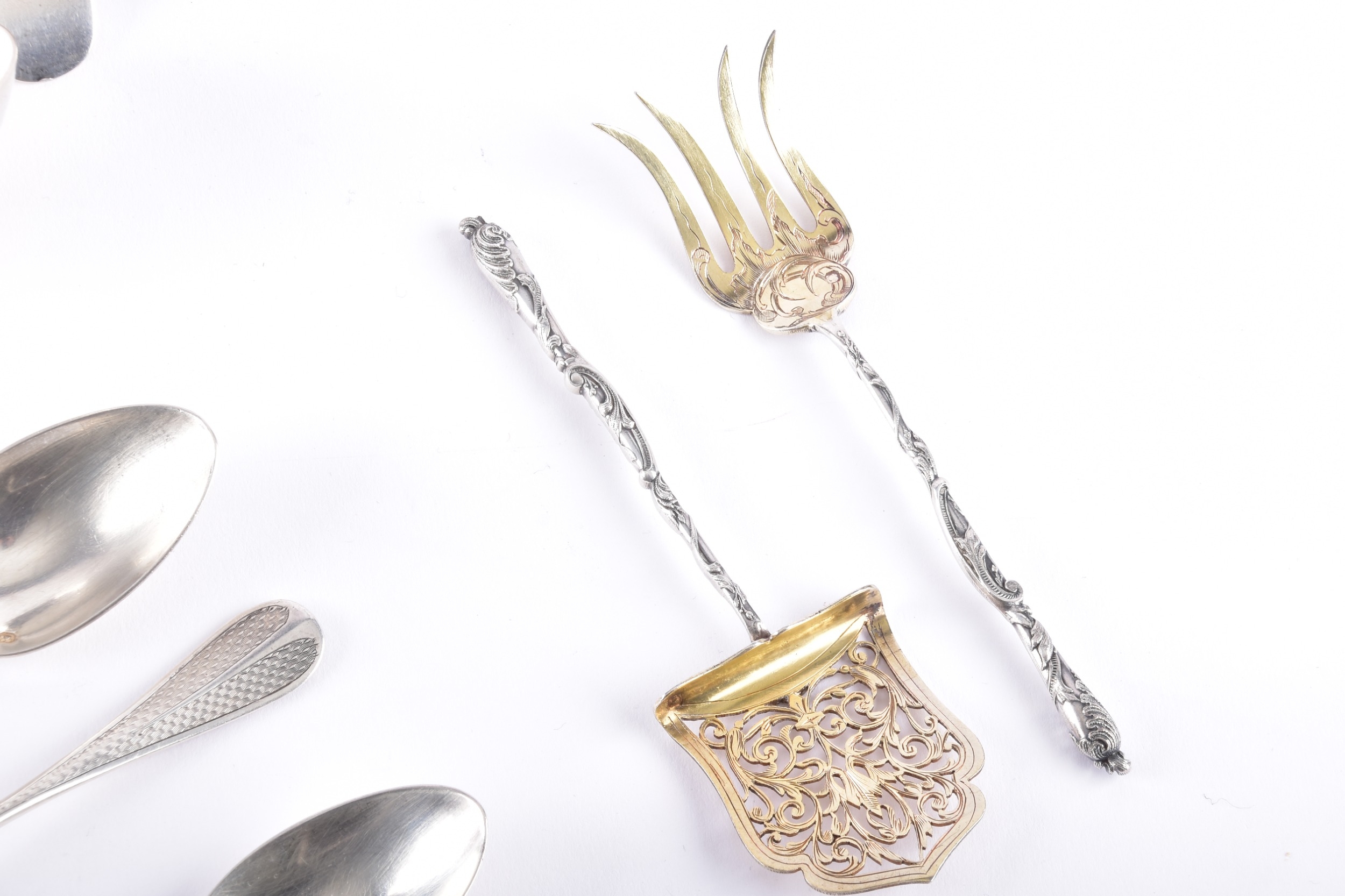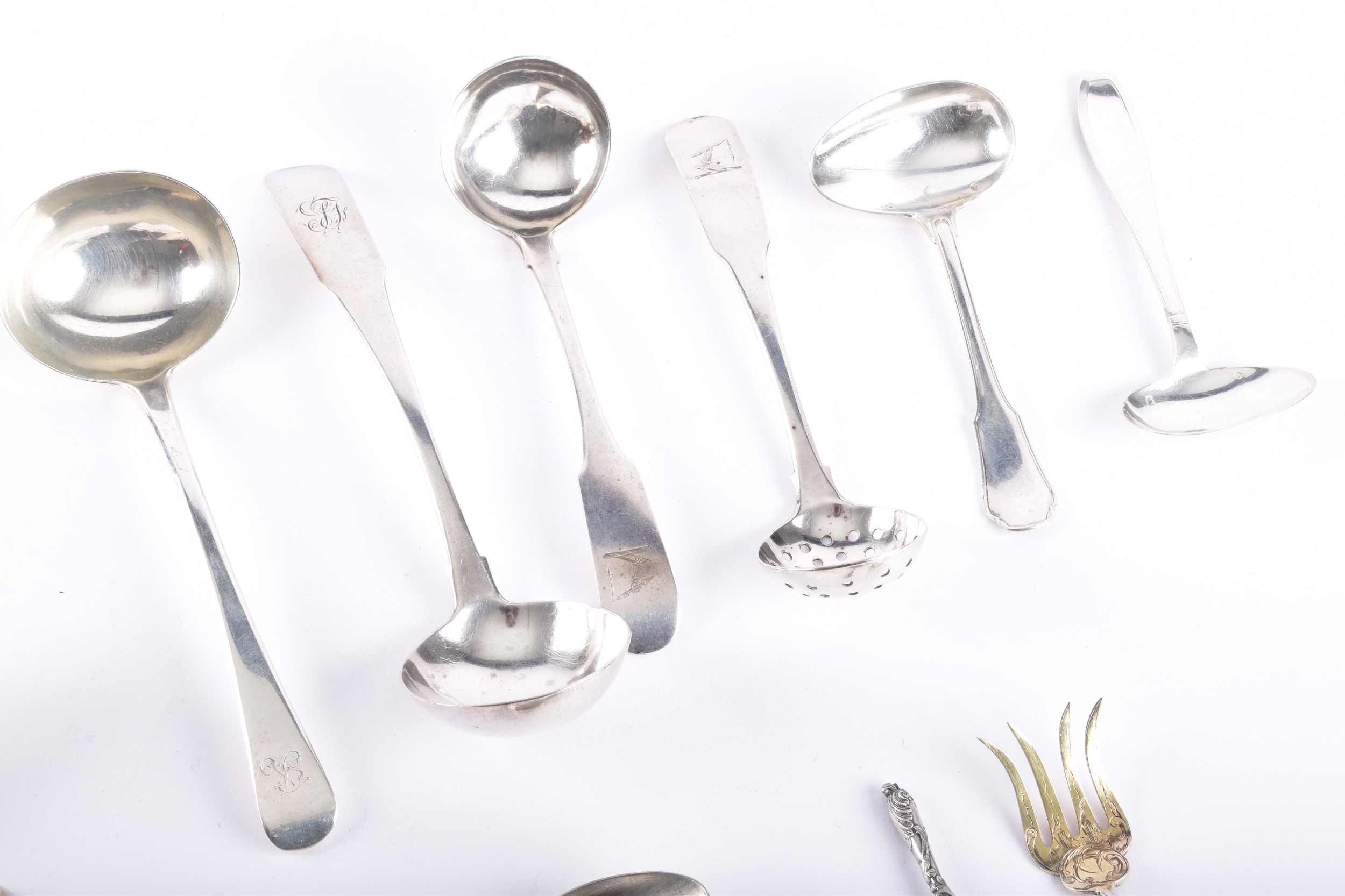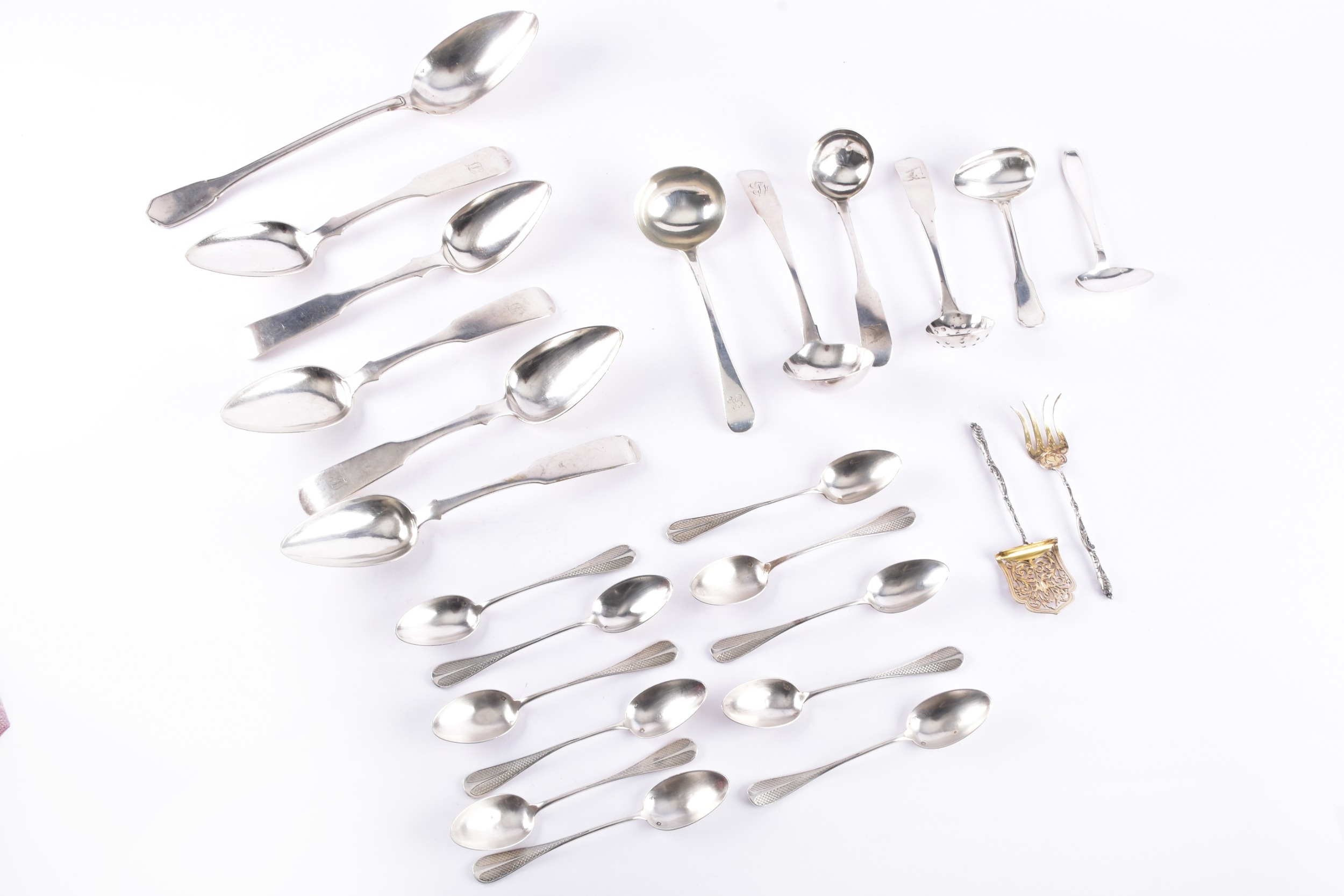 A collection of assorted silver and silver plate, including a set of four russian 84 silver serving spoons, together with a single Russian 84 silver serving spoon, a George III Irish silver sugar sifter and sauce ladle hallmarked for Dublin 1804, another Irish silver sauce ladle hallmarked for Dublin 1811, a George III sauce ladle hallmarked for London 1808, a collection of French pieces including eleven teaspoons, a small white metal gravy ladles and a large serving spoon with indistinct markings (all test as silver), an asparagus white metal gilt serving set (tests as silver), together with an assortment of silver plate.