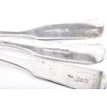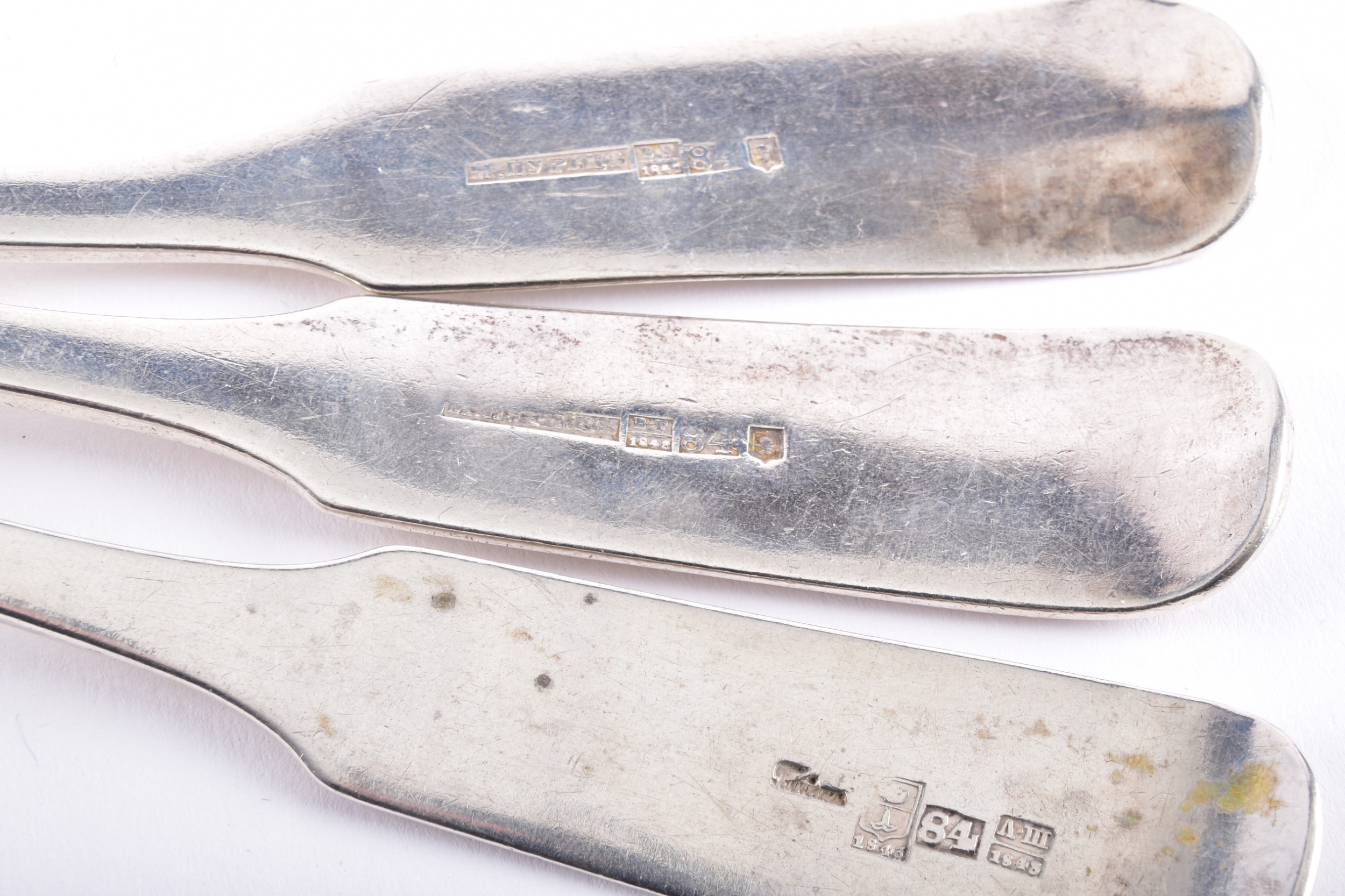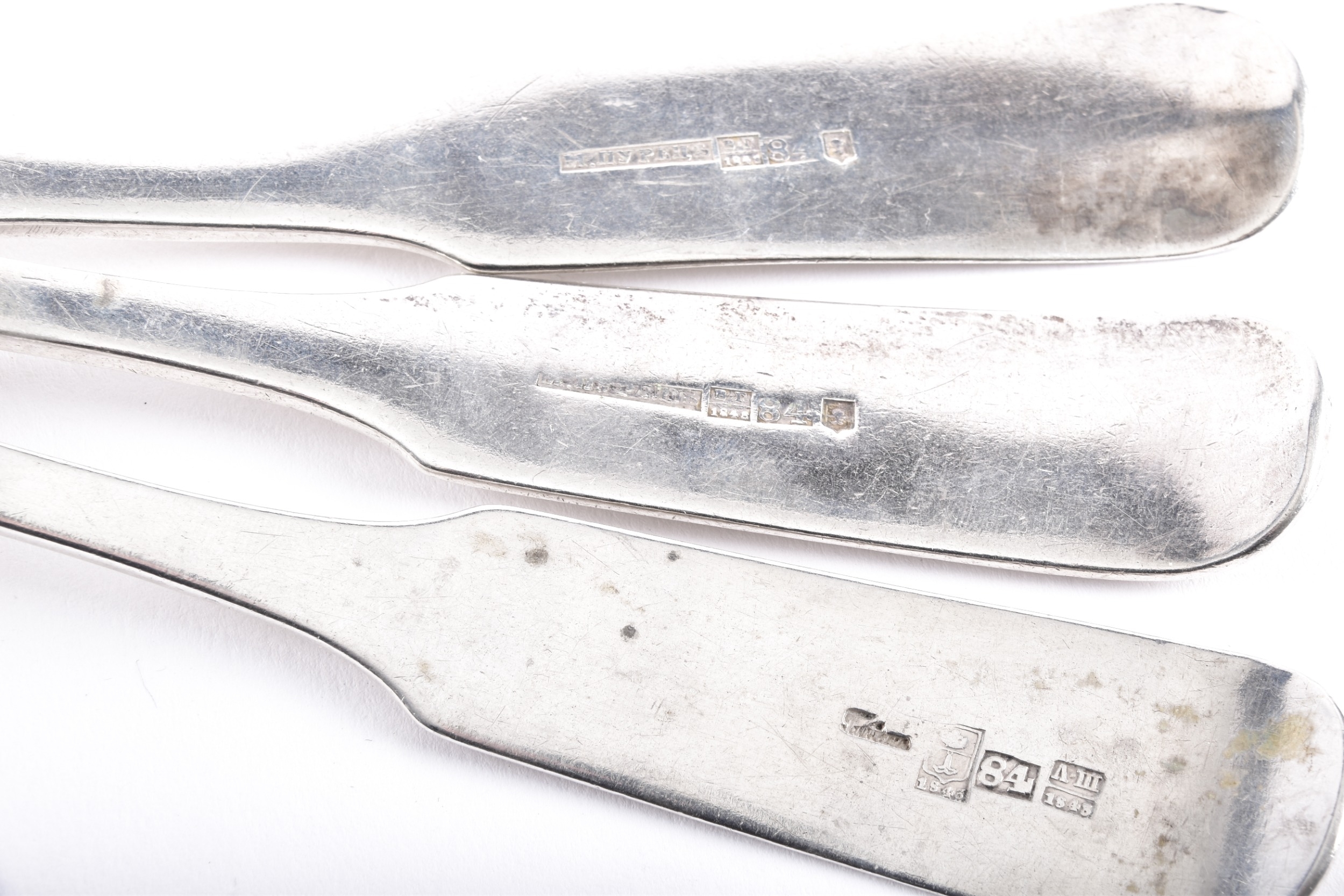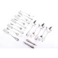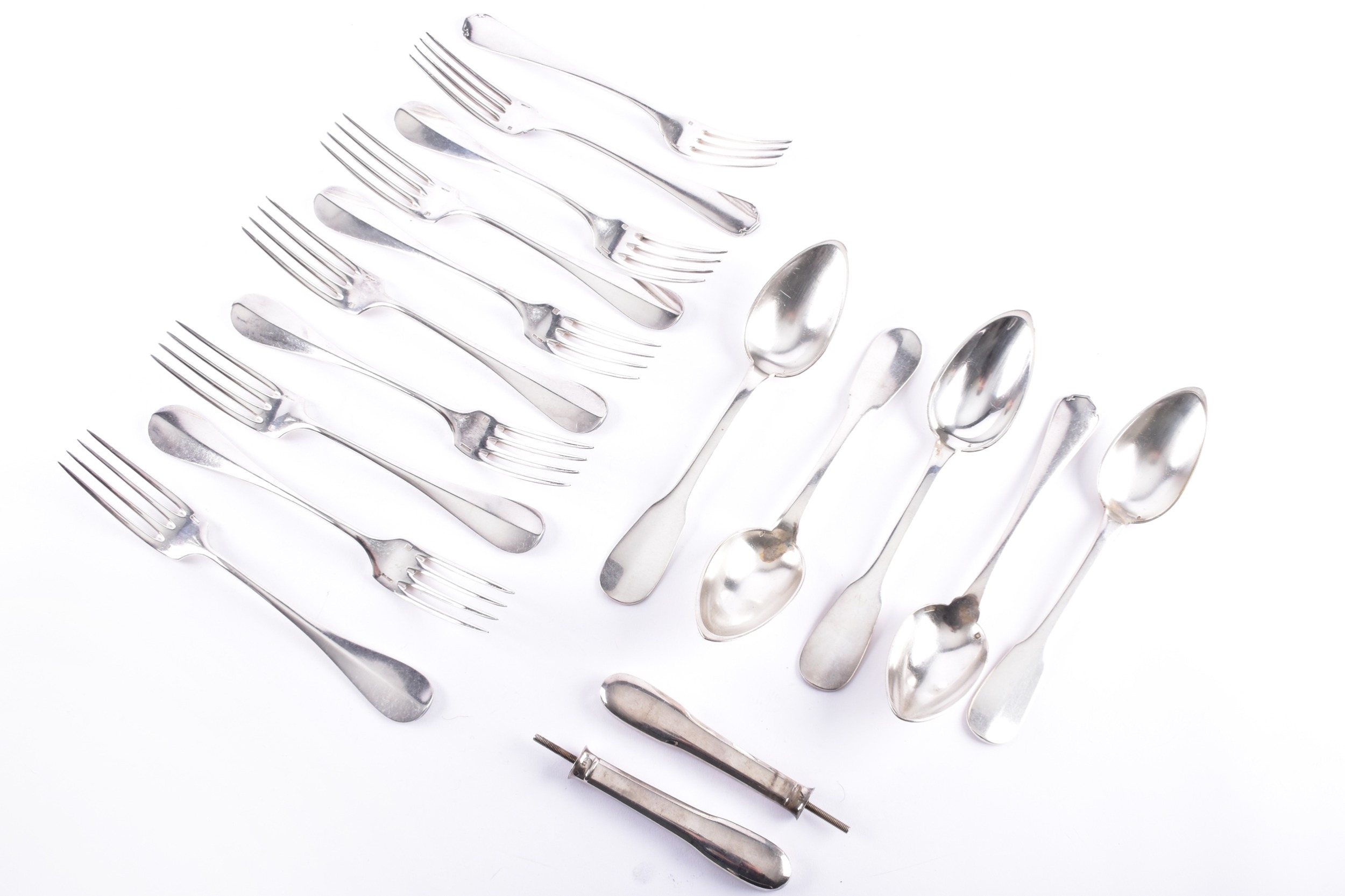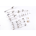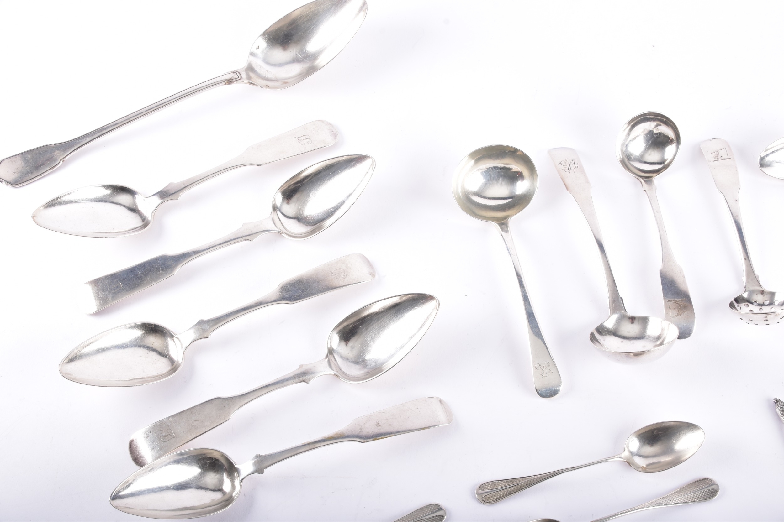 A collection of assorted silver and silver plate, including a set of four russian 84 silver serving spoons, together with a single Russian 84 silver serving spoon, a George III Irish silver sugar sifter and sauce ladle hallmarked for Dublin 1804, another Irish silver sauce ladle hallmarked for Dublin 1811, a George III sauce ladle hallmarked for London 1808, a collection of French pieces including eleven teaspoons, a small white metal gravy ladles and a large serving spoon with indistinct markings (all test as silver), an asparagus white metal gilt serving set (tests as silver), together with an assortment of silver plate.