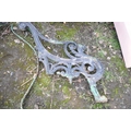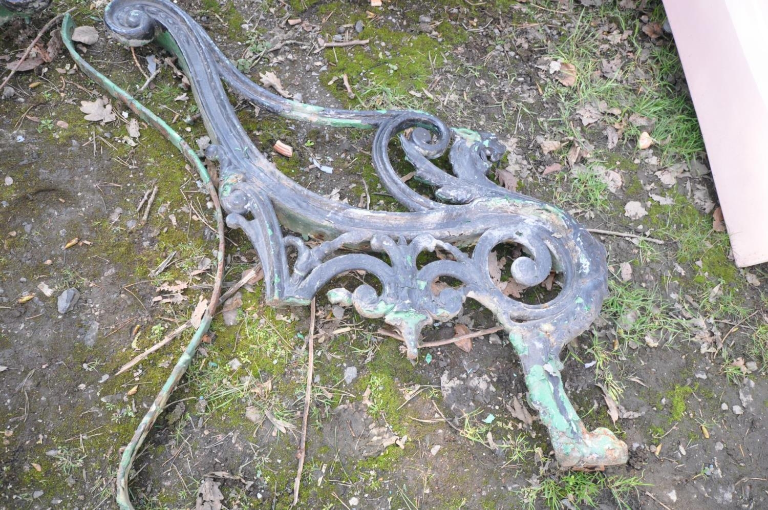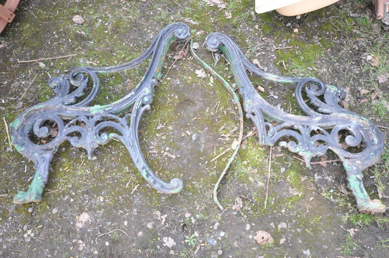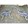 A PAIR OF HEAVY CAST IRON BENCH ENDS (condition:-one missing one back leg to one end)