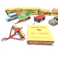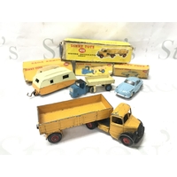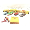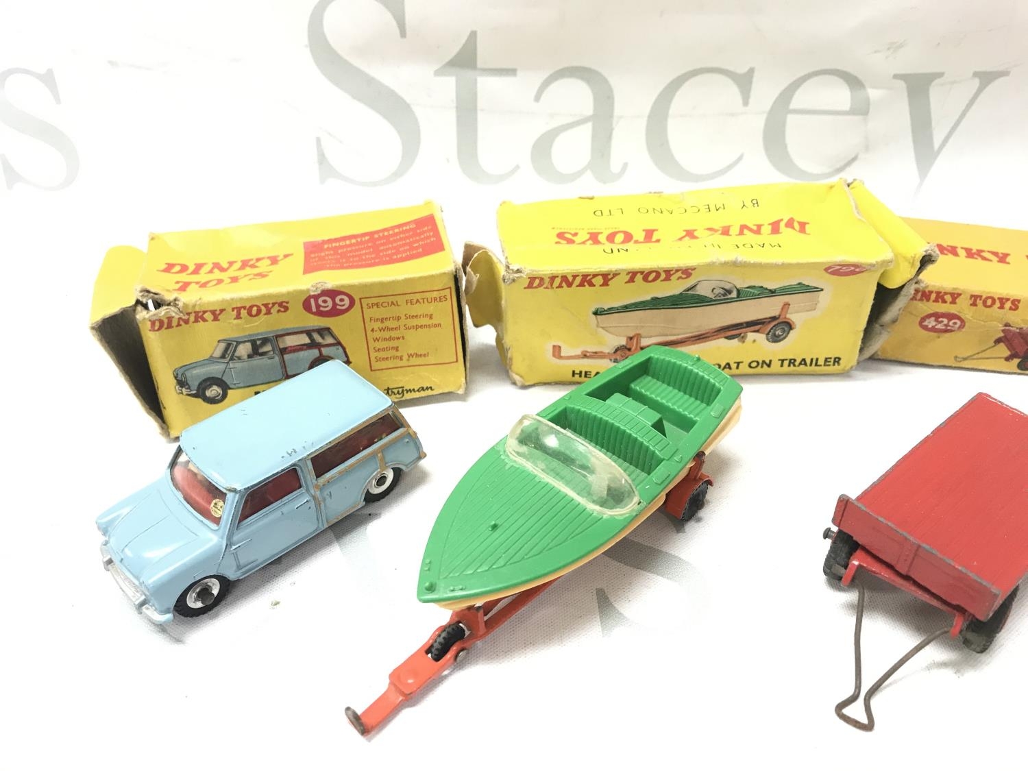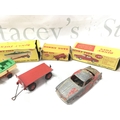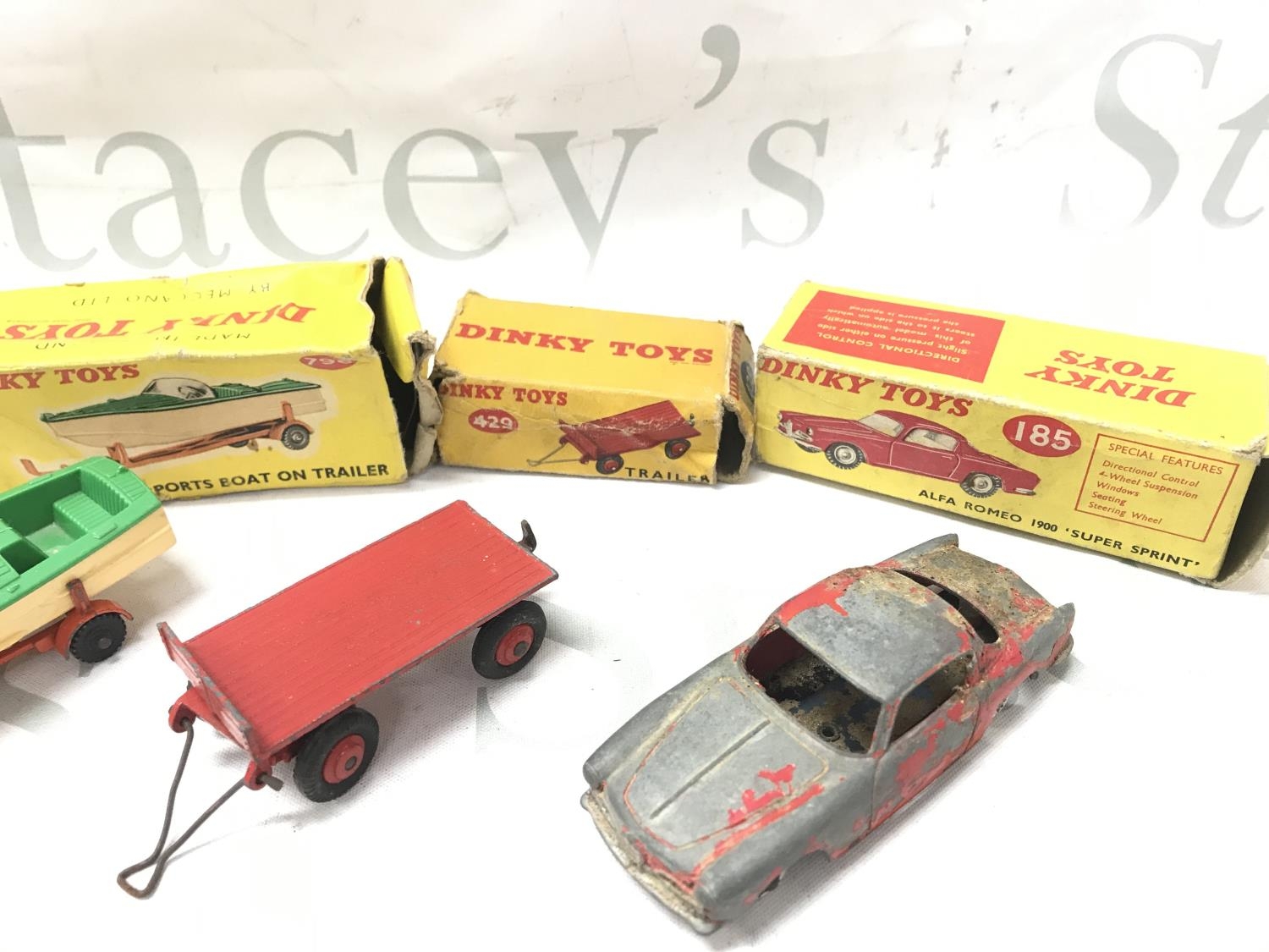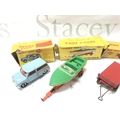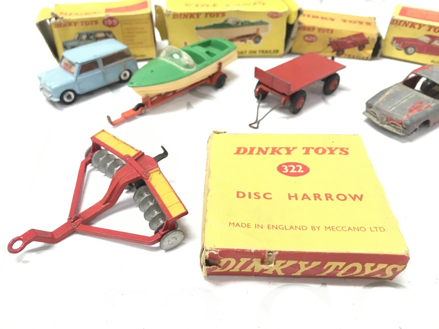 5 Boxed Playworn Dinky Toy. Boxes Are Worn. A Austin Seven #199. A Healey Sports Boat On Trailer #796. A Trailer #429. A Alfa Romeo 1900 #185 And A Disc Harrow #322. No Reserve.
