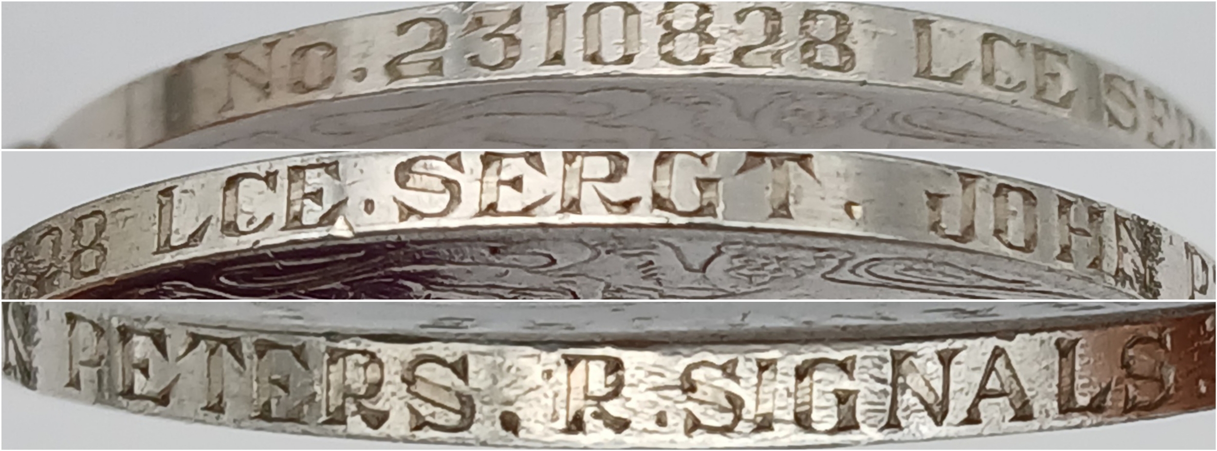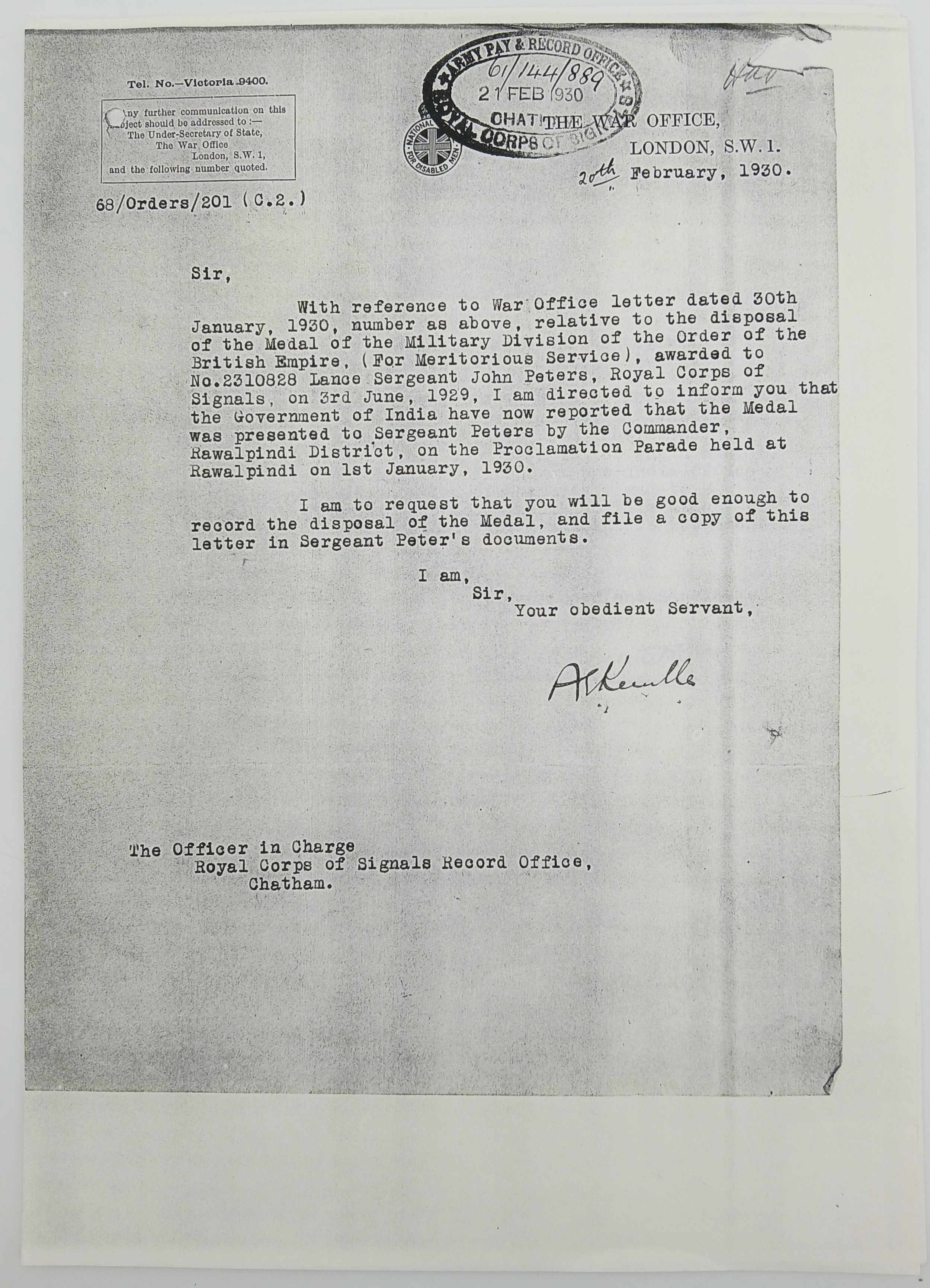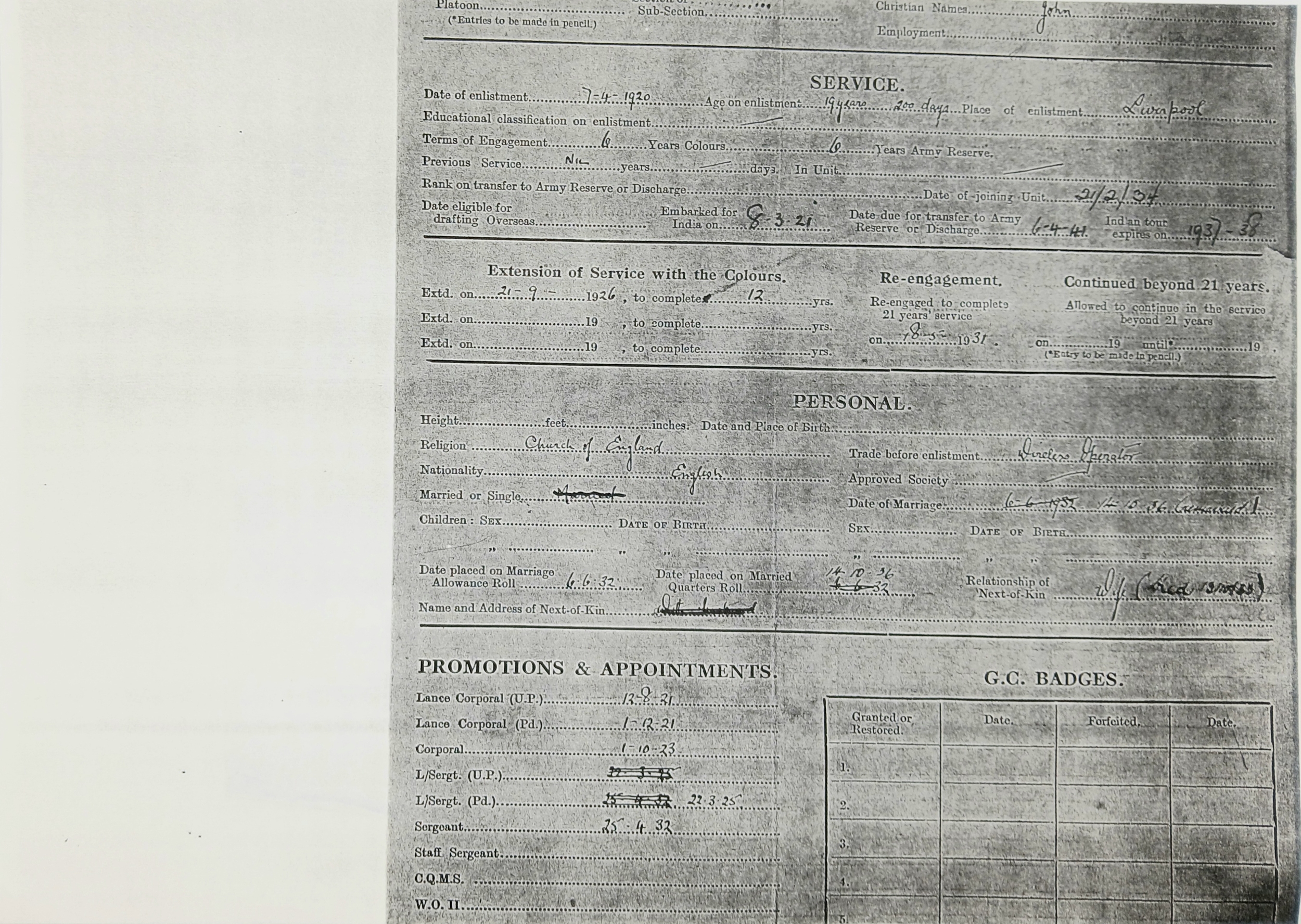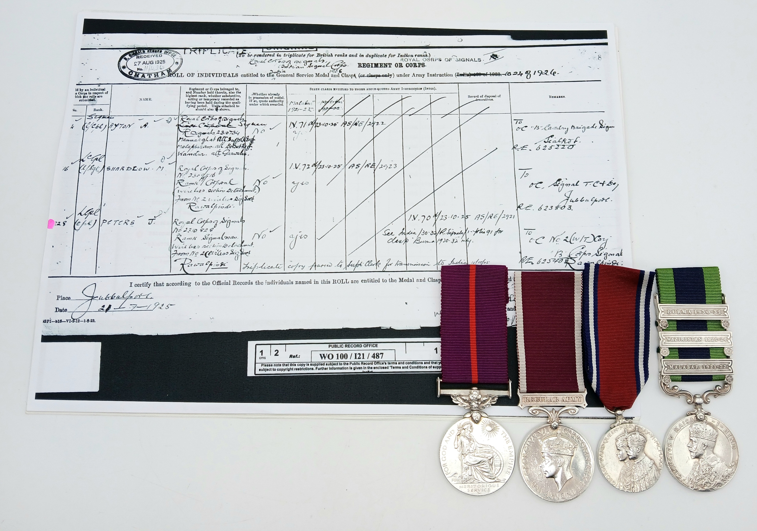 John Peters was born on 19 September 1900 in Woolton, Lancashire. A wireless operator by trade, he enlisted in the Royal Engineers (Signals) at Liverpool on 7 April 1920, transferring to the newly- formed Royal Corps of Signals on 19 November 1920. He was posted to India on 8 March 1921, disembarking at Bombay on 30 March and remained in India for the next sixteen years (apart from a 6-month furlough in 1932) until posted back to the UK, to the Northern Ireland Signal Squadron, on 20 November 1937. During his service in India he was promoted through the ranks to Sergeant (on 25 April 1932) and took part in the operations to suppress the Moplah Rebellion in Malabar in 1921-22, suppression of depredations by Waziri tribesmen in Waziristan from 1921-24 and counter-insurgency operations against the Saya San Rebellion in Burma from 1930-32. He was awarded the BEM on 3 June 1929, King George V’s Silver Jubilee Medal in 1935 and the Long Service and Good Conduct Medal in 1938 (date not recorded). He was discharged at his own request after 18 years’ service on 10 June 1938, with his conduct assessed as ‘Exemplary’.