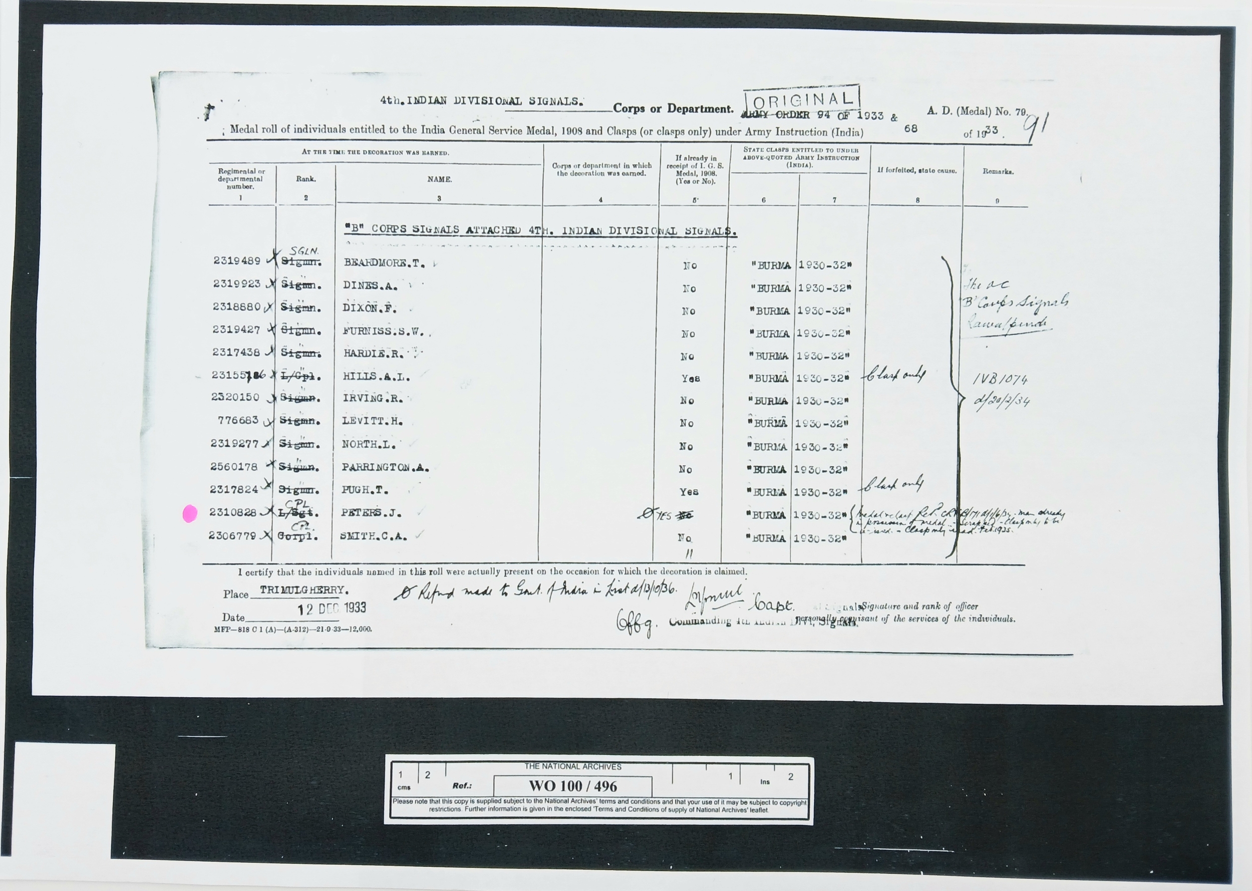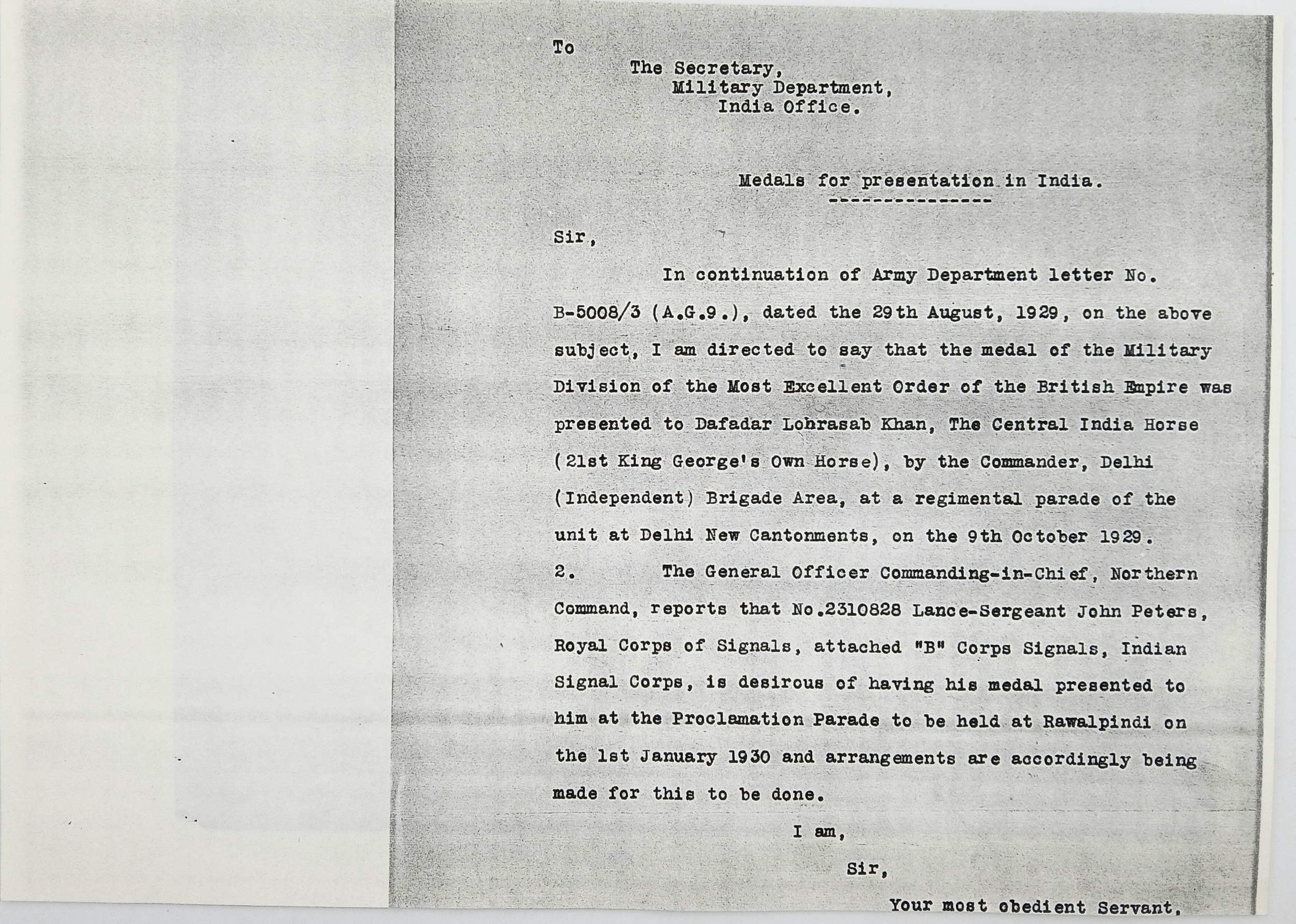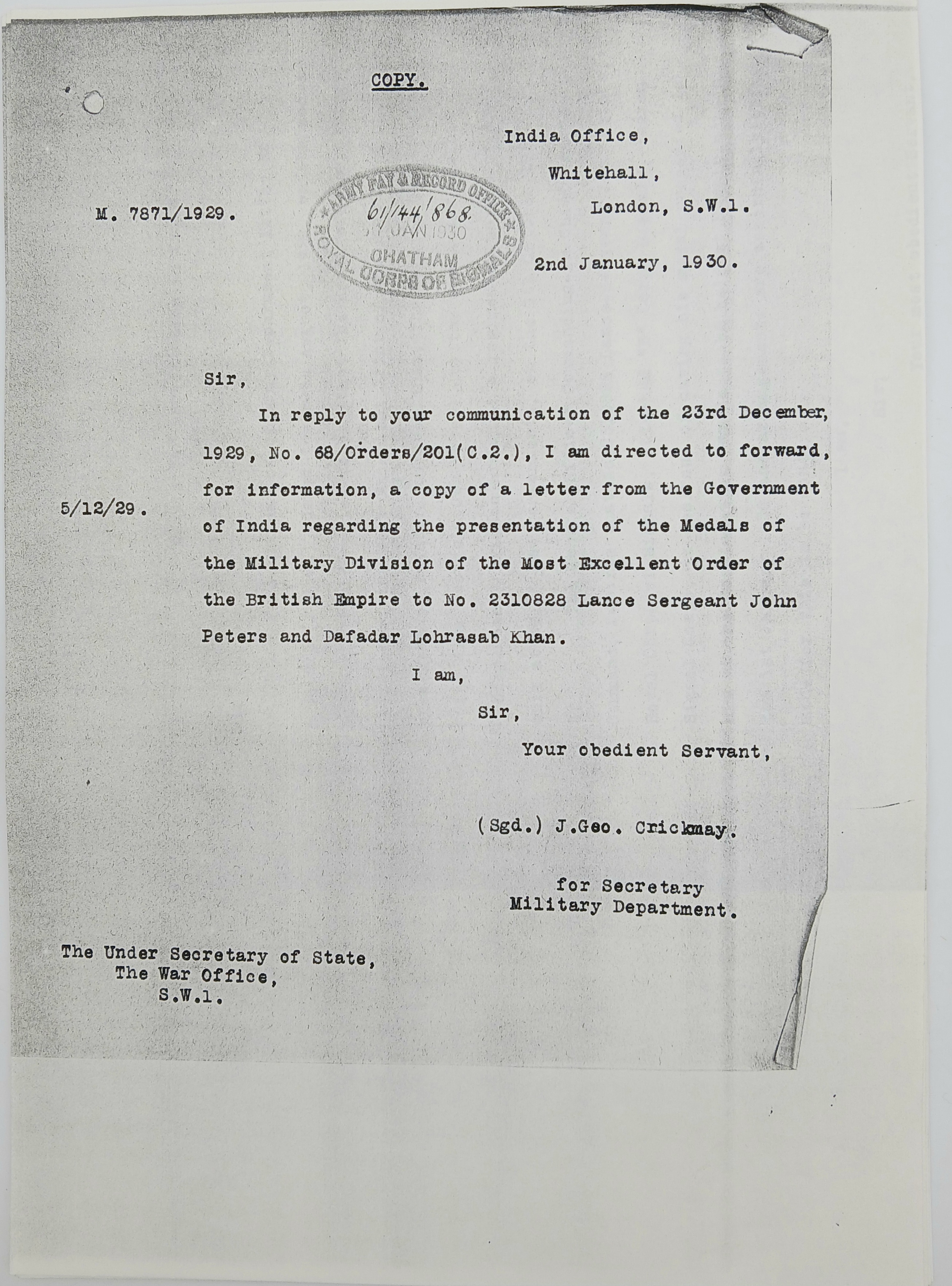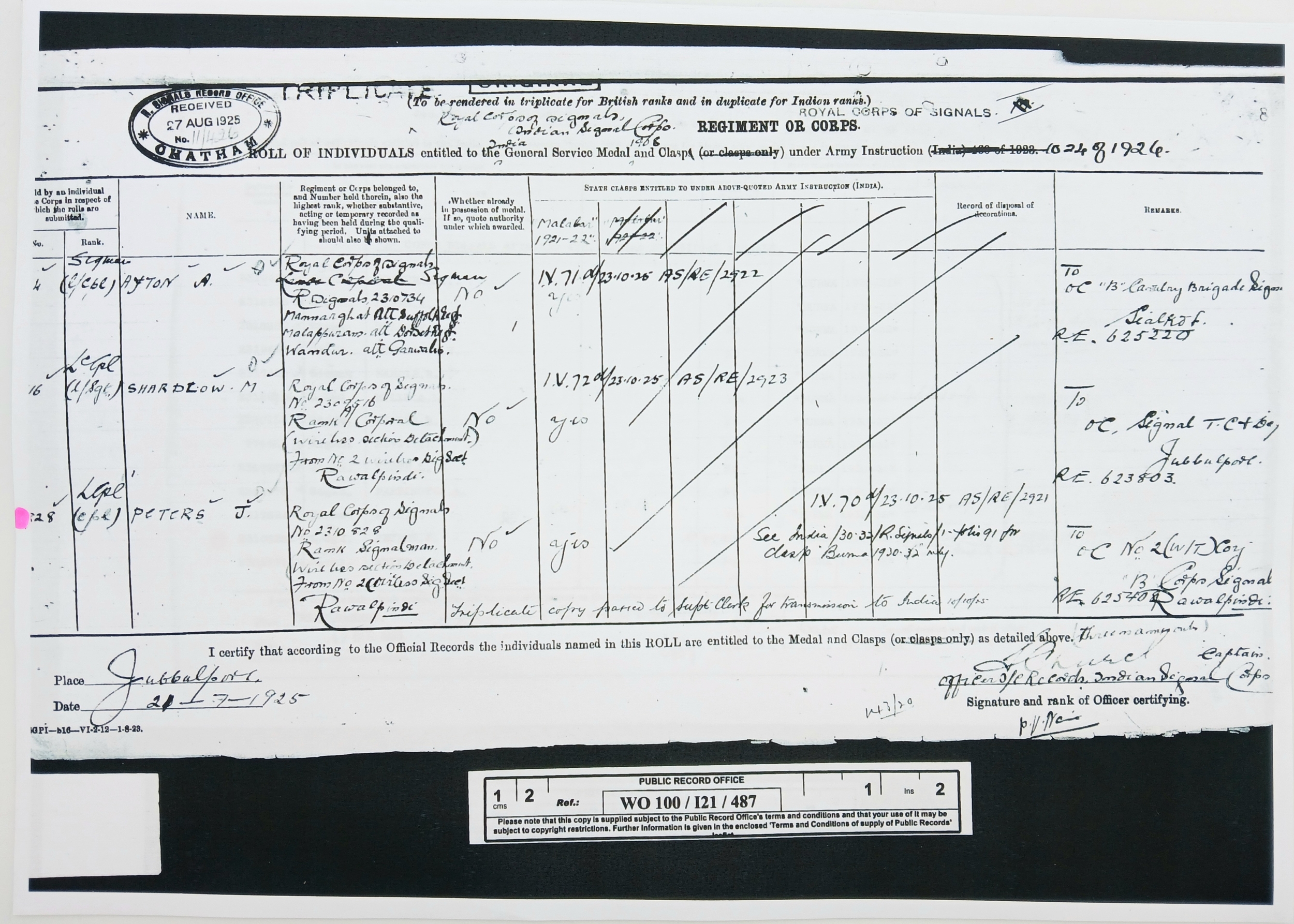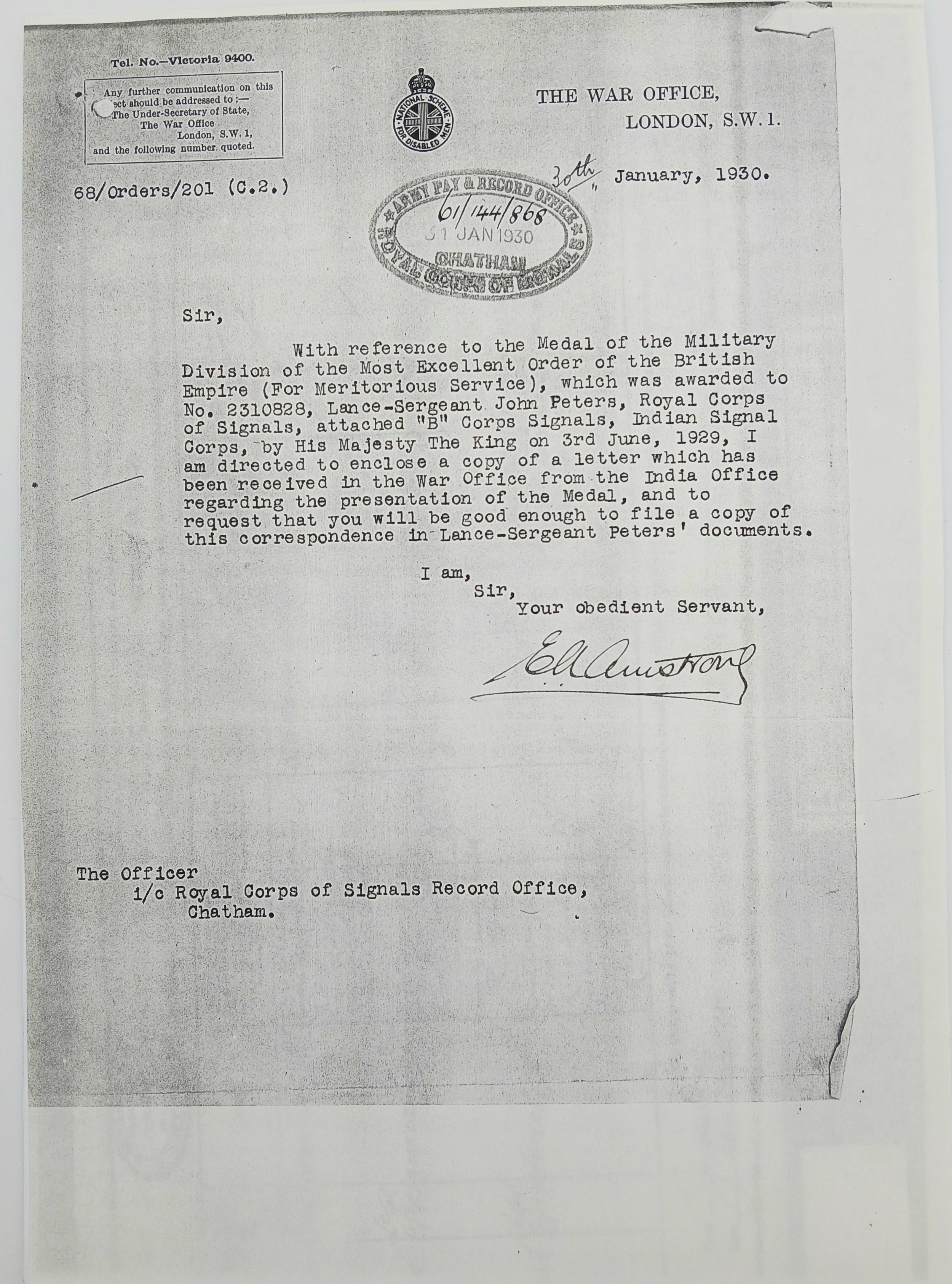 John Peters was born on 19 September 1900 in Woolton, Lancashire. A wireless operator by trade, he enlisted in the Royal Engineers (Signals) at Liverpool on 7 April 1920, transferring to the newly- formed Royal Corps of Signals on 19 November 1920. He was posted to India on 8 March 1921, disembarking at Bombay on 30 March and remained in India for the next sixteen years (apart from a 6-month furlough in 1932) until posted back to the UK, to the Northern Ireland Signal Squadron, on 20 November 1937. During his service in India he was promoted through the ranks to Sergeant (on 25 April 1932) and took part in the operations to suppress the Moplah Rebellion in Malabar in 1921-22, suppression of depredations by Waziri tribesmen in Waziristan from 1921-24 and counter-insurgency operations against the Saya San Rebellion in Burma from 1930-32. He was awarded the BEM on 3 June 1929, King George V’s Silver Jubilee Medal in 1935 and the Long Service and Good Conduct Medal in 1938 (date not recorded). He was discharged at his own request after 18 years’ service on 10 June 1938, with his conduct assessed as ‘Exemplary’.