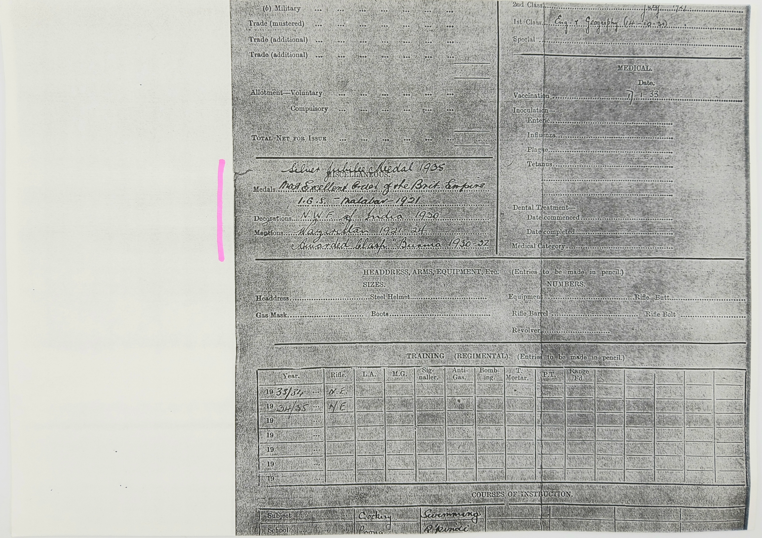 Note: The insignia of the Order of the British Empire were updated in 1937 and a new ribbon was instituted. Existing military recipients were offered the choice of retaining their original insignia, but to be worn with the new ribbon, or exchanging it for the new insignia, at cost, although it is not clear when this ruling became effective. Anecdotal evidence indicates that the majority of military recipients opted for the first choice but Sgt Peters served on in the Army until 1938 and continued to wear his BEM with the original ribbon.