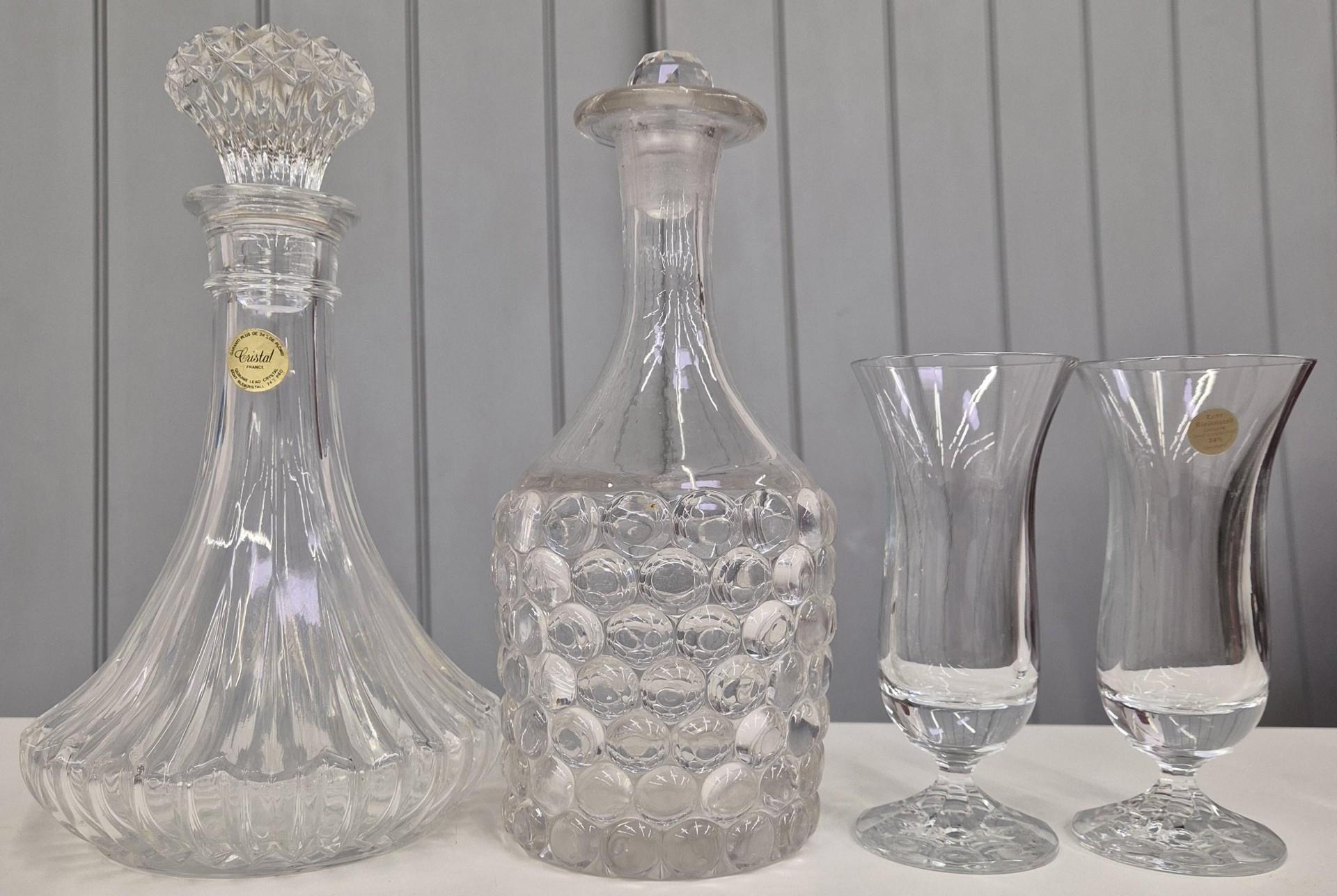 A pair of German 'Echt Bleikristall' sherry glasses, together with a lead crystal ship's decanter & a hobnail spirit decanter.