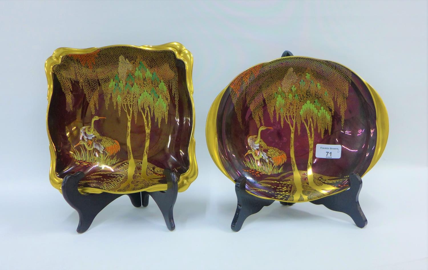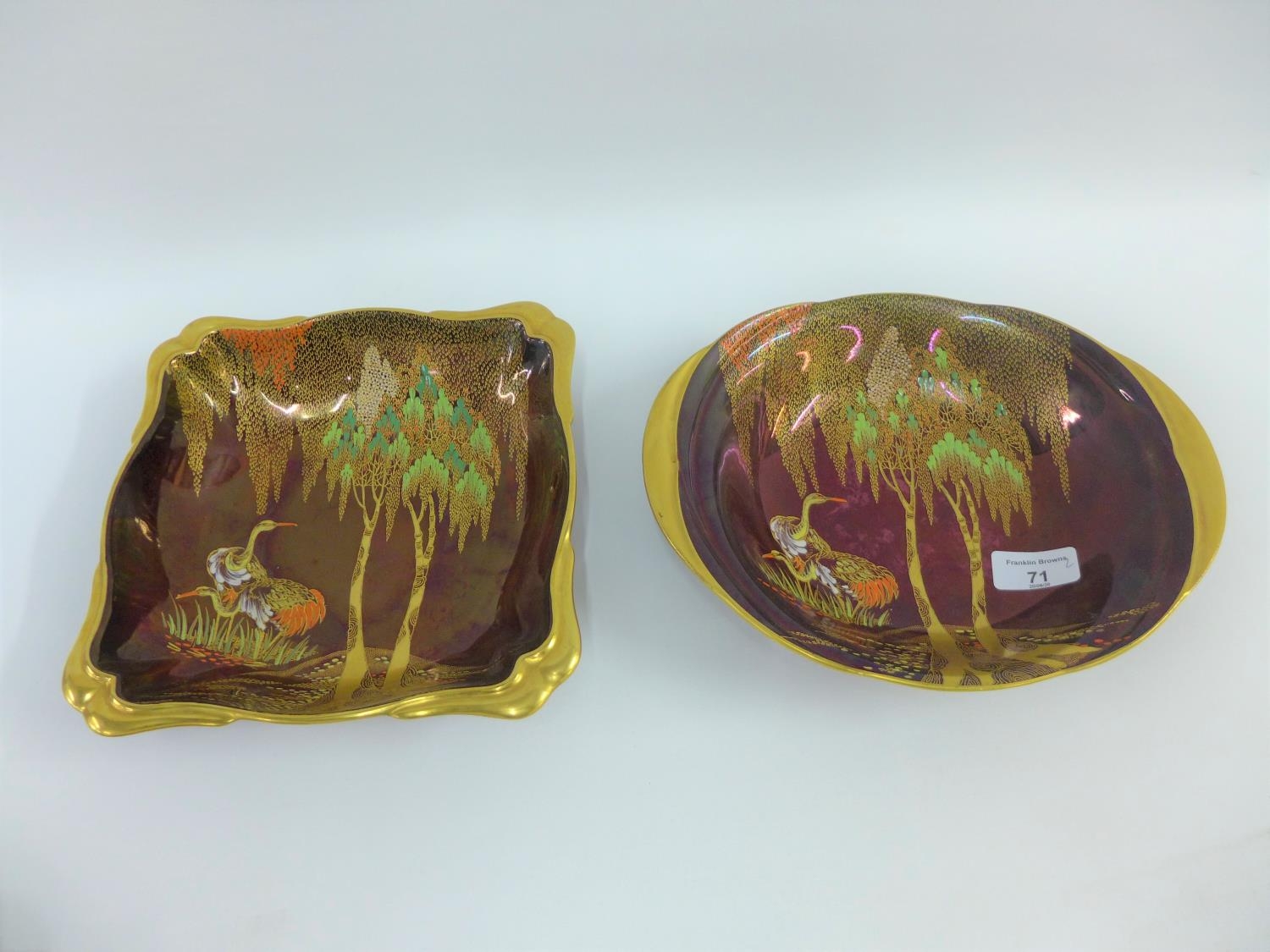 Two Carlton Ware Weeping Willow patterned Rouge Royale bowls, one square the other oval, with printed backstamps, largest 26cm wide (2)