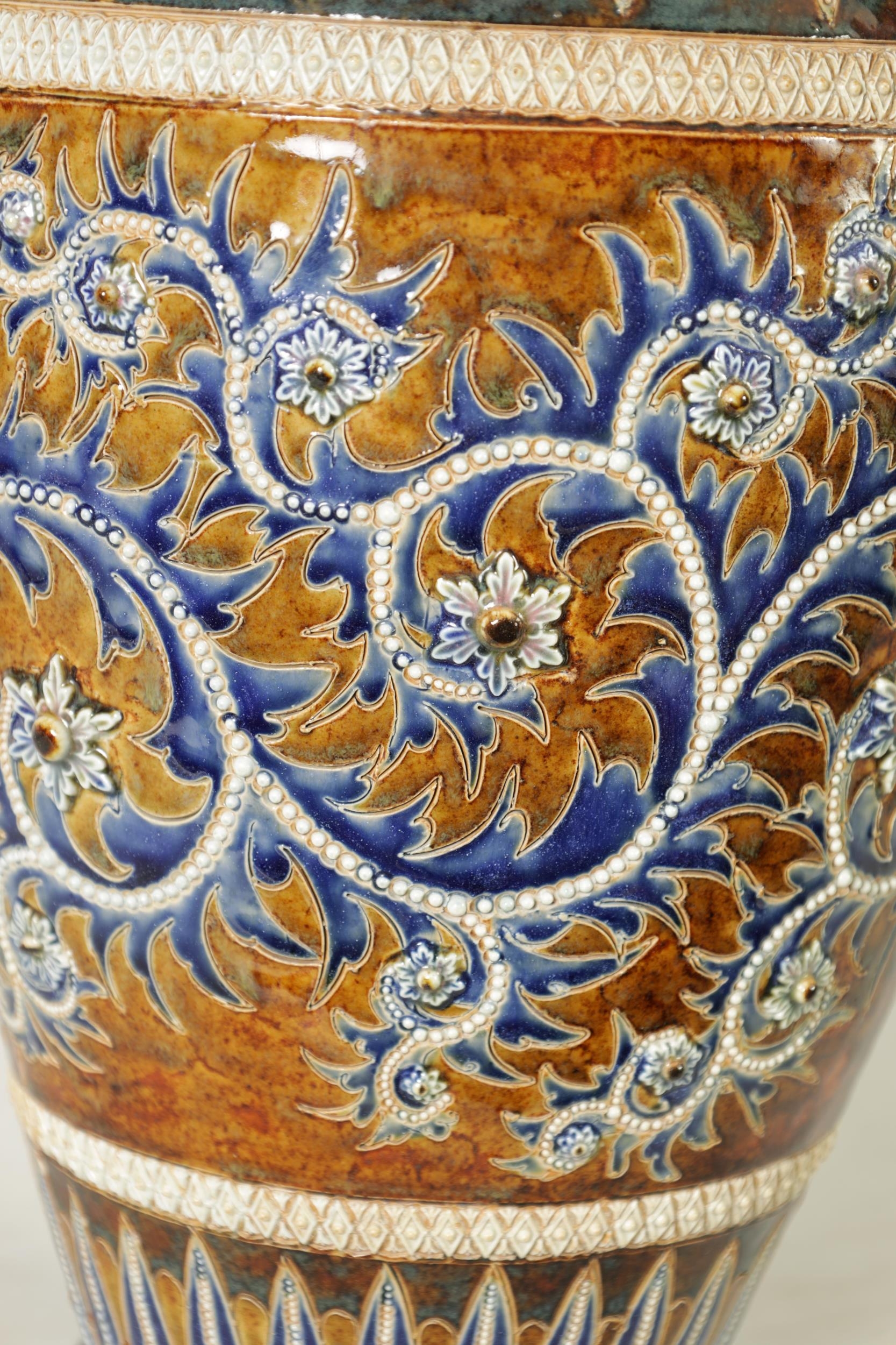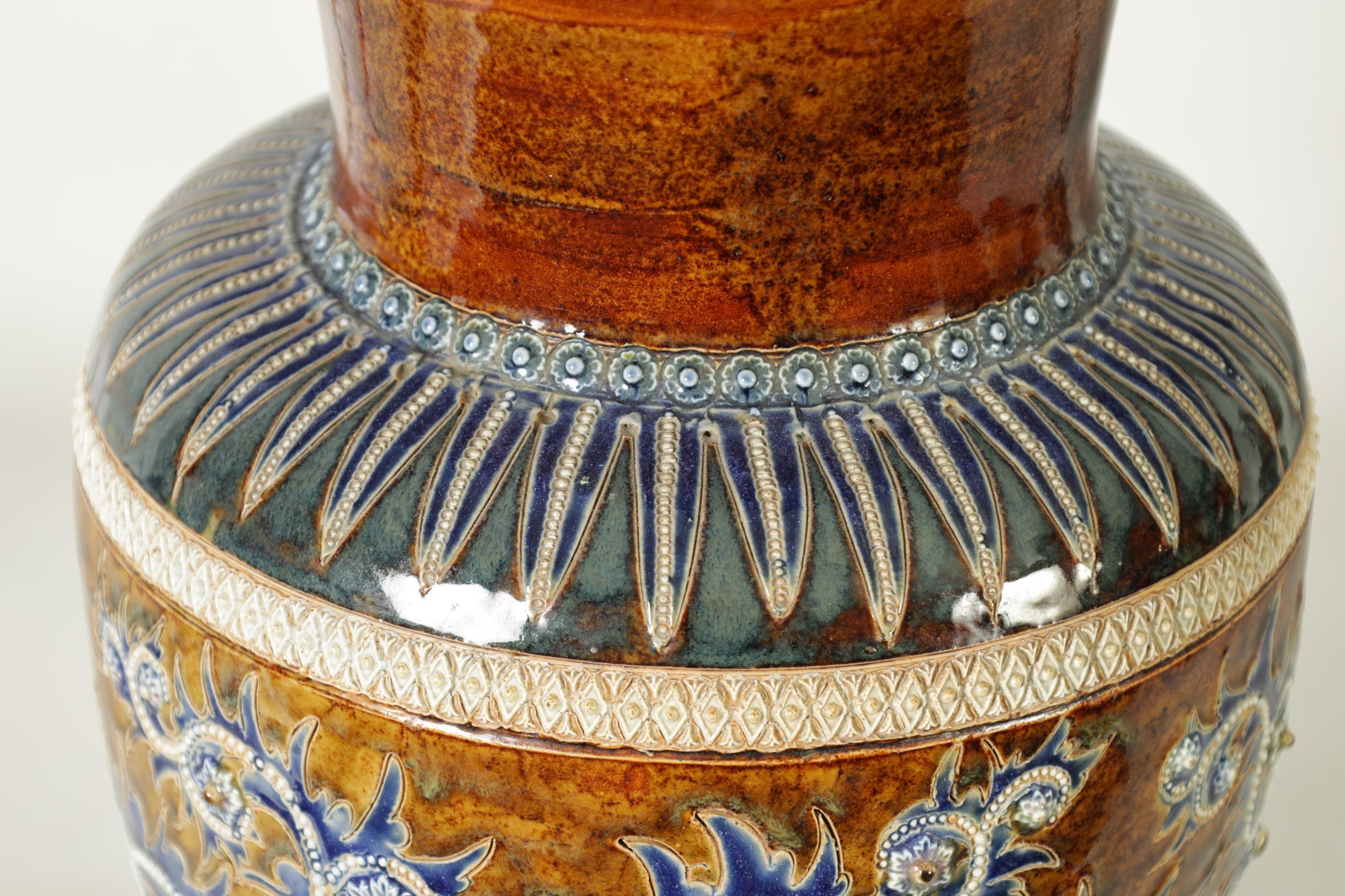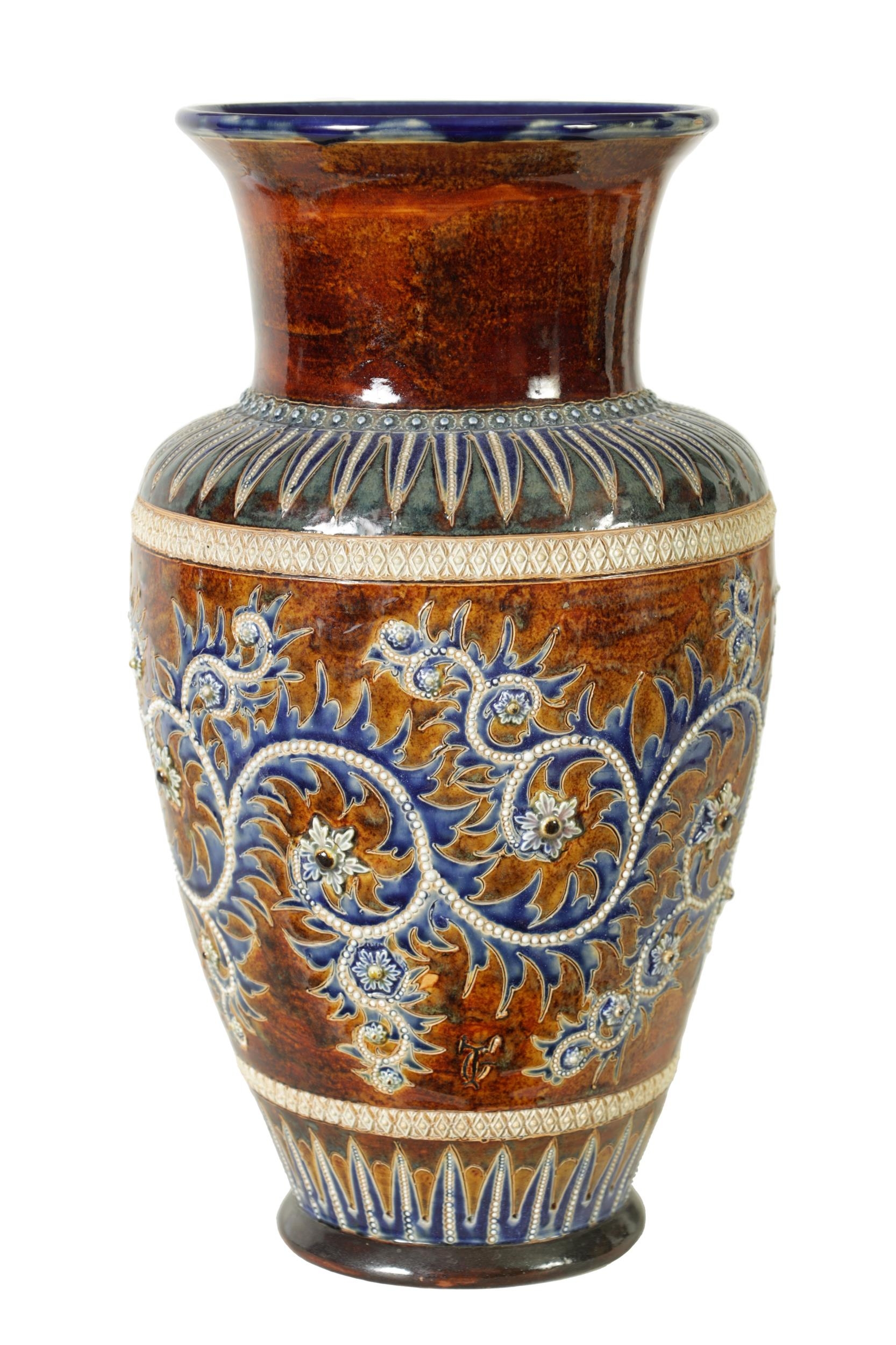 AN IMPRESSIVE 19TH CENTURY DOULTON LAMBETH TAPERING SHOULDERED STONEWARE VASE BY GEORGE TINWORTH with flared rim, incised spiked leaf foot band beneath an all-round gadroon edged scrolling foliated design set with raised flower heads, the matching shoulder beneath a mottled brown glazed neck - incised monogram signature. (40cm high)
