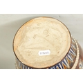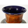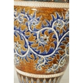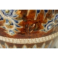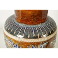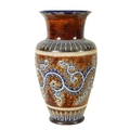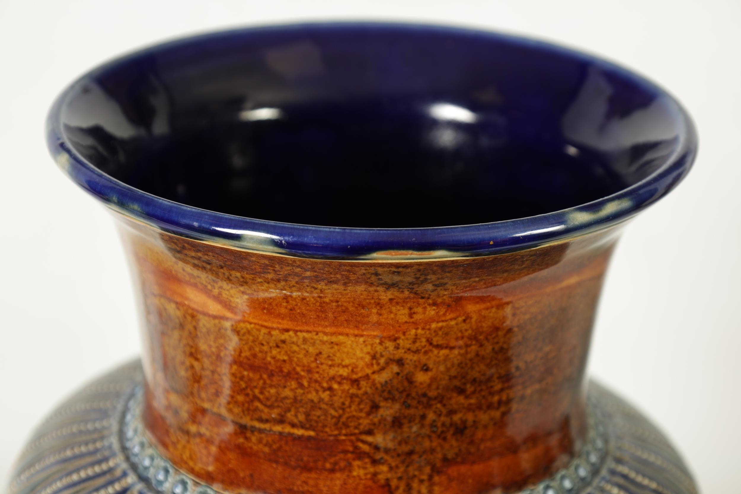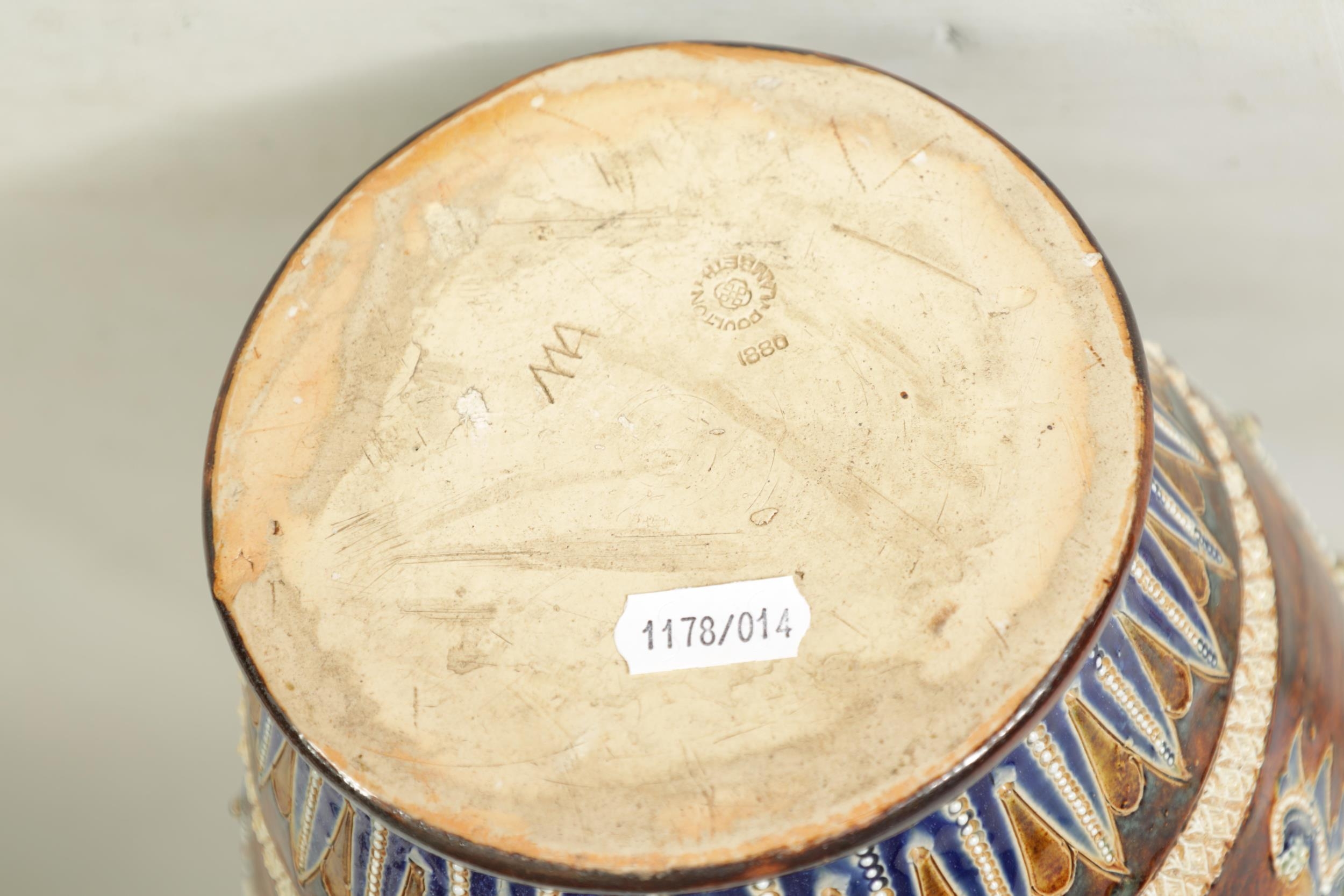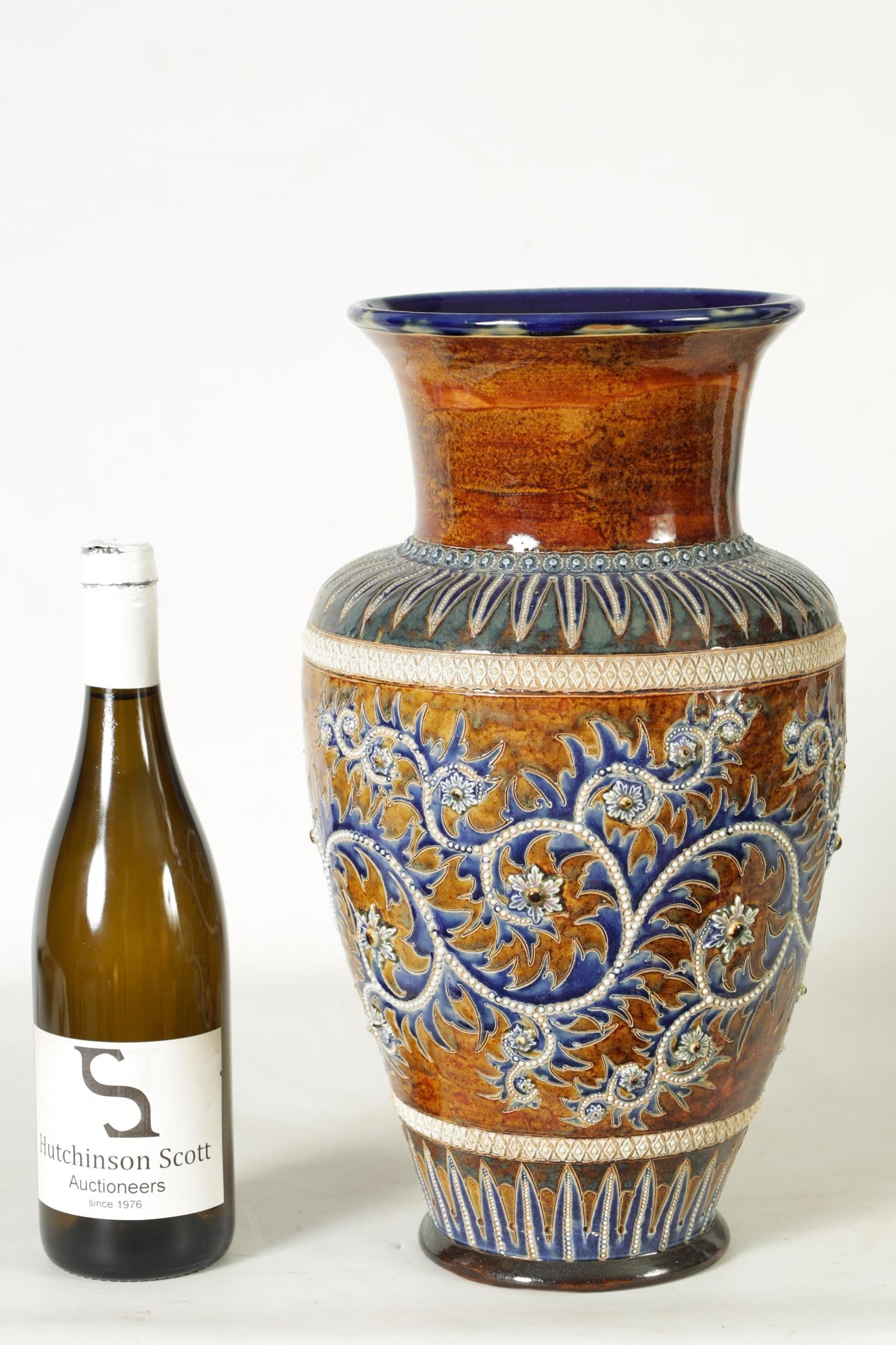 AN IMPRESSIVE 19TH CENTURY DOULTON LAMBETH TAPERING SHOULDERED STONEWARE VASE BY GEORGE TINWORTH with flared rim, incised spiked leaf foot band beneath an all-round gadroon edged scrolling foliated design set with raised flower heads, the matching shoulder beneath a mottled brown glazed neck - incised monogram signature. (40cm high)