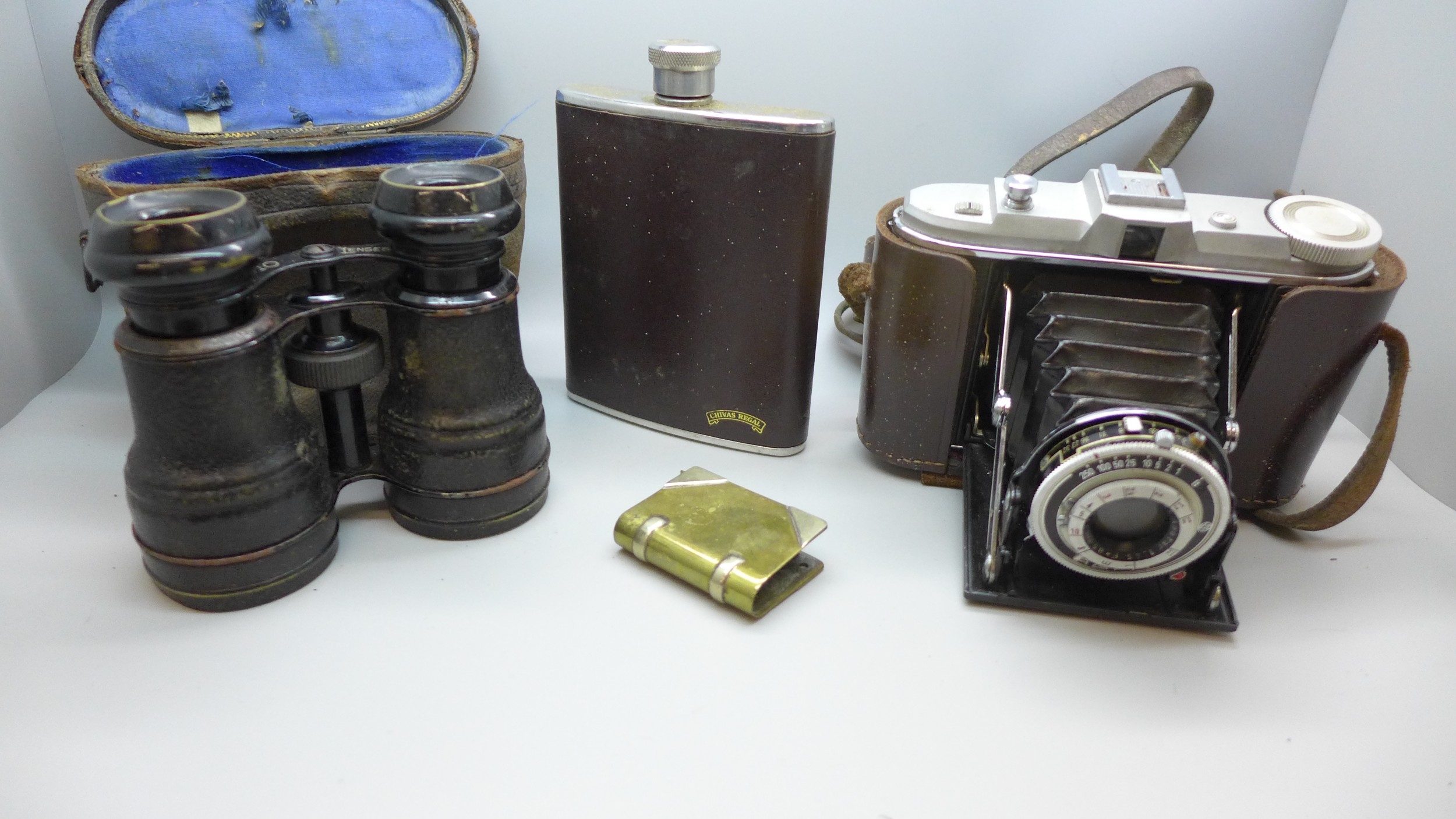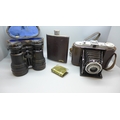 An Agfa camera, a pair of binoculars, a hip flask and a lighter *This lot is not available for packing and posting*