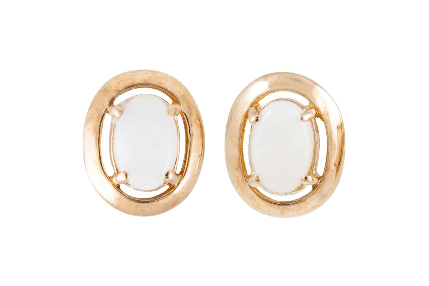A PAIR OF OPAL SET EARRINGS, of oval form, mounted in 9ct gold