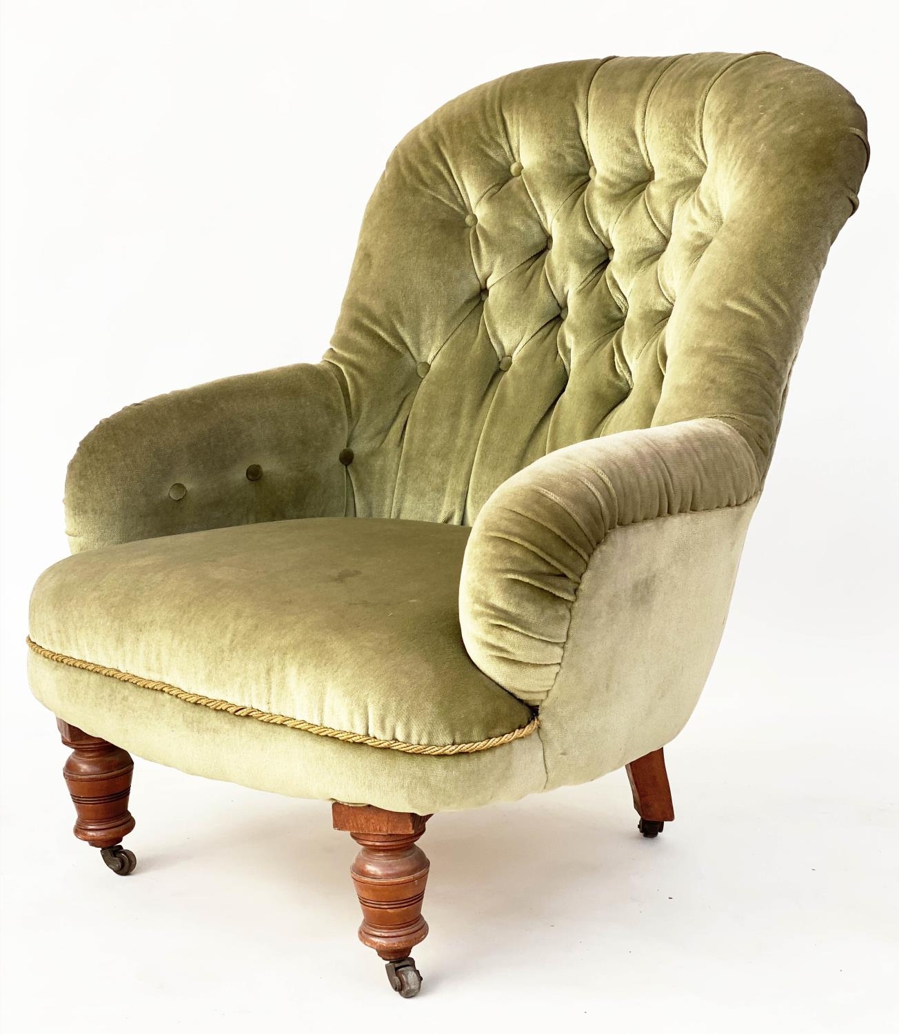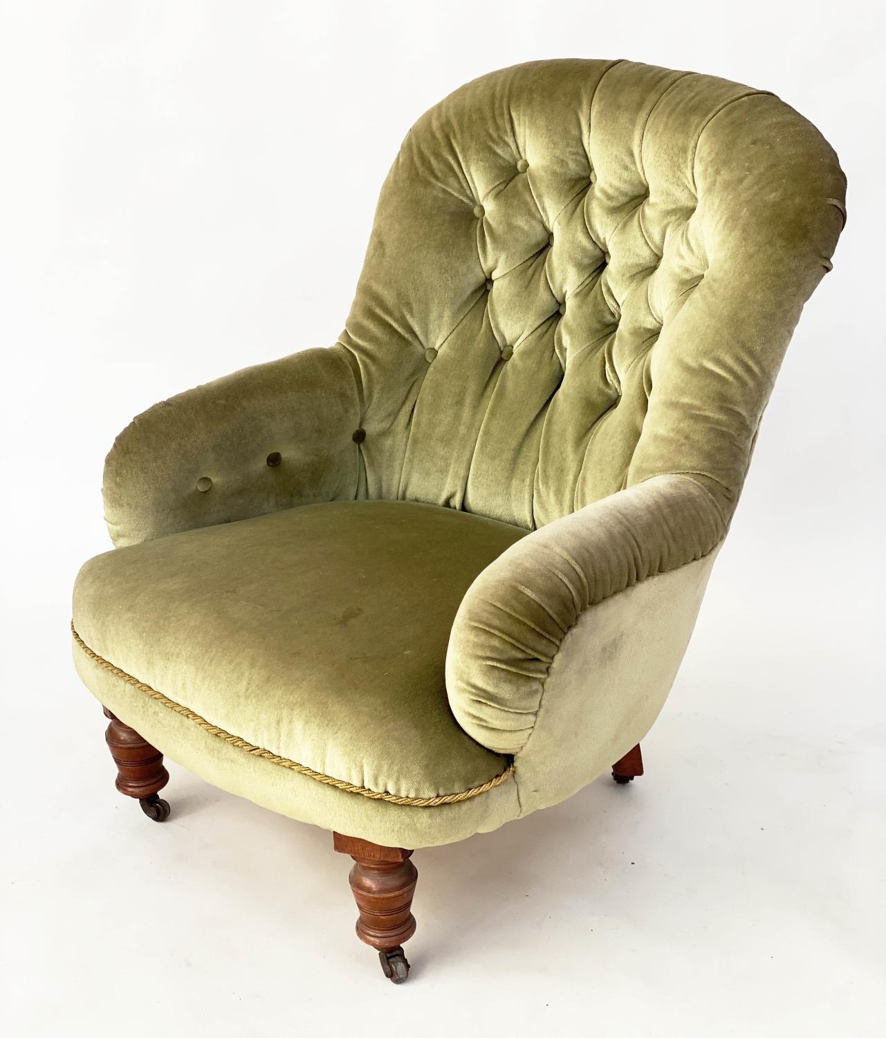 ARMCHAIR, Victorian moss green velvet with button upholstered back and turned supports, 72cm W.