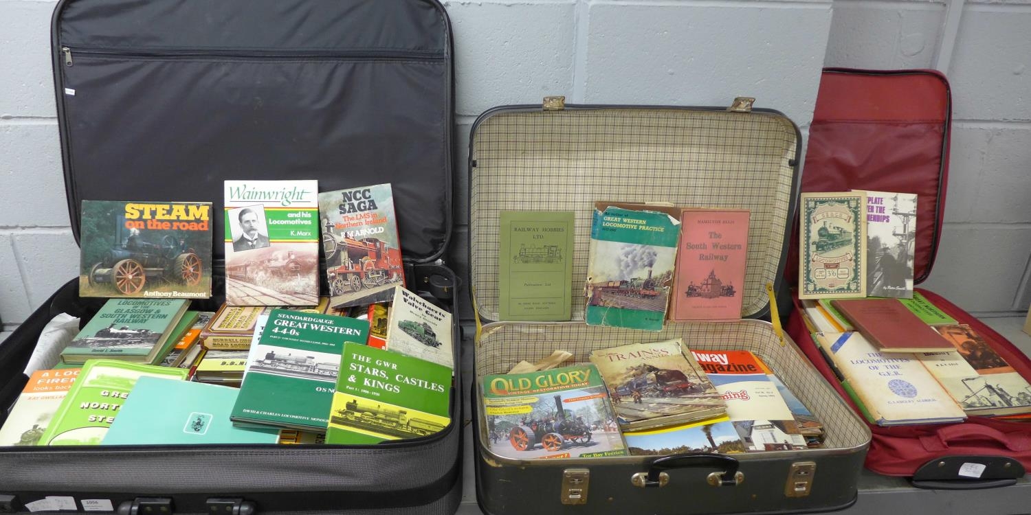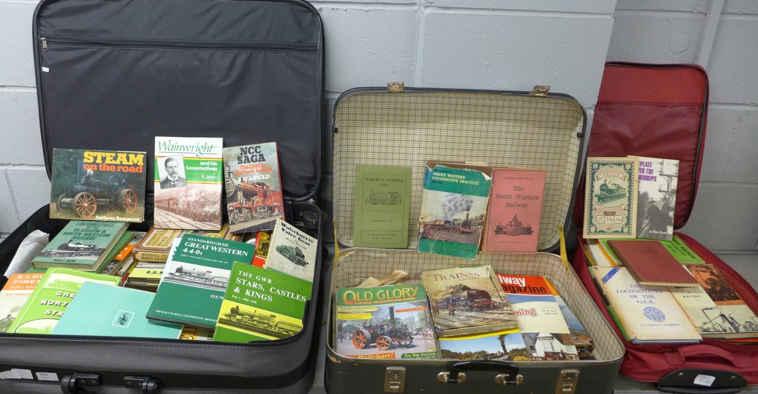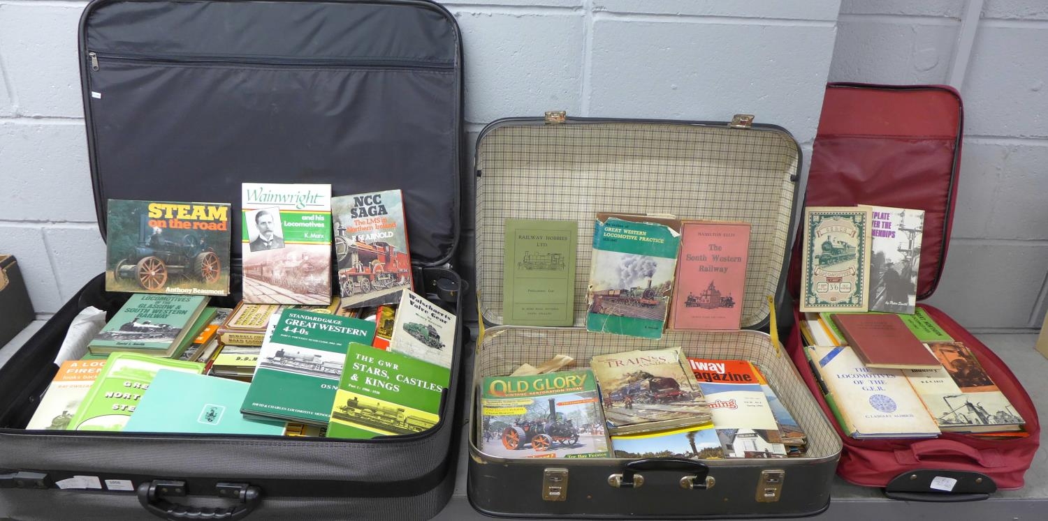 Two suitcases and a small travel case of railway and steam locomotive books and magazines, early to mid 20th Century, including history of railways and traction engines**PLEASE NOTE THIS LOT IS NOT ELIGIBLE FOR POSTING AND PACKING**