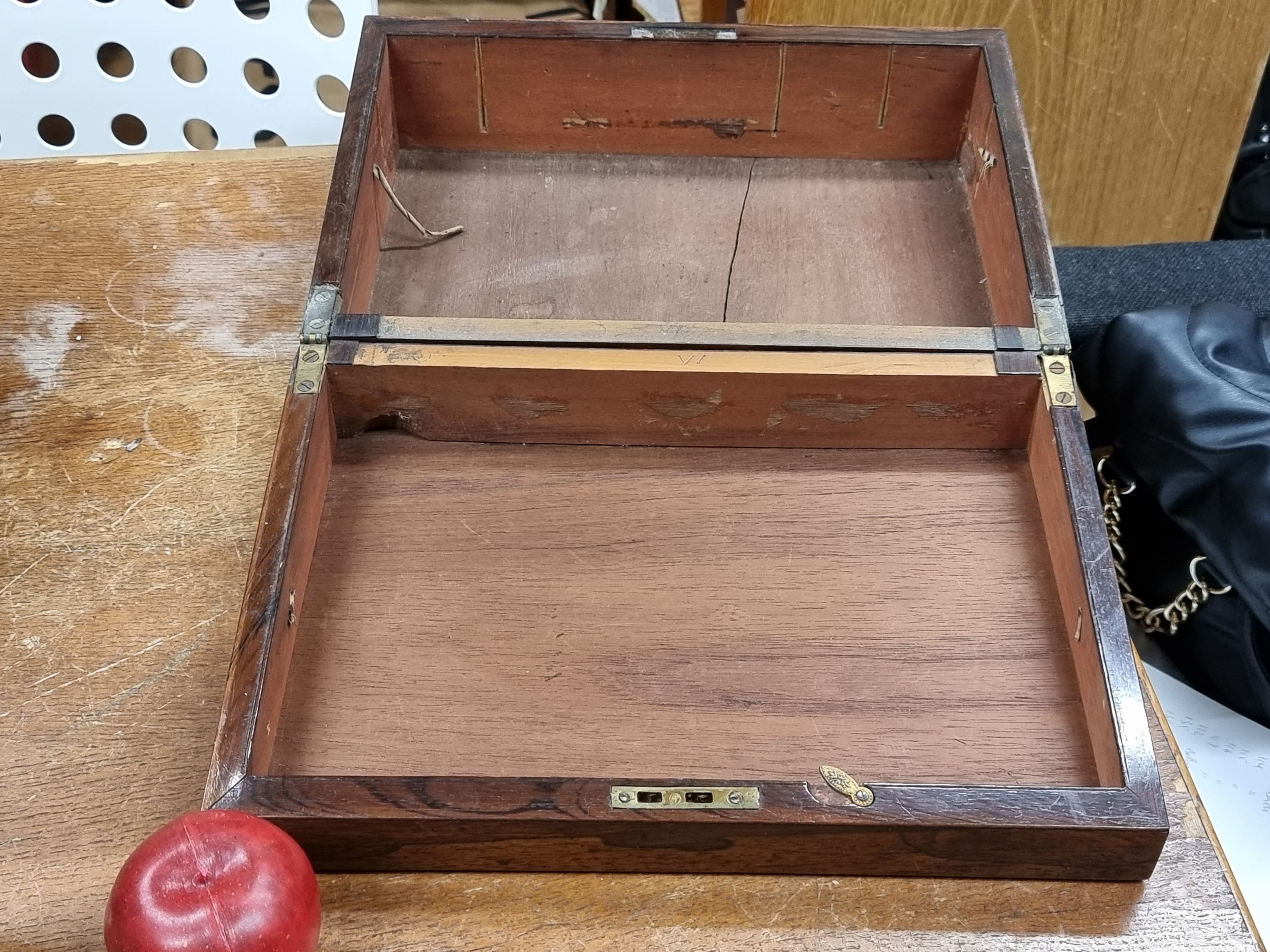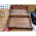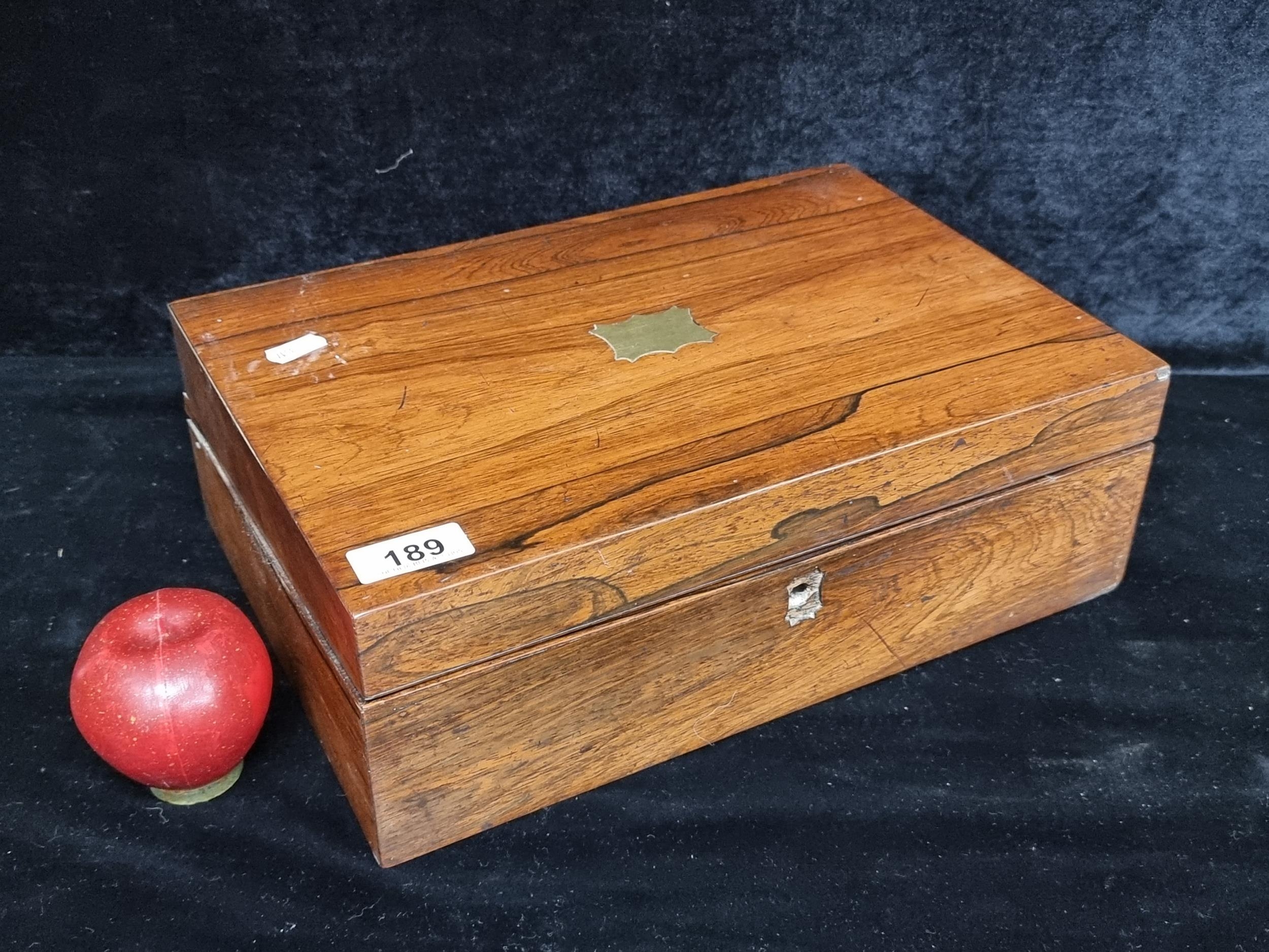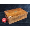 A fabulous vintage solid mahogany storage box with brass fittings. Features a cartouche in the form of a shield to top, hinged lid and angled rim.
