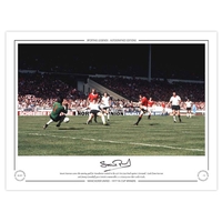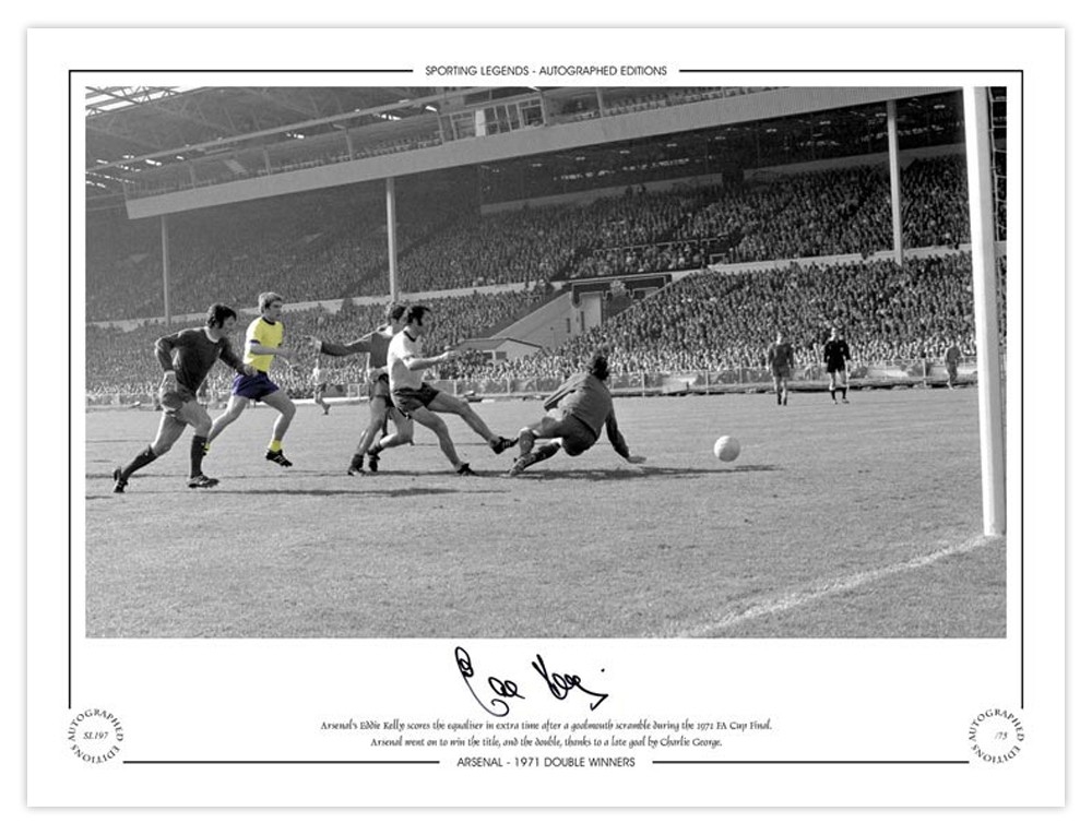 Autographed EDDIE KELLY 1971 Limited-Edition : A superbly produced Limited Edition print measuring 16 x 12, depicting EDDIE KELLY's weak shot on goal somehow avoiding team mate George Graham and Liverpool goalkeeper Ray Clemence, and dribbles over the line - it was the equalising goal in the 1971 FA Cup Final at Wembley and although Graham was initially credited with the goal, TV angles proved that is was Kelly who got the final touch, limited to just 75 editions it has been signed to the lower border in fine black marker.
