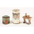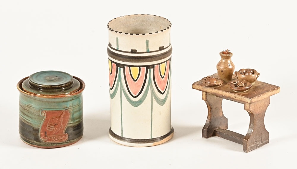 A Wold Studio Pottery Beverley Yorkshire lidded cylindrical dish, together with a slab form table with vase hat and bowls and a hand painted pottery vase. Tallest 15 cm.
